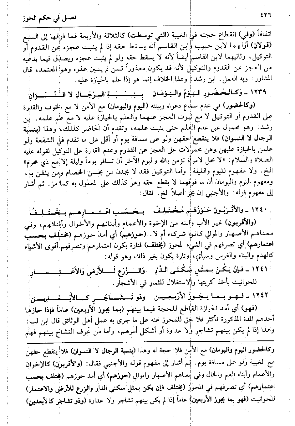 اتِّفَاقًا (وَفِي) انْقِطَاع حجَّته فِي الْغَيْبَة (الَّتِي توسطت) كالثلاثة وَالْأَرْبَعَة فَمَا فَوْقهَا إِلَى السَّبع (قَولَانِ) أَولهمَا لِابْنِ حبيب وَابْن الْقَاسِم أَنه يسْقط حَقه إِذا لم يثبت عَجزه عَن الْقدوم أَو التَّوْكِيل، وَثَانِيهمَا لِابْنِ الْقَاسِم أَيْضا لِأَنَّهُ لَا يسْقط حَقه وَلَو لم يثبت عَجزه وَيصدق فِيمَا يَدعِيهِ من الْعَجز عَن الْقدوم وَالتَّوْكِيل لِأَنَّهُ قد يكون مَعْذُورًا كمن لم يتَبَيَّن عذره وَهُوَ الْمُعْتَمد، قَالَ المشاور: وَبِه الْعَمَل. ابْن رشد: وَهَذَا الْخلاف إِنَّمَا هُوَ إِذا علم بالحيازة عَلَيْهِ. وَكالحُضُورِ اليَوْمُ واليَوْمَانِ بِنِسْبَةِ الرِّجَالِ لَا النِّسْوَانِ (وكالحضور) فِي عدم سَماع دَعْوَاهُ وبينته (الْيَوْم واليومان) مَعَ الْأَمْن لَا مَعَ الْخَوْف وَالْقُدْرَة على الْقدوم أَو التَّوْكِيل لَا مَعَ ثُبُوت الْعَجز عَنْهُمَا وَالْعلم بالحيازة عَلَيْهِ لَا مَعَ عَم علمه. ابْن رشد: وَهُوَ مَحْمُول على عدم الْعلم حَتَّى يثبت علمه، وَتقدم أَن الْحَاضِر كَذَلِك، وَهَذَا (بِنِسْبَة الرِّجَال لَا النسوان) فَلَا يَنْقَطِع حقهن وَلَو على مَسَافَة يَوْم أَو أقل على مَا تقدم فِي الشُّفْعَة وَلَو علِمْنَ بالحيازة عَلَيْهِنَّ وَهن محمولات على الْعَجز عَن الْقدوم وَعدم الْقُدْرَة على التَّوْكِيل لقَوْله عَلَيْهِ الصَّلَاة وَالسَّلَام: (لَا يحل لامْرَأَة تؤمن بِاللَّه وَالْيَوْم الآخر أَن تُسَافِر يَوْمًا وَلَيْلَة إِلَّا مَعَ ذِي محرم) الخ. وَلَا مَفْهُوم لليوم وَاللَّيْلَة. وَأما التَّوْكِيل فقد لَا يجدن من يحسن الْخِصَام وَمن يثقن بِهِ، وَمَفْهُوم الْيَوْم واليومان أَن مَا فَوْقهمَا لَا يقطع حَقه وَهُوَ كَذَلِك على الْمَعْمُول بِهِ كَمَا مرّ. ثمَّ أَشَارَ إِلَى مَفْهُوم قَوْله: وَالْأَجْنَبِيّ إِن يجز أصلا الخ. فَقَالَ: والأقْرَبُونَ حَوْزُهُم مُخْتَلِفُ بحَسَب اعْتمارِهم يَخْتَلِفُ (وَالْأَقْرَبُونَ) غير الْأَب وَابْنه من الْإِخْوَة والأعمام وَأَبْنَائِهِمْ والأخوال وَأَبْنَائِهِمْ، وَفِي معناهم الأصهار والموالي كَانُوا شُرَكَاء أم لَا. (حوزهم) أَي أمد حوزهم (مُخْتَلف بِحَسب اعتمارهم) أَي تصرفهم فِي الشَّيْء المحوز (يخْتَلف) فَتَارَة يكون اعتمارهم وتصرفهم أقوى الْأَشْيَاء كالهدم وَالْبناء وَالْغَرْس وَسَيَأْتِي، وَتارَة يكون بِغَيْر ذَلِك وَهُوَ قَوْله: فإنْ يَكُنْ بمثْلِ سُكْنَى الدَّارِ وَالزَّرْعِ لْلأَرْضِ وَالاَعْتِمارِ للحوانيت بِأخذ أكريتها والاستغلال للثمار فِي الْأَشْجَار. فَهُوَ بِمَا يجَوزُ الأرْبعِين وَذُو تَشَاجُرٍ كالأَبْعَدِين (فَهُوَ) أَي أمد الْحِيَازَة الْقَاطِع للحجة فِيمَا بَينهم (بِمَا يجوز الْأَرْبَعين) عَاما فَإِذا حازها أحدهم الْمدَّة الْمَذْكُورَة فَأكْثر فَلَا حق للمحوز عَنهُ على مَا جرى بِهِ عمل أهل الوثائق قَالَ ابْن لب: وَهَذَا إِذا لم يكن بَينهم تشاجر وَلَا عَدَاوَة أَو أشكل أَمرهم، وَأما من عرف التشاح بَينهم فهم