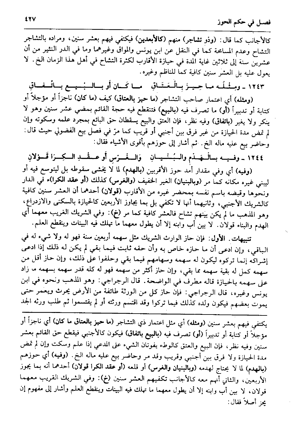 كالأجانب كَمَا قَالَ: (وَذُو تشاجر) مِنْهُم (كالأبعدين) فيكتفي فيهم بِعشر سِنِين، وَمرَاده بالتشاجر التشاح وَعدم الْمُسَامحَة كَمَا فِي النَّقْل عَن ابْن يُونُس والمواق وَغَيرهمَا وَمَا فِي الدّرّ النثير من أَن عشْرين سنة إِلَى ثَلَاثِينَ غَايَة الْمدَّة فِي حِيَازَة الْأَقَارِب لِكَثْرَة التشاح فِي أهل هَذَا الزَّمَان الخ. لَا يعول عَلَيْهِ بل الْعشْر سِنِين كَافِيَة كَمَا للناظم وَغَيره. ومِثْلُه مَا حِيزَ بِالْعَتَاقِ مَا كَان أَو بالبْيع باتِّفاقِ (وَمثله) أَي اعتمار صَاحب التشاجر (مَا حيّز بالعتاق) كَيفَ (مَا كَانَ) ناجزاً أَو مُؤَجّلا أَو كِتَابَة أَو تدبيراً (أَو) مَا تصرف فِيهِ (بِالْبيعِ) فتنقطع فِيهِ حجَّة الْقَائِم بِمُضِيِّ عشر سِنِين وَهُوَ لَا يُنكر وَلَا يُغير (بِاتِّفَاق) وَفِيه نظر فَإِن الْعتْق وَالْبيع يسقطان حق البَائِع بِمُجَرَّد علمه وسكوته وَإِن لم تمض مُدَّة الْحِيَازَة من غير فرق بَين أَجْنَبِي أَو قريب كَمَا مرّ فِي فصل بيع الْفُضُولِيّ حَيْثُ قَالَ: وحاضر بيع عَلَيْهِ مَاله الخ. ثمَّ أَشَارَ إِلَى حوزهم بأقوى الْأَشْيَاء فَقَالَ: وَفِيه بالْهَدْمِ والبُنْيانِ وَالغْرْسِ أَو عقْدِ الكِرَا قَوْلانِ (وَفِيه) أَي وَفِي مِقْدَار أمد حوز الْأَقْرَبين (بالهدم) لما لَا يخْشَى سُقُوطه بل ليتوسع فِيهِ أَو ليبني غَيره مَكَانَهُ كَمَا مر (وبالبنيان) الْغَيْر الْخَفِيف (وَالْغَرْس) كَذَلِك (أَو عقد الكرا) ء فِي الدَّار وَنَحْوهَا وَقَبضه باسم نَفسه بِمحضر غَيره من الْأَقَارِب (قَولَانِ) أَحدهمَا أَن الْعشْر سِنِين كَافِيَة كالشريك الْأَجْنَبِيّ، وَثَانِيهمَا أَنَّهَا لَا تَكْفِي بل بِمَا يُجَاوز الْأَرْبَعين كالحيازة بِالسُّكْنَى والازدراع، وَهُوَ الْمَذْهَب مَا لم يكن بَينهم تشاح فالعشر كَافِيَة كَمَا مر (خَ) : وَفِي الشَّرِيك الْغَرِيب مَعَهُمَا أَي الْهدم وَالْبناء قَولَانِ. لَا بَين أَب وَابْنه إِلَّا أَن يطول مَعَهُمَا مَا تهْلك فِيهِ الْبَينَات وَيَنْقَطِع الْعلم. تَنْبِيهَات. الأول: فَإِن حَاز الْوَارِث الشَّرِيك مثل سَهْمه أَرْبَعِينَ سنة فَهُوَ لَهُ وَلَا شَيْء لَهُ فِي الْبَاقِي، وَإِن ادّعى أَن مَا حازه خَاص بِهِ وَأَن حَقه ثَابت فِيمَا بَقِي لم يكن لَهُ ذَلِك إِذا ادّعى إشراكه إِنَّمَا تَرَكُوهُ ليَكُون لَهُ سَهْمه وسهامهم فِيمَا بَقِي وحلفوا على ذَلِك، وَإِن حَاز أقل من سَهْمه كمل لَهُ بَقِيَّة سَهْمه مِمَّا بَقِي، وَإِن حَاز أَكثر من سَهْمه فَهُوَ لَهُ كُله قدر سَهْمه بسهمه مَا زَاد على سَهْمه بالحيازة قَالَه مطرف فِي الْوَاضِحَة. قَالَ الرجراجي: وَهُوَ الْمَذْهَب وَنَحْوه فِي ابْن يُونُس وَغَيره، قَالَ الرجراجي: فَإِن حَاز كل من الْوَرَثَة طَائِفَة من الأَرْض يحرث ويعمر حَتَّى يَمُوت بَعضهم فَيكون وَلَده كَذَلِك فِيمَا تركُوا وَقد اقتسم ورثته أَو لم يقتسموا ثمَّ طلب وَرثهُ الْجد