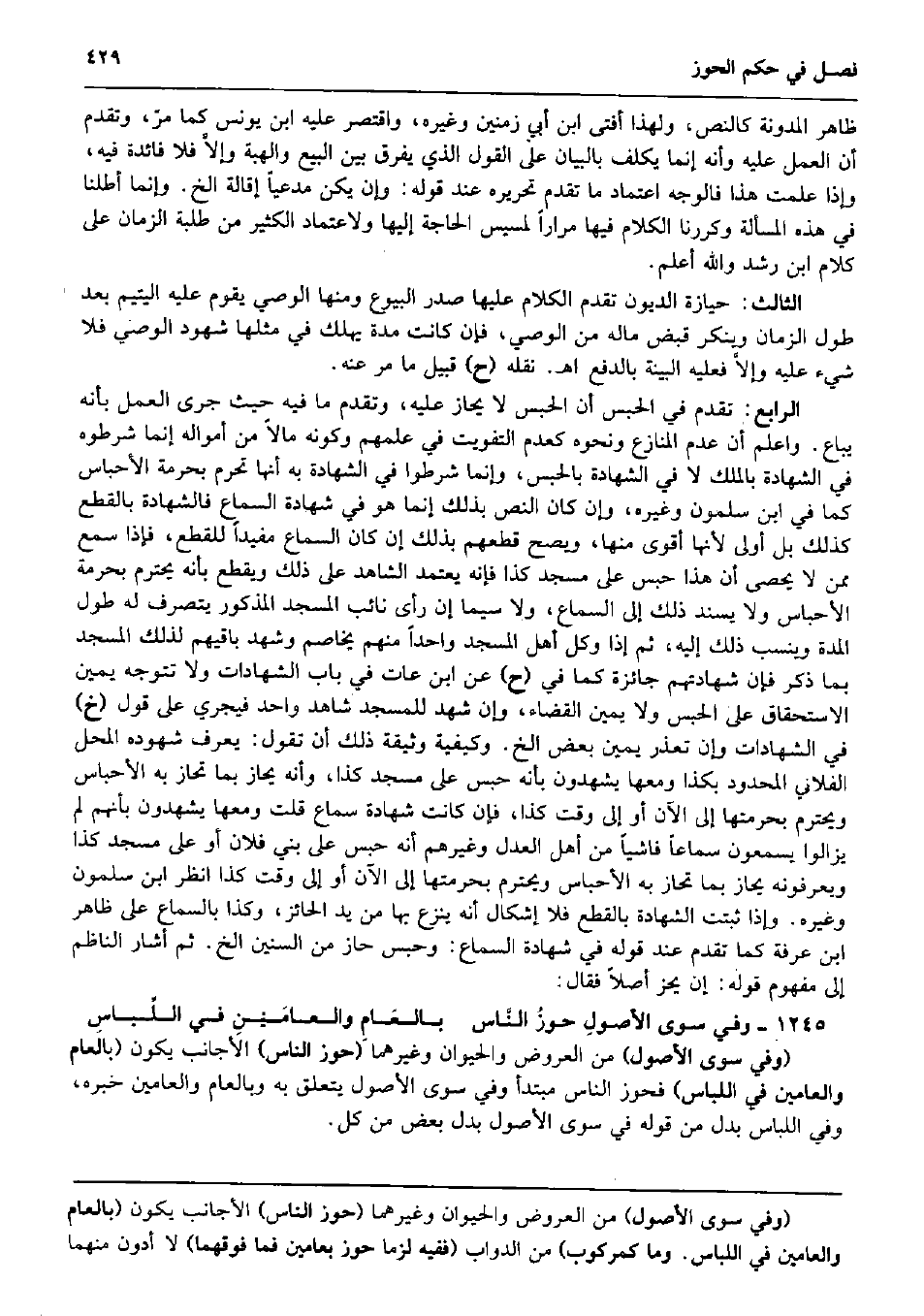 ظَاهر الْمُدَوَّنَة كالنص، وَلِهَذَا أفتى ابْن أبي زمنين وَغَيره، وَاقْتصر عَلَيْهِ ابْن يُونُس كَمَا مرّ، وَتقدم أَن الْعَمَل عَلَيْهِ وَأَنه إِنَّمَا يُكَلف بِالْبَيَانِ على القَوْل الَّذِي يفرق بَين البيع وَالْهِبَة وإلاَّ فَلَا فَائِدَة فِيهِ، وَإِذا علمت هَذَا فَالْوَجْه اعْتِمَاد مَا تقدم تحريره عِنْد قَوْله: وَإِن يكن مُدعيًا إِقَالَة الخ. وَإِنَّمَا أطلنا فِي هَذِه الْمَسْأَلَة وكررنا الْكَلَام فِيهَا مرَارًا لمسيس الْحَاجة إِلَيْهَا ولاعتماد الْكثير من طلبة الزَّمَان على كَلَام ابْن رشد وَالله أعلم. الثَّالِث: حِيَازَة الدُّيُون تقدم الْكَلَام عَلَيْهَا صدر الْبيُوع وَمِنْهَا الْوَصِيّ يقوم عَلَيْهِ الْيَتِيم بعد طول الزَّمَان وينكر قبض مَاله من الْوَصِيّ، فَإِن كَانَت مُدَّة يهْلك فِي مثلهَا شُهُود الْوَصِيّ فَلَا شَيْء عَلَيْهِ وإلاَّ فَعَلَيهِ الْبَيِّنَة بِالدفع اه. نَقله (ح) قبيل مَا مر عَنهُ. الرَّابِع: تقدم فِي الْحَبْس أَن الْحَبْس لَا يحاز عَلَيْهِ، وَتقدم مَا فِيهِ حَيْثُ جرى الْعَمَل بِأَنَّهُ يُبَاع. وَاعْلَم أَن عدم المنازع وَنَحْوه كَعَدم التفويت فِي علمهمْ وَكَونه مَالا من أَمْوَاله إِنَّمَا شرطوه فِي الشَّهَادَة بِالْملكِ لَا فِي الشَّهَادَة بِالْحَبْسِ، وَإِنَّمَا شرطُوا فِي الشَّهَادَة بِهِ أَنَّهَا تحرم بِحرْمَة الأحباس كَمَا فِي ابْن سَلمُون وَغَيره، وَإِن كَانَ النَّص بذلك إِنَّمَا هُوَ فِي شَهَادَة السماع فالشهادة بِالْقطعِ كَذَلِك بل أولى لِأَنَّهَا أقوى مِنْهَا، وَيصِح قطعهم بذلك إِن كَانَ السماع مُفِيدا للْقطع، فَإِذا سمع مِمَّن لَا يُحْصى أَن هَذَا حبس على مَسْجِد كَذَا فَإِنَّهُ يعْتَمد الشَّاهِد على ذَلِك وَيقطع بِأَنَّهُ يحترم بِحرْمَة الأحباس وَلَا يسند ذَلِك إِلَى السماع، وَلَا سِيمَا إِن رأى نَائِب الْمَسْجِد الْمَذْكُور يتَصَرَّف لَهُ طول الْمدَّة وينسب ذَلِك إِلَيْهِ، ثمَّ إِذا وكل أهل الْمَسْجِد وَاحِدًا مِنْهُم يُخَاصم وَشهد باقيهم لذَلِك الْمَسْجِد بِمَا ذكر فَإِن شَهَادَتهم جَائِزَة كَمَا فِي (ح) عَن ابْن عَاتٍ فِي بَاب الشَّهَادَات وَلَا تتَوَجَّه يَمِين الِاسْتِحْقَاق على الْحَبْس وَلَا يَمِين الْقَضَاء، وَإِن شهد لِلْمَسْجِدِ شَاهد وَاحِد فَيجْرِي على قَول (خَ) فِي الشَّهَادَات وَإِن تعذر يَمِين بعض الخ. وَكَيْفِيَّة وَثِيقَة ذَلِك أَن تَقول: يعرف شُهُوده الْمحل الْفُلَانِيّ الْمَحْدُود بِكَذَا وَمَعَهَا يشْهدُونَ بِأَنَّهُ حبس على مَسْجِد كَذَا، وَأَنه يحاز بِمَا تحاز بِهِ الأحباس ويحترم بحرمتها إِلَى الْآن أَو إِلَى وَقت كَذَا، فَإِن كَانَت شَهَادَة سَماع قلت وَمَعَهَا يشْهدُونَ بِأَنَّهُم لم يزَالُوا يسمعُونَ سَمَاعا فاشياً من أهل الْعدْل وَغَيرهم أَنه حبس على بني فلَان أَو على مَسْجِد كَذَا ويعرفونه يحاز بِمَا تحاز بِهِ الأحباس ويحترم بحرمتها إِلَى الْآن أَو إِلَى وَقت كَذَا انْظُر ابْن سَلمُون وَغَيره. وَإِذا ثبتَتْ الشَّهَادَة بِالْقطعِ فَلَا إِشْكَال أَنه ينْزع بهَا من يَد الْحَائِز، وَكَذَا بِالسَّمَاعِ على ظَاهر ابْن عَرَفَة كَمَا تقدم عِنْد قَوْله فِي شَهَادَة السماع: وَحبس حَاز من السنين الخ. ثمَّ أَشَارَ النَّاظِم إِلَى مَفْهُوم قَوْله: إِن يحز أصلا فَقَالَ: وَفِي سوى الأصولِ حوزُ النَّاس بالعَامِ والعامَيْنِ فِي اللِّباسِ (وَفِي سوى الْأُصُول) من الْعرُوض وَالْحَيَوَان وَغَيرهمَا (حوز النَّاس) الْأَجَانِب يكون (بِالْعَام والعامين فِي اللبَاس) فحوز النَّاس مُبْتَدأ وَفِي سوى الْأُصُول يتَعَلَّق بِهِ وبالعام والعامين خَبره، وَفِي اللبَاس بدل من قَوْله فِي سوى الْأُصُول بدل بعض من كل.