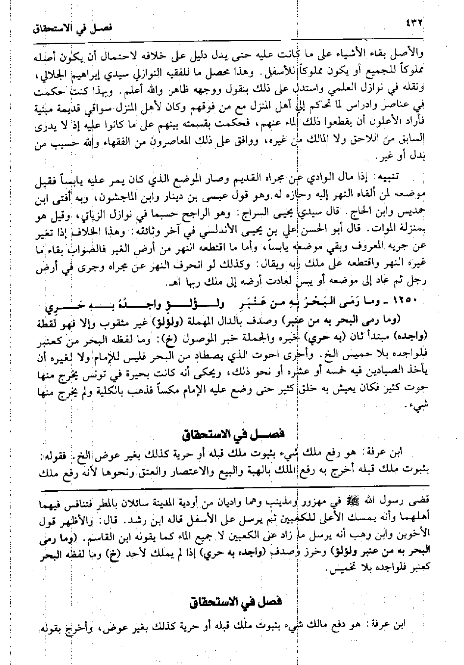 وَالْأَصْل بَقَاء الْأَشْيَاء على مَا كَانَت عَلَيْهِ حَتَّى يدل دَلِيل على خِلَافه لاحْتِمَال أَن يكون أَصله مَمْلُوكا للْجَمِيع أَو يكون مَمْلُوكا للأسفل. وَهَذَا مُحَصل مَا للفقيه النوازلي سَيِّدي إِبْرَاهِيم الجلالي، وَنَقله فِي نَوَازِل العلمي وَاسْتدلَّ على ذَلِك بنقول وَوَجهه ظَاهر وَالله أعلم. وَبِهَذَا كنت حكمت فِي عناصر وادراس لما تحاكم إِلَيّ أهل الْمنزل مَعَ من فَوْقهم وَكَانَ لأهل الْمنزل سواقي قديمَة مَبْنِيَّة فَأَرَادَ الأعلون أَن يقطعوا ذَلِك المَاء عَنْهُم، فحكمت بقسمته بَينهم على مَا كَانُوا عَلَيْهِ إِذْ لَا يدرى السَّابِق من اللَّاحِق وَلَا الْمَالِك من غَيره، وَوَافَقَ على ذَلِك المعاصرون من الْفُقَهَاء وَالله حسيب من بدل أَو غير. تَنْبِيه: إِذا مَال الْوَادي عَن مجْرَاه الْقَدِيم وَصَارَ الْموضع الَّذِي كَانَ يمر عَلَيْهِ يَابسا فَقيل مَوْضِعه لمن أَلْقَاهُ النَّهر إِلَيْهِ وحازه لَهُ وَهُوَ قَول عِيسَى بن دِينَار وَابْن الْمَاجشون، وَبِه أفتى ابْن حمديس وَابْن الْحَاج. قَالَ سَيِّدي يحيى السراج: وَهُوَ الرَّاجِح حَسْبَمَا فِي نَوَازِل الزياتي، وَقيل هُوَ بِمَنْزِلَة الْموَات. قَالَ أَبُو الْحسن عَليّ بن يحيى الأندلسي فِي آخر وثائقه: وَهَذَا الْخلاف إِذا تغير عَن جريه الْمَعْرُوف وَبَقِي مَوْضِعه يَابسا، وَأما مَا اقتطعه النَّهر من أَرض الْغَيْر فَالصَّوَاب بَقَاء مَا غَيره النَّهر واقتطعه على ملك ربه وَيُقَال: وَكَذَلِكَ لَو انحرف النَّهر عَن مجْرَاه وَجرى فِي أَرض رجل ثمَّ عَاد إِلَى مَوْضِعه أَو يبس لعادت أرضه إِلَى ملك رَبهَا اه. وَمَا رَمَى البَحْرُ بهِ من عَنْبَرِ ولؤْلؤٍ واجدُهُ بهِ حَرِي (وَمَا رمى الْبَحْر بِهِ من عنبر) وصدف بِالدَّال الْمُهْملَة (ولؤلؤ) غير مثقوب وَإِلَّا فَهُوَ لقطَة (واجده) مُبْتَدأ ثَان (بِهِ حري) خَبره وَالْجُمْلَة خبر الْمَوْصُول (خَ) : وَمَا لَفظه الْبَحْر من كعنبر فلواجده بِلَا تخميس الخ. وَأَحْرَى الْحُوت الَّذِي يصطاد من الْبَحْر فَلَيْسَ للْإِمَام وَلَا لغيره أَن يَأْخُذ الصيادين فِيهِ خمسه أَو عشره أَو نَحْو ذَلِك، ويحكى أَنه كَانَت بحيرة فِي تونس يخرج مِنْهَا حوت كثير فَكَانَ يعِيش بِهِ خلق كثير حَتَّى وضع عَلَيْهِ الإِمَام مكساً فَذهب بِالْكُلِّيَّةِ وَلم يخرج مِنْهَا شَيْء.