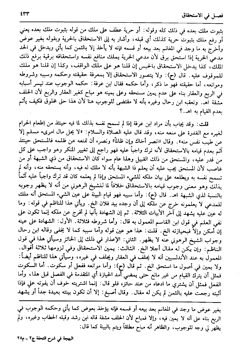 بِثُبُوت ملك بعده فِي ذَلِك كُله وَقَوله: أَو حريَّة عطف على ملك من قَوْله بِثُبُوت ملك بعده يَعْنِي أَو رفع ملك بِثُبُوت حريَّة كَذَلِك أَي قبله، وَأَشَارَ بِهِ إِلَى الِاسْتِحْقَاق بِالْحُرِّيَّةِ وَبِقَوْلِهِ بِغَيْر عوض وَأخرج بِهِ مَا وجد فِي الْمَغَانِم بعد بَيْعه أَو قسمه فَإِنَّهُ لَا يَأْخُذ إِلَّا بِالثّمن كَمَا يَأْتِي وَيدخل فِي الْحَد مدعي الْحُرِّيَّة إِذا اسْتحق برق لِأَن مدعي الْحُرِّيَّة يملك مَنَافِع نَفسه واستحقاقه برقية بِرَفْع ذَلِك الْملك، كَذَا يدْخل الِاسْتِحْقَاق بِالْحَبْسِ إِن قُلْنَا هُوَ على ملك الْوَاقِف، وَكَذَا إِن قُلْنَا هُوَ ملك للْمَوْقُوف عَلَيْهِ. قَالَ (ح) : وَلَا يتَصَوَّر الِاسْتِحْقَاق إِلَّا بِمَعْرِِفَة حَقِيقَته وَحكمه وَسَببه وشروطه وموانعه، أما حَقِيقَته فَهُوَ مَا ذكر، وَأما حكمه فَقَالَ ابْن عَرَفَة: حكمه الْوُجُوب عِنْد تيَسّر أَسبَابه فِي الرّبع وَالْعَقار بِنَاء على عدم يَمِين مُسْتَحقّه وعَلى يَمِينه هُوَ مُبَاح كَغَيْر الْعقار وَالرّبع لِأَن الْحلف مشقة اه. وَتعقبه ابْن رحال وَغَيره بِأَنَّهُ لَا مُقْتَضى للْوُجُوب هُنَا لِأَن هَذَا حق مَخْلُوق فَكيف يَأْثَم بِعَدَمِ الْقيام بِهِ اه.؟ قلت: وَقد يُجَاب بِأَن مُرَاد ابْن عَرَفَة إِذا لم تسمح نَفسه بذلك لما فِيهِ حِينَئِذٍ من إطْعَام الْحَرَام لغيره مَعَ الْقُدْرَة على مَنعه مِنْهُ، وَقد قَالَ عَلَيْهِ الصَّلَاة وَالسَّلَام: (لَا يحل مَال امرىء مُسلم إِلَّا عَن طيب نفس مِنْهُ) . وَقَالَ (انصر أَخَاك وَإِن ظَالِما) وَنَصره أَن تَمنعهُ عَن ظلمه فالمستحق حِينَئِذٍ آثم بِعَدَمِ قِيَامه بِالِاسْتِحْقَاقِ لِأَنَّهُ ترك وَاجِبا عَلَيْهِ فَهُوَ رَاجع إِلَى تَغْيِير الْمُنكر وَهُوَ وَاجِب على كل من قدر عَلَيْهِ، والمستحق من ذَلِك الْقَبِيل وَهَذَا عَام سَوَاء كَانَ الِاسْتِحْقَاق من ذِي الشُّبْهَة أَو من غَاصِب لِأَن الْمُسْتَحق يجب عَلَيْهِ أَن يعلم ذَا الشُّبْهَة بِأَنَّهُ لَا ملك لَهُ فِيهِ، وَأَنه يسْتَحقّهُ مِنْهُ، وَأَنه لم تسمح نَفسه بِهِ ويطلعه على بَيَان ملكه للشَّيْء الْمُسْتَحق وَإِذا لم يُعلمهُ كَانَ قد ترك وَاجِبا عَلَيْهِ آثِما بذلك وَهُوَ معنى وجوب قِيَامه بِالِاسْتِحْقَاقِ خلافًا لما للشَّيْخ الرهوني من أَنه لَا يظْهر وُجُوبه بِالنِّسْبَةِ لذِي الشُّبْهَة اه. قَالَ (ح) : وَأما سَببه فَهُوَ قيام الْبَيِّنَة على عين الشَّيْء الْمُسْتَحق أَنه ملك للْمُدَّعِي لَا يعلمونه خرج عَن ملكه إِلَى أَن وجده بيد فلَان الخ. وَيَأْتِي هَذَا للناظم فِي قَوْله: وَمَا لَهُ عين عَلَيْهِ يشْهد إِلَى آخر الأبيات الثَّلَاثَة. ثمَّ إِن الشَّهَادَة بِأَنَّهَا لم تخرج عَن ملكه إِنَّمَا تكون على نفي الْعلم فِي قَول ابْن الْقَاسِم الْمَعْمُول بِهِ قَالَ: وَأما شُرُوطه فَثَلَاثَة. الأول: الشَّهَادَة على عينه إِن أمكن وإلاَّ فبحيازته الخ. قلت: هَذَا هُوَ عين قَوْله وَأما سَببه كَمَا لَا يخفى وَقَالَهُ ابْن رحال وَجَوَاب الشَّيْخ الرهوني عَنهُ لَا يظْهر. الثَّانِي: الْإِعْذَار فِي ذَلِك إِلَى الْحَائِز وَسَيَأْتِي هَذَا فِي قَول النَّاظِم: وَإِن يكن لَهُ مقَال أَََجَلًا الخ. الثَّالِث: يَمِين الِاسْتِحْقَاق وَفِي لُزُومهَا ثَلَاثَة أَقْوَال. الْمَعْمُول بِهِ عِنْد الأندلسيين أَنه لَا يحلف فِي الْعقار وَيحلف فِي غَيره، وَسَيَأْتِي هَذَا للناظم أَيْضا: وَلَا يَمِين فِي أصُول مَا اسْتحق الخ. ثمَّ قَالَ (ح) : وَأما موانعه فَفعل أَو سكُوت. أما السُّكُوت فَمثل أَن يتْرك الْقيام من غير مَانع حَتَّى يمْضِي أمد الْحِيَازَة أَي الْمُتَقَدّمَة فِي الْفَصْل قبل هَذَا، وَأما الْفِعْل فَمثل أَن يَشْتَرِي مَا ادَّعَاهُ من عِنْد حائزه فَلَو قَالَ: إِنَّمَا اشْتَرَيْته خوف أَن يفوتهُ عَليّ فَإِذا أثْبته رجعت عَلَيْهِ بِالثّمن لم يكن لَهُ مقَال. 