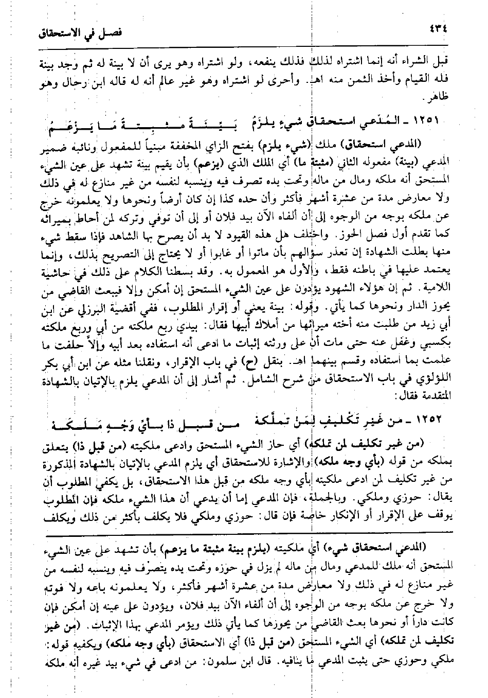 قبل الشِّرَاء أَنه إِنَّمَا اشْتَرَاهُ لذَلِك فَذَلِك يَنْفَعهُ، وَلَو اشْتَرَاهُ وَهُوَ يرى أَن لَا بَيِّنَة لَهُ ثمَّ وجد بَيِّنَة فَلهُ الْقيام وَأخذ الثّمن مِنْهُ اه. وَأَحْرَى لَو اشْتَرَاهُ وَهُوَ غير عَالم أَنه لَهُ قَالَه ابْن رحال وَهُوَ ظَاهر. المُدّعي اسْتِحْقَاق شيءٍ يلزَمُ بَيِّنَةً مثبِتةً مَا يَزْعَمُ (الْمُدَّعِي اسْتِحْقَاق) ملك (شَيْء يلْزم) بِفَتْح الزَّاي المخففة مَبْنِيا للْمَفْعُول ونائبه ضمير الْمُدَّعِي (بَيِّنَة) مَفْعُوله الثَّانِي (مثبتة مَا) أَي الْملك الَّذِي (يزْعم) بِأَن يُقيم بَيِّنَة تشهد على عين الشَّيْء الْمُسْتَحق أَنه ملكه وَمَال من مَاله وَتَحْت يَده تصرف فِيهِ وينسبه لنَفسِهِ من غير مُنَازع لَهُ فِي ذَلِك وَلَا معَارض مُدَّة من عشرَة أشهر فَأكْثر وَأَن حَده كَذَا إِن كَانَ أَرضًا وَنَحْوهَا وَلَا يعلمونه خرج عَن ملكه بِوَجْه من الْوُجُوه إِلَى أَن ألفاه الْآن بيد فلَان أَو إِلَى أَن توفّي وَتَركه لمن أحَاط بميراثه كَمَا تقدم أول فصل الْحَوْز. وَاخْتلف هَل هَذِه الْقُيُود لَا بُد أَن يُصَرح بهَا الشَّاهِد فَإِذا سقط شَيْء مِنْهَا بطلت الشَّهَادَة إِن تعذر سُؤَالهمْ بِأَن مَاتُوا أَو غَابُوا أَو لَا يحْتَاج إِلَى التَّصْرِيح بذلك، وَإِنَّمَا يعْتَمد عَلَيْهَا فِي بَاطِنه فَقَط، وَالْأول هُوَ الْمَعْمُول بِهِ. وَقد بسطنا الْكَلَام على ذَلِك فِي حَاشِيَة اللامية. ثمَّ إِن هَؤُلَاءِ الشُّهُود يؤدون على عين الشَّيْء الْمُسْتَحق إِن أمكن وَإِلَّا فيبعث القَاضِي من يحوز الدَّار وَنَحْوهَا كَمَا يَأْتِي. وَقَوله: بَيِّنَة يَعْنِي أَو إِقْرَار الْمَطْلُوب، فَفِي أقضية الْبُرْزُليّ عَن ابْن أبي زيد من طلبت مِنْهُ أُخْته مِيرَاثهَا من أَمْلَاك أَبِيهَا فَقَالَ: بيَدي ربع ملكته من أبي وَربع ملكته بكسبي وغفل عَنهُ حَتَّى مَاتَ أَن على ورثته إِثْبَات مَا ادّعى أَنه استفاده بعد أَبِيه وإلاَّ حَلَفت مَا علمت بِمَا استفاده وَقسم بَينهمَا اه. بِنَقْل (ح) فِي بَاب الْإِقْرَار، ونقلنا مثله عَن ابْن أبي بكر اللؤْلُؤِي فِي بَاب الِاسْتِحْقَاق من شرح الشَّامِل. ثمَّ أَشَارَ إِلَى أَن الْمُدَّعِي يلْزم بالإتيان بِالشَّهَادَةِ الْمُتَقَدّمَة فَقَالَ: من غَيْرِ تَكْليفٍ لِمَنْ تملَّكهْ من قبل ذَا بأيِّ وَجْهٍ مَلَكَهْ (من غير تَكْلِيف لمن تملكه) أَي حَاز الشَّيْء الْمُسْتَحق وَادّعى ملكيته (من قبل ذَا) يتَعَلَّق بِملكه من قَوْله (بِأَيّ وَجه ملكه) وَالْإِشَارَة للاستحقاق أَي يلْزم الْمُدَّعِي بالإتيان بِالشَّهَادَةِ الْمَذْكُورَة من غير تَكْلِيف لمن ادّعى ملكيته بِأَيّ وَجه ملكه من قبل هَذَا الِاسْتِحْقَاق، بل يَكْفِي الْمَطْلُوب أَن يُقَال: حوزي وملكي. وَبِالْجُمْلَةِ، فَإِن الْمُدَّعِي إِمَّا أَن يَدعِي أَن هَذَا الشَّيْء ملكه فَإِن الْمَطْلُوب يُوقف على الْإِقْرَار أَو الْإِنْكَار خَاصَّة فَإِن قَالَ: حوزي وملكي فَلَا يُكَلف بِأَكْثَرَ من ذَلِك ويكلف الْمُدَّعِي بالإتيان بِالشَّهَادَةِ الْمُتَقَدّمَة فَقَط، وَإِمَّا أَن يَدعِي أَنه ملك جده مثلا فَإِن الْمَطْلُوب لَا يُوقف على الْإِقْرَار وَالْإِنْكَار حَتَّى يثبت الْمُدَّعِي موت جده وإراثته فَإِن أثبت ذَلِك وقف الْمَطْلُوب على الْإِقْرَار وَالْإِنْكَار أَيْضا، فَإِن قَالَ: حوزي وملكي فَلَا يُكَلف بِأَكْثَرَ من ذَلِك ويكلف
