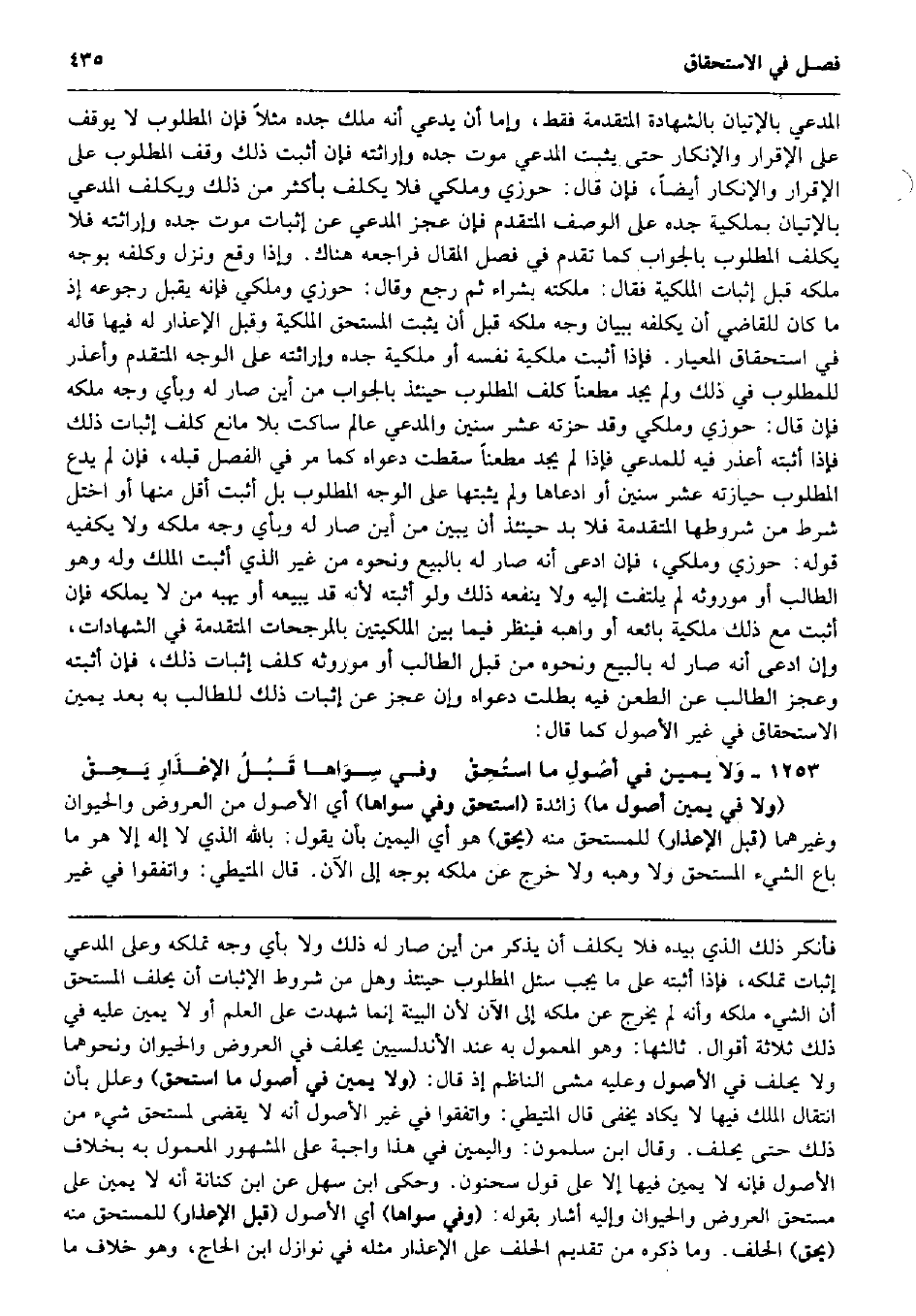 الْمُدَّعِي بالإتيان بملكية جده على الْوَصْف الْمُتَقَدّم فَإِن عجز الْمُدَّعِي عَن إِثْبَات موت جده وإراثته فَلَا يُكَلف الْمَطْلُوب بِالْجَوَابِ كَمَا تقدم فِي فصل الْمقَال فَرَاجعه هُنَاكَ. وَإِذا وَقع وَنزل وكلفه بِوَجْه ملكه قبل إِثْبَات الملكية فَقَالَ: ملكته بشرَاء ثمَّ رَجَعَ وَقَالَ: حوزي وملكي فَإِنَّهُ يقبل رُجُوعه إِذْ مَا كَانَ للْقَاضِي أَن يكلفه بِبَيَان وَجه ملكه قبل أَن يثبت الْمُسْتَحق الملكية وَقبل الْإِعْذَار لَهُ فِيهَا قَالَه فِي اسْتِحْقَاق المعيار. فَإِذا أثبت ملكية نَفسه أَو ملكية جده وإراثته على الْوَجْه الْمُتَقَدّم وأعذر للمطلوب فِي ذَلِك وَلم يجد مطعناً كلف الْمَطْلُوب حِينَئِذٍ بِالْجَوَابِ من أَيْن صَار لَهُ وَبِأَيِّ وَجه ملكه فَإِن قَالَ: حوزي وملكي وَقد حُزْته عشر سِنِين وَالْمُدَّعِي عَالم سَاكِت بِلَا مَانع كلف إِثْبَات ذَلِك فَإِذا أثْبته أعذر فِيهِ للْمُدَّعِي فَإِذا لم يجد مطعناً سَقَطت دَعْوَاهُ كَمَا مر فِي الْفَصْل قبله، فَإِن لم يدع الْمَطْلُوب حيازته عشر سِنِين أَو ادَّعَاهَا وَلم يثبتها على الْوَجْه الْمَطْلُوب بل أثبت أقل مِنْهَا أَو اخْتَلَّ شَرط من شُرُوطهَا الْمُتَقَدّمَة فَلَا بُد حِينَئِذٍ أَن يبين من أَيْن صَار لَهُ وَبِأَيِّ وَجه ملكه وَلَا يَكْفِيهِ قَوْله: حوزي وملكي، فَإِن ادّعى أَنه صَار لَهُ بِالْبيعِ وَنَحْوه من غير الَّذِي أثبت الْملك وَله وَهُوَ الطَّالِب أَو موروثه لم يلْتَفت إِلَيْهِ وَلَا يَنْفَعهُ ذَلِك وَلَو أثْبته لِأَنَّهُ قد يَبِيعهُ أَو يَهبهُ من لَا يملكهُ فَإِن أثبت مَعَ ذَلِك ملكية بَائِعه أَو واهبه فَينْظر فِيمَا بَين الملكيتين بالمرجحات الْمُتَقَدّمَة فِي الشَّهَادَات، وَإِن ادّعى أَنه صَار لَهُ بِالْبيعِ وَنَحْوه من قبل الطَّالِب أَو موروثه كلف إِثْبَات ذَلِك، فَإِن أثْبته وَعجز الطَّالِب عَن الطعْن فِيهِ بطلت دَعْوَاهُ وَإِن عجز عَن إِثْبَات ذَلِك للطَّالِب بِهِ بعد يَمِين الِاسْتِحْقَاق فِي غير الْأُصُول كَمَا قَالَ: وَلا يَمِين فِي أصُولِ مَا استُحِقْ وَفِي سِوَاها قَبُلُ الإعْذَارِ يَحِقْ (وَلَا فِي يَمِين أصُول مَا) زَائِدَة (اسْتحق وَفِي سواهَا) أَي الْأُصُول من الْعرُوض وَالْحَيَوَان وَغَيرهمَا (قبل الْإِعْذَار) للْمُسْتَحقّ مِنْهُ (يحِق) هُوَ أَي الْيَمين بِأَن يَقُول: بِاللَّه الَّذِي لَا إِلَه إِلَّا هُوَ مَا بَاعَ الشَّيْء الْمُسْتَحق وَلَا وهبه وَلَا خرج عَن ملكه بِوَجْه إِلَى الْآن. قَالَ المتيطي: وَاتَّفَقُوا فِي غير