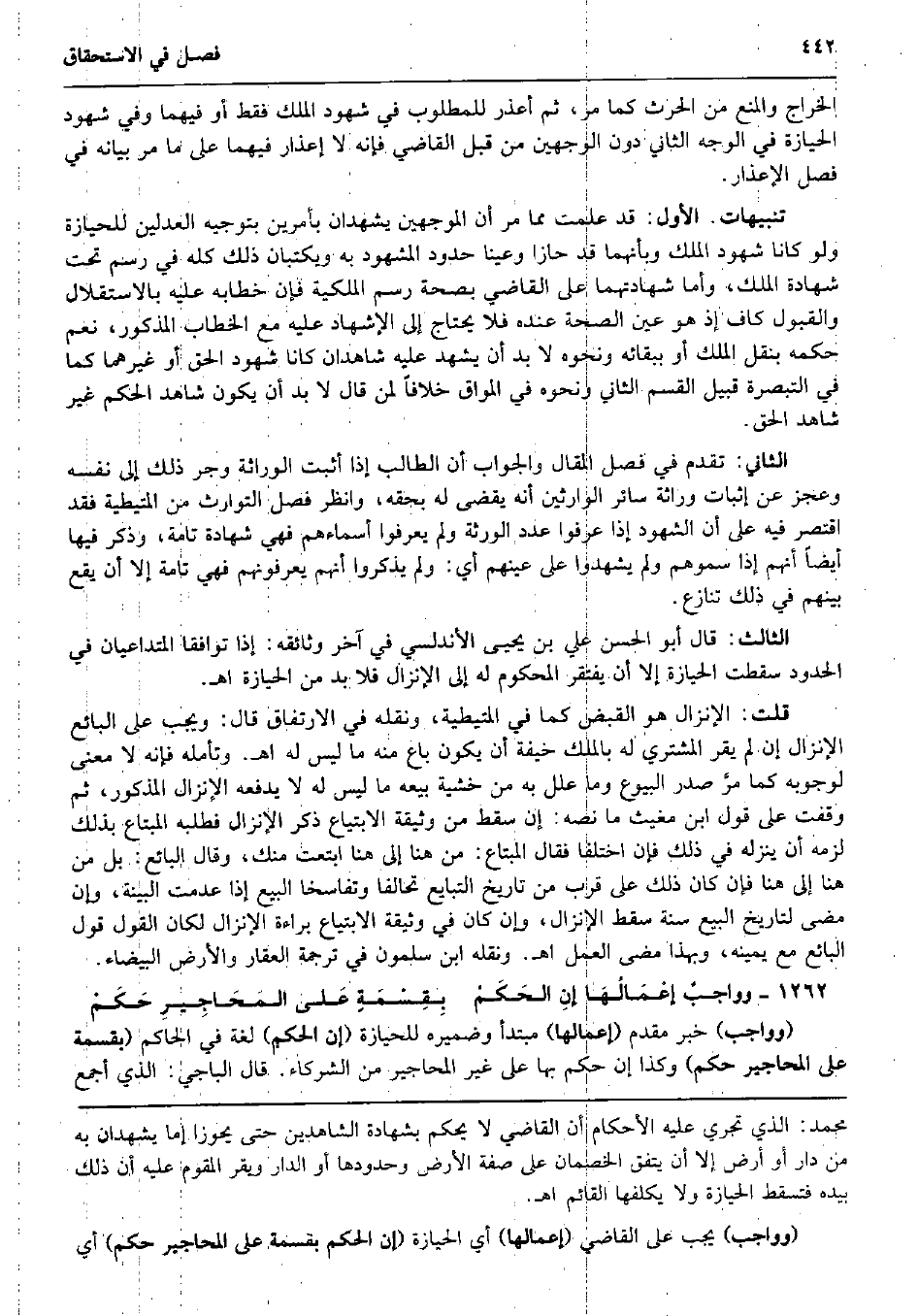 الْخراج وَالْمَنْع من الْحَرْث كَمَا مر، ثمَّ أعذر للمطلوب فِي شُهُود الْملك فَقَط أَو فيهمَا وَفِي شُهُود الْحِيَازَة فِي الْوَجْه الثَّانِي دون الْوَجْهَيْنِ من قبل القَاضِي فَإِنَّهُ لَا إعذار فيهمَا على مَا مر بَيَانه فِي فصل الْإِعْذَار. تَنْبِيهَات. الأول: قد علمت مِمَّا مر أَن الموجهين يَشْهَدَانِ بأمرين بتوجيه العدلين للحيازة وَلَو كَانَا شُهُود الْملك وبأنهما قد حازا وعينا حُدُود الْمَشْهُود بِهِ ويكتبان ذَلِك كُله فِي رسم تَحت شَهَادَة الْملك، وَأما شَهَادَتهمَا على القَاضِي بِصِحَّة رسم الملكية فَإِن خطابه عَلَيْهِ بالاستقلال وَالْقَبُول كَاف إِذْ هُوَ عين الصِّحَّة عِنْده فَلَا يحْتَاج إِلَى الْإِشْهَاد عَلَيْهِ مَعَ الْخطاب الْمَذْكُور نعم حكمه بِنَقْل الْملك أَو بِبَقَائِهِ وَنَحْوه لَا بُد أَن يشْهد عَلَيْهِ شَاهِدَانِ كَانَا شُهُود الْحق أَو غَيرهمَا كَمَا فِي التَّبْصِرَة قبيل الْقسم الثَّانِي وَنَحْوه فِي الْمواق خلافًا لمن قَالَ لَا بُد أَن يكون شَاهد الحكم غير شَاهد الْحق. الثَّانِي: تقدم فِي فصل الْمقَال وَالْجَوَاب أَن الطَّالِب إِذا أثبت الوراثة وجر ذَلِك إِلَى نَفسه وَعجز عَن إِثْبَات وراثة سَائِر الْوَارِثين أَنه يقْضى لَهُ بِحقِّهِ، وَانْظُر فصل التَّوَارُث من الْمُتَيْطِيَّة فقد اقْتصر فِيهِ على أَن الشُّهُود إِذا عرفُوا عدد الْوَرَثَة وَلم يعرفوا أَسْمَاءَهُم فَهِيَ شَهَادَة تَامَّة، وَذكر فِيهَا أَيْضا أَنهم إِذا سموهم وَلم يشْهدُوا على عينهم أَي: وَلم يذكرُوا أَنهم يعرفونهم فَهِيَ تَامَّة إِلَّا أَن يَقع بَينهم فِي ذَلِك تنَازع. الثَّالِث: قَالَ أَبُو الْحسن عَليّ بن يحيى الأندلسي فِي آخر وثائقه: إِذا توافقا المتداعيان فِي الْحُدُود سَقَطت الْحِيَازَة إِلَّا أَن يفْتَقر الْمَحْكُوم لَهُ إِلَى الْإِنْزَال فَلَا بُد من الْحِيَازَة اه. قلت: الْإِنْزَال هُوَ الْقَبْض كَمَا فِي الْمُتَيْطِيَّة، وَنَقله فِي الارتفاق قَالَ: وَيجب على البَائِع الْإِنْزَال إِن لم يقر المُشْتَرِي لَهُ بِالْملكِ خيفة أَن يكون بَاعَ مِنْهُ مَا لَيْسَ لَهُ اه. وتأمله فَإِنَّهُ لَا معنى لوُجُوبه كَمَا مرَّ صدر الْبيُوع وَمَا علل بِهِ من خشيَة بَيْعه مَا لَيْسَ لَهُ لَا يَدْفَعهُ الْإِنْزَال الْمَذْكُور، ثمَّ وقفت على قَول ابْن مغيث مَا نَصه: إِن سقط من وَثِيقَة الابتياع ذكر الْإِنْزَال فَطَلَبه الْمُبْتَاع بذلك لزمَه أَن ينزله فِي ذَلِك فَإِن اخْتلفَا فَقَالَ الْمُبْتَاع: من هُنَا إِلَى هُنَا ابتعت مِنْك، وَقَالَ البَائِع: بل من هُنَا إِلَى هُنَا فَإِن كَانَ ذَلِك على قرب من تَارِيخ التبايع تحَالفا وتفاسخا البيع إِذا عدمت الْبَيِّنَة، وَإِن مضى لتاريخ البيع سنة سقط الْإِنْزَال، وَإِن كَانَ فِي وَثِيقَة الابتياع بَرَاءَة الْإِنْزَال لَكَانَ القَوْل قَول البَائِع مَعَ يَمِينه، وَبِهَذَا مضى الْعَمَل اه. وَنَقله ابْن سَلمُون فِي تَرْجَمَة الْعقار وَالْأَرْض الْبَيْضَاء. وواجبٌ إعْمَالُهَا إنِ الحَكَمْ بِقِسْمَةٍ عَلى المَحَاجِيرِ حَكَمْ (وواجب) خبر مقدم (إعمالها) مُبْتَدأ وضميره للحيازة (إِن الحكم) لُغَة فِي الْحَاكِم (بقسمة على المحاجير حكم) وَكَذَا إِن حكم بهَا على غير المحاجير من الشُّرَكَاء. قَالَ الْبَاجِيّ: الَّذِي أجمع