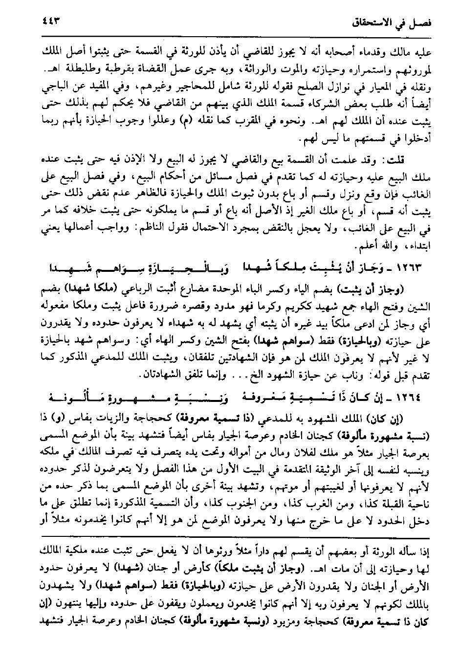 عَلَيْهِ مَالك وقدماء أَصْحَابه أَنه لَا يجوز للْقَاضِي أَن يَأْذَن للْوَرَثَة فِي الْقِسْمَة حَتَّى يثبتوا أصل الْملك لموروثهم واستمراره وحيازته وَالْمَوْت والوراثة، وَبِه جرى عمل الْقُضَاة بقرطبة وطليطلة اه. وَنَقله فِي المعيار فِي نَوَازِل الصُّلْح فَقَوله للْوَرَثَة شَامِل للمحاجير وَغَيرهم، وَفِي الْمُفِيد عَن الْبَاجِيّ أَيْضا أَنه طلب بعض الشُّرَكَاء قسْمَة الْملك الَّذِي بَينهم من القَاضِي فَلَا يحكم لَهُم بذلك حَتَّى يثبت عِنْده أَن الْملك لَهُم اه. وَنَحْوه فِي المقرب كَمَا نَقله (م) وعللوا وجوب الْحِيَازَة بِأَنَّهُم رُبمَا أدخلُوا فِي قسمتهم مَا لَيْسَ لَهُم. قلت: وَقد علمت أَن الْقِسْمَة بيع وَالْقَاضِي لَا يجوز لَهُ البيع وَلَا الْإِذْن فِيهِ حَتَّى يثبت عِنْده ملك البيع عَلَيْهِ وحيازته لَهُ كَمَا تقدم فِي فصل مسَائِل من أَحْكَام البيع، وَفِي فصل البيع على الْغَائِب فَإِن وَقع وَنزل وَقسم أَو بَاعَ بِدُونِ ثُبُوت الْملك والحيازة فَالظَّاهِر عدم نقض ذَلِك حَتَّى يثبت أَنه قسم، أَو بَاعَ ملك الْغَيْر إِذْ الأَصْل أَنه بَاعَ أَو قسم مَا يملكونه حَتَّى يثبت خِلَافه كَمَا مر فِي البيع على الْغَائِب، وَلَا يعجل بِالنَّقْضِ بِمُجَرَّد الِاحْتِمَال فَقَوْل النَّاظِم: وواجب أَعمالهَا يَعْنِي ابْتِدَاء، وَالله أعلم. وَجَاز أنْ يُثْبِتَ مِلكاً شُهدا وَبالْحِيَازَةِ سِوَاهم شَهِدا (وَجَاز أَن يثبت) بِضَم الْيَاء وَكسر الْبَاء الْمُوَحدَة مضارع أثبت الرباعي (ملكا شَهدا) بِضَم الشين وَفتح الْهَاء جمع شَهِيد ككريم وكرما فَهُوَ مدود وقصره ضَرُورَة فَاعل يثبت وملكا مَفْعُوله أَي وَجَاز لمن ادّعى ملكا بيد غَيره أَن يُثبتهُ أَي يشْهد لَهُ بِهِ شُهَدَاء لَا يعْرفُونَ حُدُوده وَلَا يقدرُونَ على حيازته (وبالحيازة) فَقَط (سواهُم شَهدا) بِفَتْح الشين وَكسر الْهَاء أَي: وسواهم شهد بالحيازة لَا غير لأَنهم لَا يعْرفُونَ الْملك لمن هُوَ فَإِن الشَّهَادَتَيْنِ تلفقان، وَيثبت الْملك للْمُدَّعِي الْمَذْكُور كَمَا تقدم قبل قَوْله: وناب عَن حِيَازَة الشُّهُود الخ ... وَإِنَّمَا تلفق الشهادتان. إنْ كانَ ذَا تَسْمِيَةٍ مَعْروفهْ وَنِسْبَةٍ مشهورةٍ مَأْلُوفهْ (إِن كَانَ) الْملك الْمَشْهُود بِهِ للْمُدَّعِي (ذَا تَسْمِيَة مَعْرُوفَة) كحجاجة والزيات بفاس (و) ذَا (نِسْبَة مَشْهُورَة مألوفة) كجنان الْخَادِم وعرصة الجيار بفاس أَيْضا فَتشهد بَيِّنَة بِأَن الْموضع الْمُسَمّى بعرصة الجيار مثلا هُوَ ملك لفُلَان وَمَال من أَمْوَاله وَتَحْت يَده يتَصَرَّف فِيهِ تصرف الْمَالِك فِي ملكه وينسبه لنَفسِهِ إِلَى آخر الْوَثِيقَة الْمُتَقَدّمَة فِي الْبَيْت الأول من هَذَا الْفَصْل وَلَا يتعرضون لذكر حُدُوده لأَنهم لَا يعرفونها أَو لغيبتهم أَو مَوْتهمْ، وَتشهد بَيِّنَة أُخْرَى بِأَن الْموضع الْمُسَمّى بِمَا ذكر حَده من نَاحيَة الْقبْلَة كَذَا، وَمن الغرب كَذَا، وَمن الْجنُوب كَذَا، وَأَن التَّسْمِيَة الْمَذْكُورَة إِنَّمَا تطلق على مَا دخل الْحُدُود لَا على مَا خرج مِنْهَا وَلَا يعْرفُونَ الْموضع لمن هُوَ إِلَّا أَنهم كَانُوا يخدمونه مثلا أَو