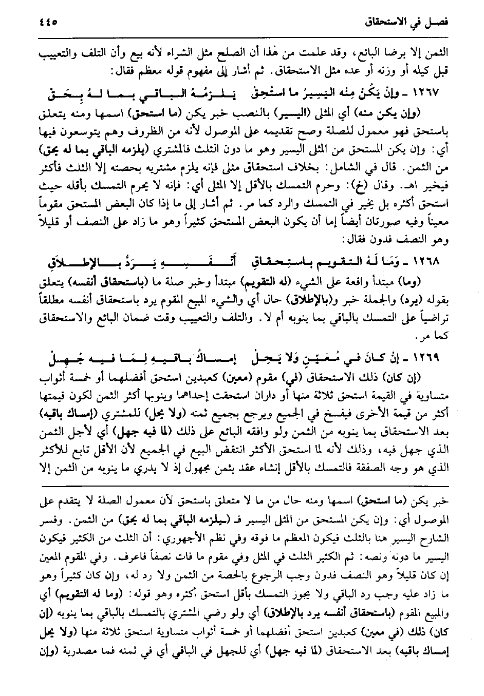 الثّمن إِلَّا بِرِضا البَائِع، وَقد علمت من هَذَا أَن الصُّلْح مثل الشِّرَاء لِأَنَّهُ بيع وَأَن التّلف والتعييب قبل كَيْله أَو وَزنه أَو عده مثل الِاسْتِحْقَاق. ثمَّ أَشَارَ إِلَى مَفْهُوم قَوْله مُعظم فَقَالَ: وإنْ يَكُنْ مِنْه اليَسِيرُ مَا استُحِقْ يَلزمُهُ الْبَاقِي بِمَا لهُ بِحَقْ (وَإِن يكن مِنْهُ) أَي المثلى (الْيَسِير) بِالنّصب خبر يكن (مَا اسْتحق) اسْمهَا وَمِنْه يتَعَلَّق باستحق فَهُوَ مَعْمُول للصلة وَصَحَّ تَقْدِيمه على الْمَوْصُول لِأَنَّهُ من الظروف وهم يتوسعون فِيهَا أَي: وَإِن يكن الْمُسْتَحق من المثلى الْيَسِير وَهُوَ مَا دون الثُّلُث فَالْمُشْتَرِي (يلْزمه الْبَاقِي بِمَا لَهُ يحِق) من الثّمن. قَالَ فِي الشَّامِل: بِخِلَاف اسْتِحْقَاق مثلى فَإِنَّهُ يلْزم مُشْتَرِيه بِحِصَّتِهِ إِلَّا الثُّلُث فَأكْثر فَيُخَير اه. وَقَالَ (خَ) : وَحرم التَّمَسُّك بِالْأَقَلِّ إِلَّا المثلى أَي: فَإِنَّهُ لَا يحرم التَّمَسُّك بأقله حَيْثُ اسْتحق أَكْثَره بل يُخَيّر فِي التَّمَسُّك وَالرَّدّ كَمَا مر. ثمَّ أَشَارَ إِلَى مَا إِذا كَانَ الْبَعْض الْمُسْتَحق مُقَومًا معينا وَفِيه صُورَتَانِ أَيْضا إِمَّا أَن يكون الْبَعْض الْمُسْتَحق كثيرا وَهُوَ مَا زَاد على النّصْف أَو قَلِيلا وَهُوَ النّصْف فدون فَقَالَ: وَمَا لَهُ التَّقْوِيم باستِحقاقِ أَنْفَسِهِ يَرَدُّ بالإطلاَقِ (وَمَا) مُبْتَدأ وَاقعَة على الشَّيْء (لَهُ التَّقْوِيم) مُبْتَدأ وَخبر صلَة مَا (بِاسْتِحْقَاق أنفسه) يتَعَلَّق بقوله (يرد) وَالْجُمْلَة خبر و (بِالْإِطْلَاقِ) حَال أَي وَالشَّيْء الْمَبِيع الْمُقَوّم يرد بِاسْتِحْقَاق أنفسه مُطلقًا تَرَاضيا على التَّمَسُّك بِالْبَاقِي بِمَا ينوبه أم لَا. والتلف والتعييب وَقت ضَمَان البَائِع والاستحقاق كَمَا مر. إنْ كانَ فِي مُعَيِّنٍ وَلا يَحِلْ إمساكُ باقيهِ لِمَا فِيهِ جُهِلْ (إِن كَانَ) ذَلِك الِاسْتِحْقَاق (فِي) مقوم (معِين) كعبدين اسْتحق أفضلهما أَو خَمْسَة أَثوَاب مُتَسَاوِيَة فِي الْقيمَة اسْتحق ثَلَاثَة مِنْهَا أَو داران اسْتحقَّت إِحْدَاهمَا وينوبها أَكثر الثّمن لكَون قيمتهَا أَكثر من قيمَة الْأُخْرَى فَيفْسخ فِي الْجَمِيع وَيرجع بِجَمِيعِ ثمنه (وَلَا يحل) للْمُشْتَرِي (إمْسَاك بَاقِيه) بعد الِاسْتِحْقَاق بِمَا ينوبه من الثّمن وَلَو وَافقه البَائِع على ذَلِك (لما فِيهِ جهل) أَي لأجل الثّمن الَّذِي جهل فِيهِ، وَذَلِكَ لِأَنَّهُ لما اسْتحق الْأَكْثَر انْتقض البيع فِي الْجَمِيع لِأَن الْأَقَل تَابع للْأَكْثَر الَّذِي هُوَ وَجه الصَّفْقَة فالتمسك بِالْأَقَلِّ إنْشَاء عقد بِثمن مَجْهُول إِذْ لَا يدْرِي مَا ينوبه من الثّمن إِلَّا