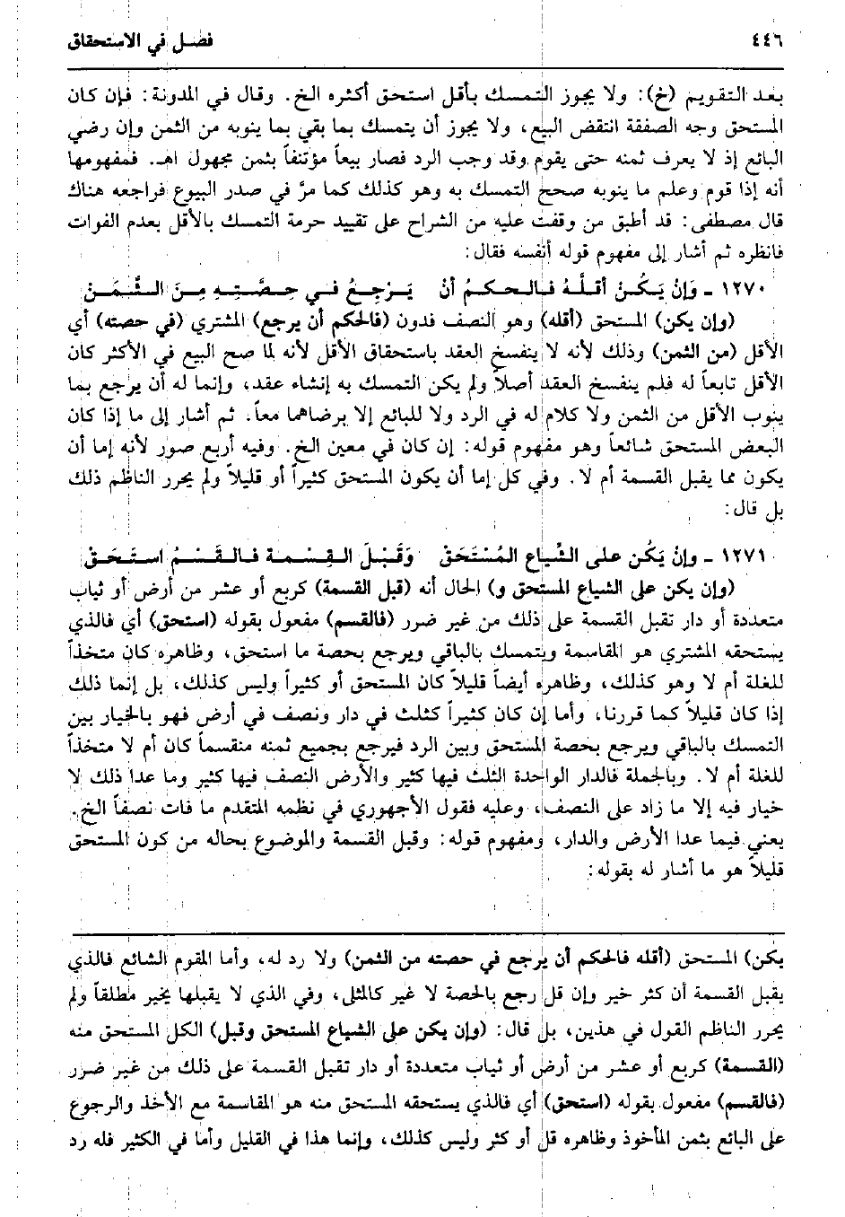 بعد التَّقْوِيم (خَ) : وَلَا يجوز التَّمَسُّك بِأَقَلّ اسْتحق أَكْثَره الخ. وَقَالَ فِي الْمُدَوَّنَة: فَإِن كَانَ الْمُسْتَحق وَجه الصَّفْقَة انْتقض البيع، وَلَا يجوز أَن يتَمَسَّك بِمَا بَقِي بِمَا ينوبه من الثّمن وَإِن رَضِي البَائِع إِذْ لَا يعرف ثمنه حَتَّى يقوم وَقد وَجب الرَّد فَصَارَ بيعا مؤتنفاً بِثمن مَجْهُول اه. فمفهومها أَنه إِذا قوم وَعلم مَا ينوبه صحّح التَّمَسُّك بِهِ وَهُوَ كَذَلِك كَمَا مرَّ فِي صدر الْبيُوع فَرَاجعه هُنَاكَ قَالَ مصطفى: قد أطبق من وقفت عَلَيْهِ من الشُّرَّاح على تَقْيِيد حُرْمَة التَّمَسُّك بِالْأَقَلِّ بِعَدَمِ الْفَوات فَانْظُرْهُ ثمَّ أَشَارَ إِلَى مَفْهُوم قَوْله أنفسه فَقَالَ: وَإنْ يَكُنْ أقلَّهُ فالحكمُ أنْ يَرْجِعُ فِي حِصَّتِهِ مِنَ الثَّمَنْ (وَإِن يكن) الْمُسْتَحق (أَقَله) وَهُوَ النّصْف فدون (فَالْحكم أَن يرجع) المُشْتَرِي (فِي حِصَّته) أَي الْأَقَل (من الثّمن) وَذَلِكَ لِأَنَّهُ لَا يَنْفَسِخ العقد بِاسْتِحْقَاق الْأَقَل لِأَنَّهُ لما صَحَّ البيع فِي الْأَكْثَر كَانَ الْأَقَل تَابعا لَهُ فَلم يَنْفَسِخ العقد أصلا وَلم يكن التَّمَسُّك بِهِ إنْشَاء عقد، وَإِنَّمَا لَهُ أَن يرجع بِمَا يَنُوب الْأَقَل من الثّمن وَلَا كَلَام لَهُ فِي الرَّد وَلَا للْبَائِع إِلَّا برضاهما مَعًا. ثمَّ أَشَارَ إِلَى مَا إِذا كَانَ الْبَعْض الْمُسْتَحق شَائِعا وَهُوَ مَفْهُوم قَوْله: إِن كَانَ فِي معِين الخ. وَفِيه أَربع صور لِأَنَّهُ إِمَّا أَن يكون مِمَّا يقبل الْقِسْمَة أم لَا. وَفِي كل إِمَّا أَن يكون الْمُسْتَحق كثيرا أَو قَلِيلا وَلم يحرر النَّاظِم ذَلِك بل قَالَ: وإنْ يَكُن على الشِّياع المُسْتَحَقْ وَقَبْلَ القِسْمة فالقَسْمُ استَحَقْ (وَإِن يكن على الشياع الْمُسْتَحق و) الْحَال أَنه (قبل الْقِسْمَة) كربع أَو عشر من أَرض أَو ثِيَاب مُتعَدِّدَة أَو دَار تقبل الْقِسْمَة على ذَلِك من غير ضَرَر (فالقسم) مفعول بقوله (اسْتحق) أَي فَالَّذِي يسْتَحقّهُ المُشْتَرِي هُوَ الْمُقَاسَمَة ويتمسك بِالْبَاقِي وَيرجع بِحِصَّة مَا اسْتحق، وَظَاهره كَانَ متخذاً للغلة أم لَا وَهُوَ كَذَلِك، وَظَاهره أَيْضا قَلِيلا كَانَ الْمُسْتَحق أَو كثيرا وَلَيْسَ كَذَلِك، بل إِنَّمَا ذَلِك إِذا كَانَ قَلِيلا كَمَا قَررنَا، وَأما إِن كَانَ كثيرا كثلث فِي دَار وَنصف فِي أَرض فَهُوَ بِالْخِيَارِ بَين التَّمَسُّك بِالْبَاقِي وَيرجع بِحِصَّة الْمُسْتَحق وَبَين الرَّد فَيرجع بِجَمِيعِ ثمنه منقسماً كَانَ أم لَا متخذاً للغلة أم لَا. وَبِالْجُمْلَةِ فالدار الْوَاحِدَة الثُّلُث فِيهَا كثير وَالْأَرْض النّصْف فِيهَا كثير وَمَا عدا ذَلِك لَا خِيَار فِيهِ إِلَّا مَا زَاد على النّصْف وَعَلِيهِ فَقَوْل الأَجْهُورِيّ فِي نظمه الْمُتَقَدّم مَا فَاتَ نصفا الخ. يَعْنِي فِيمَا عدا الأَرْض وَالدَّار، وَمَفْهُوم قَوْله: وَقبل الْقِسْمَة والموضوع بِحَالهِ من كَون الْمُسْتَحق قَلِيلا هُوَ مَا أَشَارَ لَهُ بقوله: