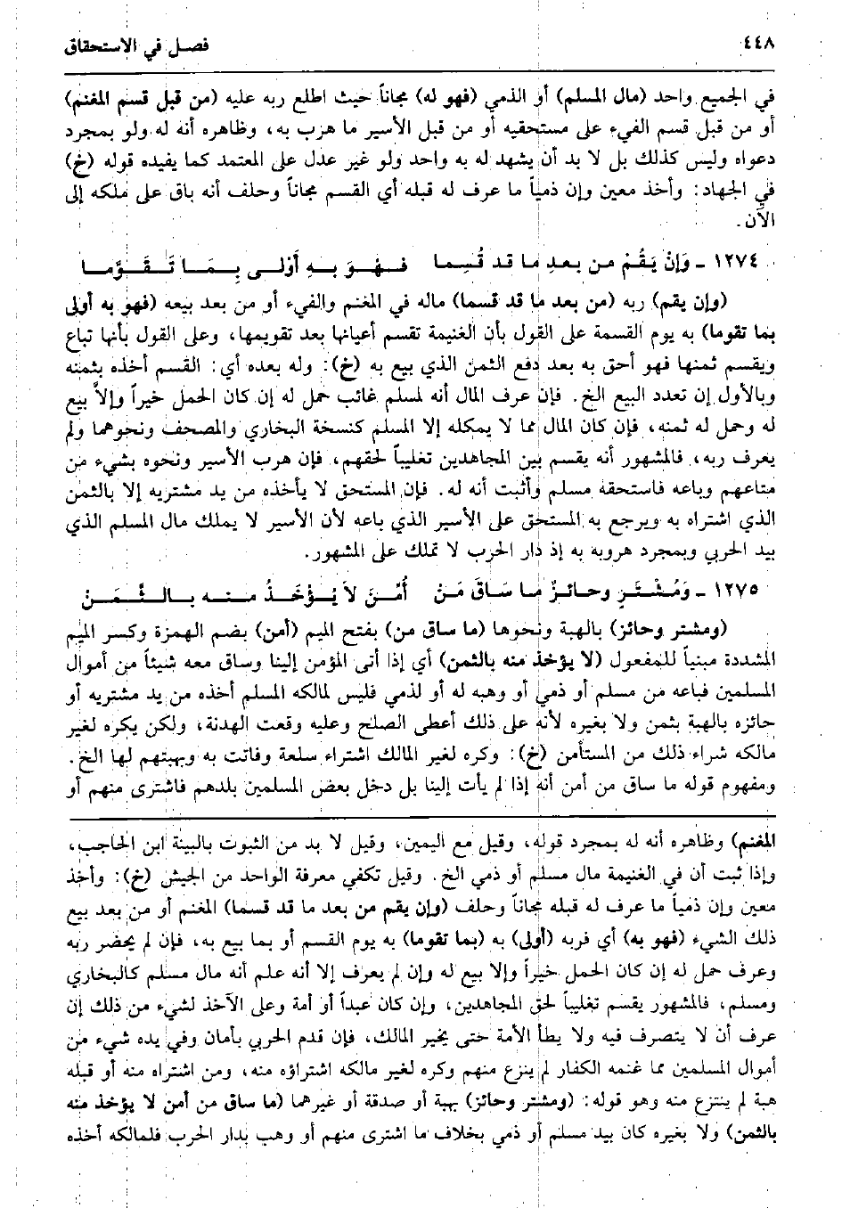 فِي الْجَمِيع وَاحِد (مَال الْمُسلم) أَو الذِّمِّيّ (فَهُوَ لَهُ) مجَّانا حَيْثُ اطلع ربه عَلَيْهِ (من قبل قسم الْمغنم) أَو من قبل قسم الْفَيْء على مستحقيه أَو من قبل الْأَسير مَا هرب بِهِ، وَظَاهره أَنه لَهُ وَلَو بِمُجَرَّد دَعْوَاهُ وَلَيْسَ كَذَلِك بل لَا بُد أَن يشْهد لَهُ بِهِ وَاحِد وَلَو غير عدل على الْمُعْتَمد كَمَا يفِيدهُ قَوْله (خَ) فِي الْجِهَاد: وَأخذ معِين وَإِن ذِمِّيا مَا عرف لَهُ قبله أَي الْقسم مجَّانا وَحلف أَنه بَاقٍ على ملكه إِلَى الْآن. وَإنْ يَقُمْ من بعدِ مَا قد قُسِما فهْوَ بهِ أَوْلى بِمَا تَقَوَّما (وَإِن يقم) ربه (من بعد مَا قد قسما) مَاله فِي الْمغنم والفيء أَو من بعد بَيْعه (فَهُوَ بِهِ أولى بِمَا تقوما) بِهِ يَوْم الْقِسْمَة على القَوْل بِأَن الْغَنِيمَة تقسم أعيانها بعد تقويمها، وعَلى القَوْل بِأَنَّهَا تبَاع وَيقسم ثمنهَا فَهُوَ أَحَق بِهِ بعد دفع الثّمن الَّذِي بيع بِهِ (خَ) : وَله بعده أَي: الْقسم أَخذه بِثمنِهِ وبالأول إِن تعدد البيع الخ. فَإِن عرف المَال أَنه لمُسلم غَائِب حمل لَهُ إِن كَانَ الْحمل خيرا وإلاَّ بيع لَهُ وَحمل لَهُ ثمنه، فَإِن كَانَ المَال مِمَّا لَا يمكله إِلَّا الْمُسلم كنسخة البُخَارِيّ والمصحف وَنَحْوهمَا وَلم يعرف ربه، فَالْمَشْهُور أَنه يقسم بَين الْمُجَاهدين تَغْلِيبًا لحقهم، فَإِن هرب الْأَسير وَنَحْوه بِشَيْء من مَتَاعهمْ وَبَاعه فاستحقه مُسلم وَأثبت أَنه لَهُ. فَإِن الْمُسْتَحق لَا يَأْخُذهُ من يَد مُشْتَرِيه إِلَّا بِالثّمن الَّذِي اشْتَرَاهُ بِهِ وَيرجع بِهِ الْمُسْتَحق على الْأَسير الَّذِي بَاعه لِأَن الْأَسير لَا يملك مَال الْمُسلم الَّذِي بيد الْحَرْبِيّ وبمجرد هروبه بِهِ إِذْ دَار الْحَرْب لَا تملك على الْمَشْهُور. وَمُشْتَرٍ وحائزٌ مَا سَاقَ مَنْ أُمِّنَ لاَ يُؤْخَذُ مِنْهُ بالثَّمَنْ (ومشتر وحائز) بِالْهبةِ وَنَحْوهَا (مَا سَاق من) بِفَتْح الْمِيم (أَمن) بِضَم الْهمزَة وَكسر الْمِيم الْمُشَدّدَة مَبْنِيا للْمَفْعُول (لَا يُؤْخَذ مِنْهُ بِالثّمن) أَي إِذا أَتَى الْمُؤمن إِلَيْنَا وسَاق مَعَه شَيْئا من أَمْوَال الْمُسلمين فَبَاعَهُ من مُسلم أَو ذمِّي أَو وهبه لَهُ أَو لذِمِّيّ فَلَيْسَ لمَالِكه الْمُسلم أَخذه من يَد مُشْتَرِيه أَو حائزه بِالْهبةِ بِثمن وَلَا بِغَيْرِهِ لِأَنَّهُ على ذَلِك أعْطى الصُّلْح وَعَلِيهِ وَقعت الْهُدْنَة، وَلَكِن يكره لغير مَالِكه شِرَاء ذَلِك من الْمُسْتَأْمن (خَ) : وَكره لغير الْمَالِك اشْتِرَاء سلْعَة وفاتت بِهِ وبهبتهم لَهَا الخ. وَمَفْهُوم قَوْله مَا سَاق من أَمن أَنه إِذا لم يَأْتِ إِلَيْنَا بل دخل بعض الْمُسلمين بلدهم فَاشْترى مِنْهُم أَو