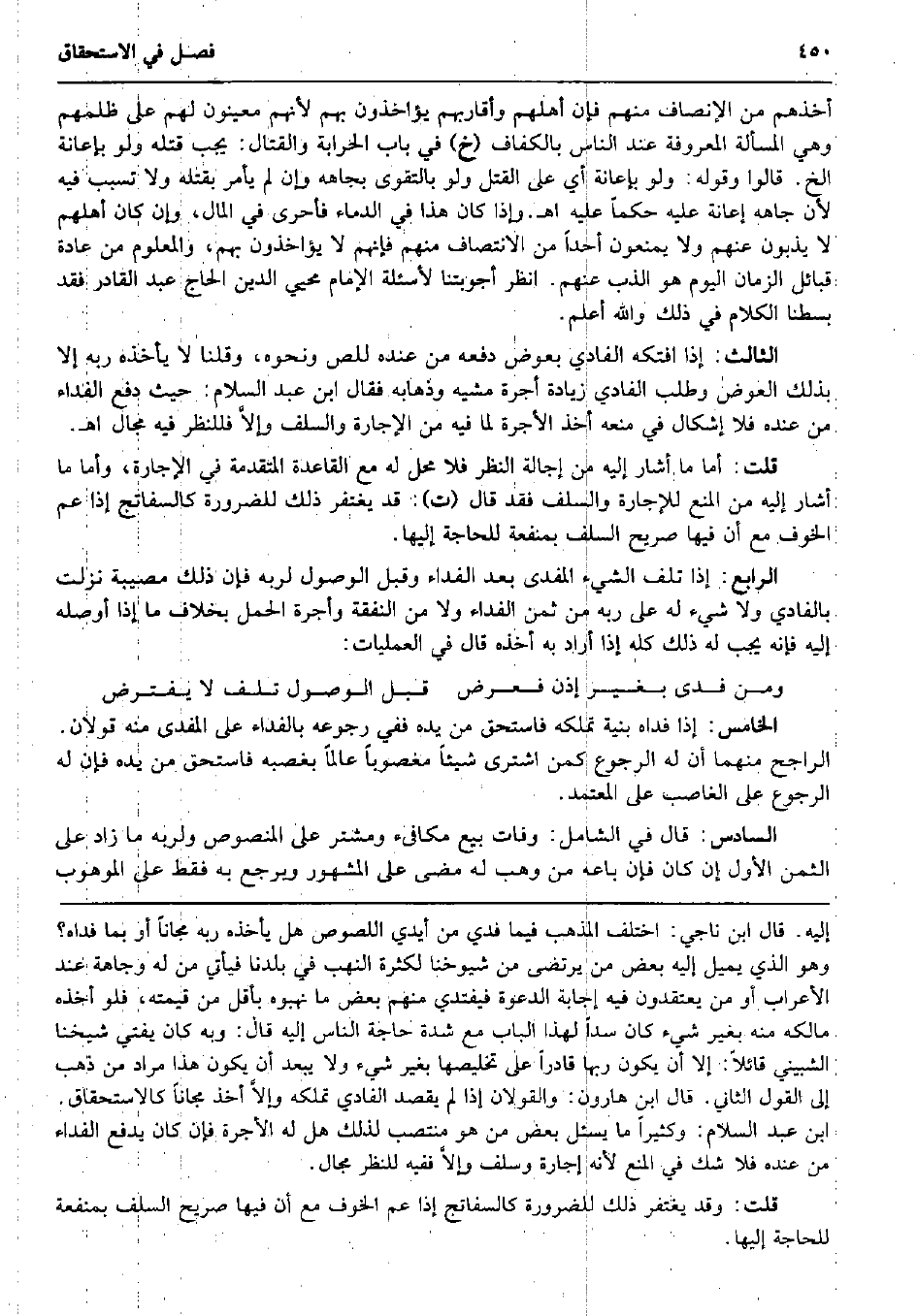 أَخذهم من الْإِنْصَاف مِنْهُم فَإِن أهلهم وأقاربهم يؤاخذون بهم لأَنهم معينون لَهُم على ظلمهم وَهِي الْمَسْأَلَة الْمَعْرُوفَة عِنْد النَّاس بالكفاف (خَ) فِي بَاب الْحِرَابَة والقتال: يجب قَتله وَلَو بإعانة الخ. قَالُوا وَقَوله: وَلَو بإعانة أَي على الْقَتْل وَلَو بالتقوى بجاهه وَإِن لم يَأْمر بقتْله وَلَا تسبب فِيهِ لِأَن جاهه إِعَانَة عَلَيْهِ حكما عَلَيْهِ اه. وَإِذا كَانَ هَذَا فِي الدِّمَاء فأحرى فِي المَال، وَإِن كَانَ أهلهم لَا يَذبُّونَ عَنْهُم وَلَا يمْنَعُونَ أحدا من الانتصاف مِنْهُم فَإِنَّهُم لَا يؤاخذون بهم، والمعلوم من عَادَة قبائل الزَّمَان الْيَوْم هُوَ الذب عَنْهُم. انْظُر أجوبتنا لأسئلة الإِمَام محيي الدّين الْحَاج عبد الْقَادِر فقد بسطنا الْكَلَام فِي ذَلِك وَالله أعلم. الثَّالِث: إِذا افتكه الفادي بعوض دَفعه من عِنْده للص وَنَحْوه، وَقُلْنَا لَا يَأْخُذهُ ربه إِلَّا بذلك الْعِوَض وَطلب الفادي زِيَادَة أُجْرَة مَشْيه وذهابه فَقَالَ ابْن عبد السَّلَام: حَيْثُ دفع الْفِدَاء من عِنْده فَلَا إِشْكَال فِي مَنعه أَخذ الْأُجْرَة لما فِيهِ من الْإِجَارَة وَالسَّلَف وإلاَّ فللنظر فِيهِ مجَال اه. قلت: أما مَا أَشَارَ إِلَيْهِ من إجالة النّظر فَلَا مَحل لَهُ مَعَ الْقَاعِدَة الْمُتَقَدّمَة فِي الْإِجَارَة، وَأما مَا أَشَارَ إِلَيْهِ من الْمَنْع للإجارة وَالسَّلَف فقد قَالَ (ت) : قد يغْتَفر ذَلِك للضَّرُورَة كالسفاتج إِذا عَم الْخَوْف مَعَ أَن فِيهَا صَرِيح السّلف بِمَنْفَعَة للْحَاجة إِلَيْهَا. الرَّابِع: إِذا تلف الشَّيْء المفدى بعد الْفِدَاء وَقبل الْوُصُول لرَبه فَإِن ذَلِك مُصِيبَة نزلت بالفادي وَلَا شَيْء لَهُ على ربه من ثمن الْفِدَاء وَلَا من النَّفَقَة وَأُجْرَة الْحمل بِخِلَاف مَا إِذا أوصله إِلَيْهِ فَإِنَّهُ يجب لَهُ ذَلِك كُله إِذا أَرَادَ بِهِ أَخذه قَالَ فِي العمليات: وَمن فدى بِغَيْر إِذن فَعرض قبل الْوُصُول تلف لَا يفترض الْخَامِس: إِذا فدَاه بنية تملكه فَاسْتحقَّ من يَده فَفِي رُجُوعه بِالْفِدَاءِ على المفدى مِنْهُ قَولَانِ. الرَّاجِح مِنْهُمَا أَن لَهُ الرُّجُوع كمن اشْترى شَيْئا مَغْصُوبًا عَالما بغصبه فَاسْتحقَّ من يَده فَإِن لَهُ الرُّجُوع على الْغَاصِب على الْمُعْتَمد. السَّادِس: قَالَ فِي الشَّامِل: وَفَاتَ بيع مكافىء ومشتر على الْمَنْصُوص ولربه مَا زَاد على الثّمن الأول إِن كَانَ فَإِن بَاعه من وهب لَهُ مضى على الْمَشْهُور وَيرجع بِهِ فَقَط على الْمَوْهُوب