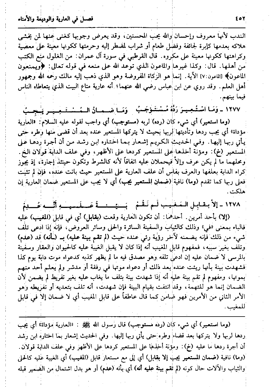 النّدب لِأَنَّهَا مَعْرُوف وإحسان وَالله يحب الْمُحْسِنِينَ، وَقد يعرض وُجُوبهَا كغنى عَنْهَا لمن يخْشَى هَلَاكه بعدمها كإبرة لجائفة وَفضل طَعَام أَو شراب لمضطر إِلَيْهِ وحرمتها ككونها مُعينَة على مَعْصِيّة وكراهتها ككونها مُعينَة على مَكْرُوه. قَالَ الْقُرْطُبِيّ فِي سُورَة آل عمرَان: من الْغلُول منع الْكتب من أَهلهَا. قَالَ: وَكَذَا غَيرهَا والماعون الَّذِي توعد الله على مَنعه فِي قَوْله تَعَالَى: وَيمْنَعُونَ الماعون} (الماعون: 7) الْآيَة. إِنَّمَا هُوَ الزَّكَاة الْمَفْرُوضَة وَهُوَ الَّذِي ذهب إِلَيْهِ مَالك رَحمَه الله وَجُمْهُور أهل الْعلم. وَقد رُوِيَ عَن ابْن عَبَّاس رَضِي الله عَنْهُمَا؛ أَنه عَارِية مَتَاع الْبَيْت الَّذِي يتعاطاه النَّاس فِيمَا بَينهم. وَمَا اسْتُعِيرَ رَدُّهُ مُسْتَوْجَبُ وَمَا ضمانُ المُسْتَعِير يَجِبُ (وَمَا استعير) أَي شَيْء كَانَ (رده) لرَبه (مستوجب) أَي وَاجِب لقَوْله عَلَيْهِ السَّلَام: (الْعَارِية مُؤَدَّاة) أَي يجب ردهَا وتأديتها لِرَبِّهَا بِحَيْثُ لَا يَتْرُكهَا الْمُسْتَعِير عِنْده بعد أَن قضى مِنْهَا وطره حَتَّى يَأْتِي رَبهَا إِلَيْهَا. وَفِي الحَدِيث الْكَرِيم إِشْعَار بِمَا اخْتَارَهُ ابْن رشد من أَن أُجْرَة ردهَا على الْمُسْتَعِير (خَ) : وَمؤنَة أَخذهَا على الْمُسْتَعِير كردها على الْأَظْهر، وَفِي علف الدَّابَّة قَولَانِ الخ. ومحلهما مَا لم يكن عرف وإلاَّ فيحملان عَلَيْهِ اتِّفَاقًا لِأَنَّهُ كالشرط وَتَكون حِينَئِذٍ إِجَارَة، إِذْ يجوز كِرَاء الدَّابَّة بعلفها وَالْعرْف بفاس أَن علف الْعَارِية على الْمُسْتَعِير حَيْثُ باتت عِنْده فَإِن لم تثبت فعلى رَبهَا كَمَا تقدم (وَمَا) نَافِيَة (ضَمَان الْمُسْتَعِير يجب) أَي لَا يجب على الْمُسْتَعِير ضَمَان الْعَارِية إِن هَلَكت. إلاَّ بقابِلِ المَغيب لَم تَقُمْ بَيِّنةُ عَلَيهِ أَنَّه عُدِمْ (إِلَّا) بِأحد أَمريْن. أَحدهمَا: أَن تكون الْعَارِية وَقعت (بقابل) أَي فِي قَابل (المغيب) عَلَيْهِ فالباء بِمَعْنى (فِي) وَذَلِكَ كالثياب والسفينة السائرة والحلى وَسَائِر الْعرُوض، فَإِنَّهُ إِذا ادّعى تلف شَيْء من ذَلِك فَإِنَّهُ يضمنهُ لآخر رُؤْيَة رئي عِنْده حَيْثُ (لم تقم بَيِّنَة عَلَيْهِ) ب (أَنه) قد (عدم) وَتلف بِغَيْر سَببه، فمفهوم قَابل المغيب أَنه إِذا كَانَ لَا يقبل الْغَيْبَة عَلَيْهِ كالحيوان وَالْعَقار وسفينة بالمرسى لَا ضَمَان عَلَيْهِ إِن ادّعى تلفه وَهُوَ مُصدق فِيهِ مَا لم يظْهر كذبه كدعواه موت دَابَّة يَوْم كَذَا فَشَهِدت بَيِّنَة بِأَنَّهَا ريئت عِنْده بعد ذَلِك أَو دَعْوَاهُ مَوتهَا فِي رفْقَة أَو مدشر وَلم يعلم أحد مِنْهُم بموتها، وَمَفْهُوم لم تقم بَيِّنَة عَلَيْهِ أَنه إِذا شهِدت بَيِّنَة بِتَلف مَا يُغَاب عَلَيْهِ بِغَيْر تَفْرِيط لم يضمن لِأَن الضَّمَان إِنَّمَا هُوَ للتُّهمَةِ، وَقد انْتَفَت بِقِيَام الْبَيِّنَة فَإِن شهِدت، أَنه تلف بتعديه أَو تفريطه وَهُوَ الْأَمر الثَّانِي من الْأَمريْنِ فَهُوَ ضَامِن كَمَا قَالَ عاطفاً على قَابل المغيب أَي لَا ضَمَان إِلَّا فِي قَابل للمغيب.