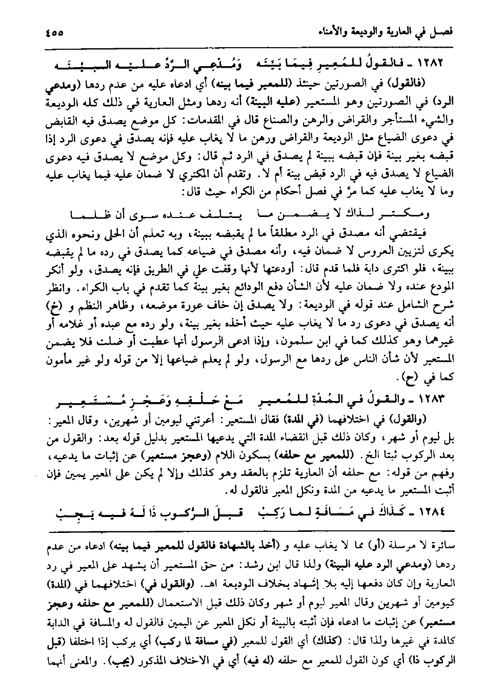 فالقولُ للمُعِيرِ فِيمَا بَيَّنَه وَمُدّعِي الرَّدِّ عليْه البيِّنَه (فَالْقَوْل) فِي الصُّورَتَيْنِ حِينَئِذٍ (للْمُعِير فِيمَا بَينه) أَي ادَّعَاهُ عَلَيْهِ من عدم ردهَا (ومدعي الرَّد) فِي الصُّورَتَيْنِ وَهُوَ الْمُسْتَعِير (عَلَيْهِ الْبَيِّنَة) أَنه ردهَا وَمثل الْعَارِية فِي ذَلِك كُله الْوَدِيعَة وَالشَّيْء الْمُسْتَأْجر والقراض وَالرَّهْن والصناع قَالَ فِي الْمُقدمَات: كل مَوضِع يصدق فِيهِ الْقَابِض فِي دَعْوَى الضّيَاع مثل الْوَدِيعَة والقراض وَرهن مَا لَا يُغَاب عَلَيْهِ فَإِنَّهُ يصدق فِي دَعْوَى الرَّد إِذا قَبضه بِغَيْر بَيِّنَة فَإِن قَبضه بِبَيِّنَة لم يصدق فِي الرَّد ثمَّ قَالَ: وكل مَوضِع لَا يصدق فِيهِ دَعْوَى الضّيَاع لَا يصدق فِيهِ فِي الرَّد قبض بَيِّنَة أم لَا. وَتقدم أَن الْمُكْتَرِي لَا ضَمَان عَلَيْهِ فِيمَا يُغَاب عَلَيْهِ وَمَا لَا يُغَاب عَلَيْهِ كَمَا مرَّ فِي فصل أَحْكَام من الْكِرَاء حَيْثُ قَالَ: ومكتر لذاك لَا يضمن مَا يتْلف عِنْده سوى أَن ظلما فَيَقْتَضِي أَنه مُصدق فِي الرَّد مُطلقًا مَا لم يقبضهُ بِبَيِّنَة، وَبِه تعلم أَن الحلى وَنَحْوه الَّذِي يكرى لتزيين الْعَرُوس لَا ضَمَان فِيهِ، وَأَنه مُصدق فِي ضيَاعه كَمَا يصدق فِي رده مَا لم يقبضهُ بِبَيِّنَة، فَلَو اكترى دَابَّة فَلَمَّا قدم قَالَ: أودعتها لِأَنَّهَا وقفت عَليّ فِي الطَّرِيق فَإِنَّهُ يصدق وَلَو أنكر الْمُودع عِنْده وَلَا ضَمَان عَلَيْهِ لِأَن الشَّأْن دفع الودائع بِغَيْر بَيِّنَة كَمَا تقدم فِي بَاب الْكِرَاء. وَانْظُر شرح الشَّامِل عِنْد قَوْله فِي الْوَدِيعَة: وَلَا يصدق إِن خَافَ عَورَة مَوْضِعه، وَظَاهر النّظم و (خَ) أَنه يصدق فِي دَعْوَى رد مَا لَا يُغَاب عَلَيْهِ حَيْثُ أَخذه بِغَيْر بَيِّنَة، وَلَو رده مَعَ عَبده أَو غُلَامه أَو غَيرهمَا وَهُوَ كَذَلِك كَمَا فِي ابْن سَلمُون، وَإِذا ادّعى الرَّسُول أَنَّهَا عطبت أَو ضلت فَلَا يضمن الْمُسْتَعِير لِأَن شَأْن النَّاس على ردهَا مَعَ الرَّسُول، وَلَو لم يعلم ضياعها إِلَّا من قَوْله وَلَو غير مَأْمُون كَمَا فِي (ح) . والقولُ فِي المُدّةِ للمُعيرِ مَعْ حَلْفِهِ وَعَجْزِ مُسْتَعِير (وَالْقَوْل) فِي اخْتِلَافهمَا (فِي الْمدَّة) فَقَالَ الْمُسْتَعِير: أعرتني ليومين أَو شَهْرَيْن، وَقَالَ الْمُعير: بل ليَوْم أَو شهر، وَكَانَ ذَلِك قبل انْقِضَاء الْمدَّة الَّتِي يدعيها الْمُسْتَعِير بِدَلِيل قَوْله بعد: وَالْقَوْل من بعد الرّكُوب ثبتا الخ. (للْمُعِير مَعَ حلفه) بِسُكُون اللَّام (وَعجز مستعير) عَن إِثْبَات مَا يَدعِيهِ، وَفهم من قَوْله: مَعَ حلفه أَن الْعَارِية تلْزم بِالْعقدِ وَهُوَ كَذَلِك وَإِلَّا لم يكن على الْمُعير يَمِين فَإِن أثبت الْمُسْتَعِير مَا يَدعِيهِ من الْمدَّة وَنكل الْمُعير فَالْقَوْل لَهُ. كَذَاكَ فِي مَسَافَةٍ لما رَكِبْ قبلَ الرُّكوب ذَا لَهُ فِيهِ يَجِبْ