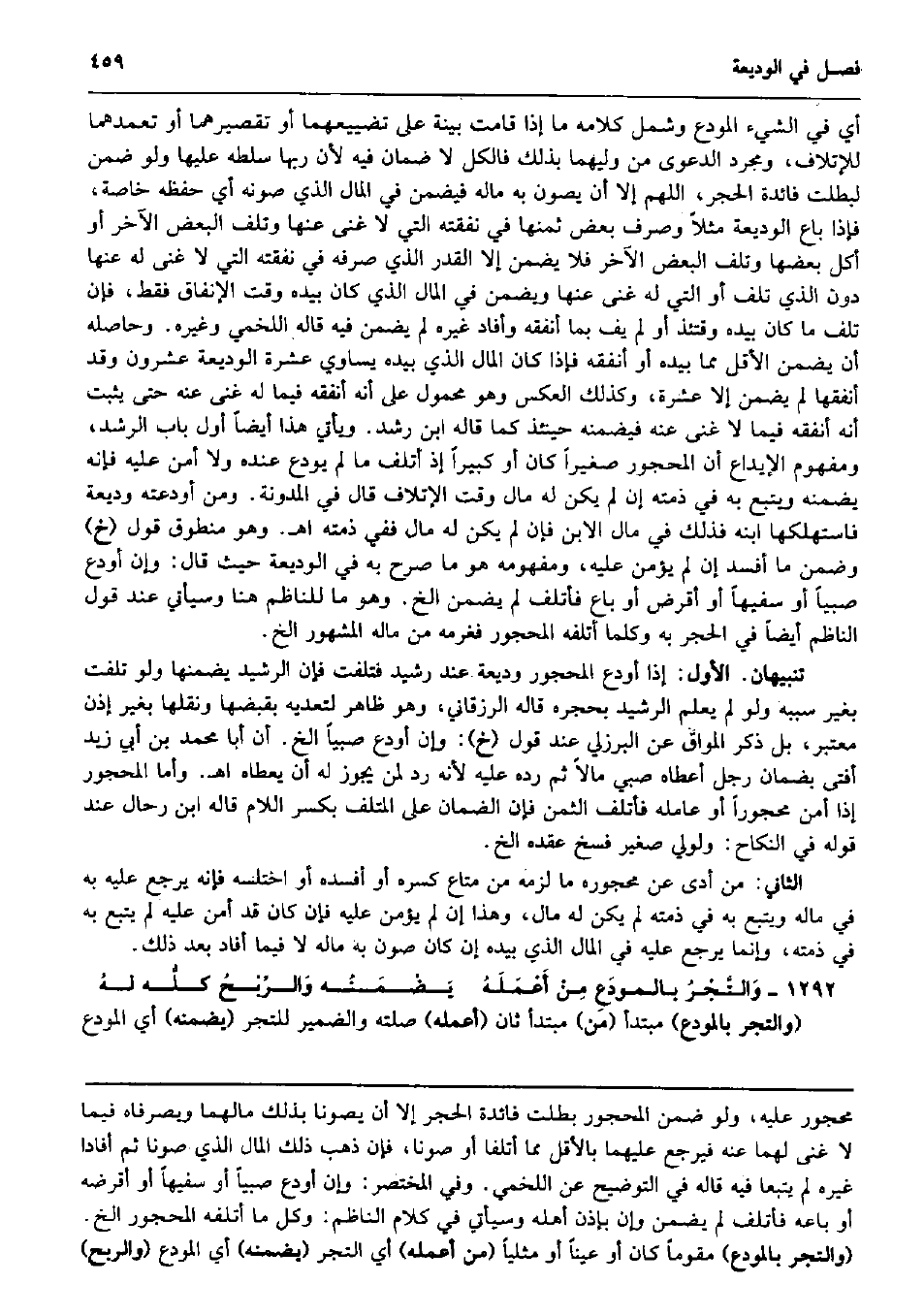 أَي فِي الشَّيْء الْمُودع والمعار (للسفيه) أَي عَلَيْهِ فالللام بِمَعْنى (على) كَقَوْلِه تَعَالَى: وَإِن أسأتم فلهَا} (الْإِسْرَاء: 7) (وَلَا) على. (الصَّغِير) ، الْمُمَيز وَأَحْرَى غَيره (مَعَ ضيَاع فِيهِ) أَي فِي الشَّيْء الْمُودع وَشَمل كَلَامه مَا إِذا قَامَت بَيِّنَة على تضييعهما أَو تقصيرهما أَو تعمدهما للإتلاف، وَمُجَرَّد الدَّعْوَى من وليهما بذلك فَالْكل لَا ضَمَان فِيهِ لِأَن رَبهَا سلطه عَلَيْهَا وَلَو ضمن لبطلت فَائِدَة الْحجر، اللَّهُمَّ إِلَّا أَن يصون بِهِ مَاله فَيضمن فِي المَال الَّذِي صونه أَي حفظه خَاصَّة، فَإِذا بَاعَ الْوَدِيعَة مثلا وَصرف بعض ثمنهَا فِي نَفَقَته الَّتِي لَا غنى عَنْهَا وَتلف الْبَعْض الآخر أَو أكل بَعْضهَا وَتلف الْبَعْض الآخر فَلَا يضمن إِلَّا الْقدر الَّذِي صرفه فِي نَفَقَته الَّتِي لَا غنى لَهُ عَنْهَا دون الَّذِي تلف أَو الَّتِي لَهُ غنى عَنْهَا وَيضمن فِي المَال الَّذِي كَانَ بِيَدِهِ وَقت الْإِنْفَاق فَقَط، فَإِن تلف مَا كَانَ بِيَدِهِ وقتئذ أَو لم يَفِ بِمَا أنفقهُ وَأفَاد غَيره لم يضمن فِيهِ قَالَه اللَّخْمِيّ وَغَيره. وَحَاصِله أَن يضمن الْأَقَل مِمَّا بِيَدِهِ أَو أنفقهُ فَإِذا كَانَ المَال الَّذِي بِيَدِهِ يُسَاوِي عشرَة الْوَدِيعَة عشرُون وَقد أنفقها لم يضمن إِلَّا عشرَة، وَكَذَلِكَ الْعَكْس وَهُوَ مَحْمُول على أَنه أنفقهُ فِيمَا لَهُ غنى عَنهُ حَتَّى يثبت أَنه أنفقهُ فِيمَا لَا غنى عَنهُ فَيضمنهُ حِينَئِذٍ كَمَا قَالَه ابْن رشد. وَيَأْتِي هَذَا أَيْضا أول بَاب الرشد، وَمَفْهُوم الْإِيدَاع أَن الْمَحْجُور صَغِيرا كَانَ أَو كَبِيرا إِذْ أتلف مَا لم يودع عِنْده وَلَا أَمن عَلَيْهِ فَإِنَّهُ يضمنهُ وَيتبع بِهِ فِي ذمَّته إِن لم يكن لَهُ مَال وَقت الْإِتْلَاف قَالَ فِي الْمُدَوَّنَة. وَمن أودعته وَدِيعَة فاستهلكها ابْنه فَذَلِك فِي مَال الابْن فَإِن لم يكن لَهُ مَال فَفِي ذمَّته اه. وَهُوَ مَنْطُوق قَول (خَ) وَضمن مَا أفسد إِن لم يُؤمن عَلَيْهِ، وَمَفْهُومه هُوَ مَا صرح بِهِ فِي الْوَدِيعَة حَيْثُ قَالَ: وَإِن أودع صَبيا أَو سَفِيها أَو أقْرض أَو بَاعَ فأتلف لم يضمن الخ. وَهُوَ مَا للناظم هُنَا وَسَيَأْتِي عِنْد قَول النَّاظِم أَيْضا فِي الْحجر بِهِ وَكلما أتْلفه الْمَحْجُور فغرمه من مَاله الْمَشْهُور الخ. تَنْبِيهَانِ. الأول: إِذا أودع الْمَحْجُور وَدِيعَة عِنْد رشيد فَتلفت فَإِن الرشيد يضمنهَا وَلَو تلفت بِغَيْر سَببه وَلَو لم يعلم الرشيد بحجره قَالَه الرزقاني وَهُوَ ظَاهر لتعديه بقبضها ونقلها بِغَيْر إِذن مُعْتَبر، بل ذكر الْمواق عَن الْبُرْزُليّ عِنْد قَول (خَ) : وَإِن أودع صَبيا الخ. أَن أَبَا مُحَمَّد بن أبي زيد أفتى بِضَمَان رجل أعطَاهُ صبي مَالا ثمَّ رده عَلَيْهِ لِأَنَّهُ رد لمن يجوز لَهُ أَن يعطاه اه. وَأما الْمَحْجُور إِذا أَمن مَحْجُورا أَو عَامله فأتلف الثّمن فَإِن الضَّمَان على الْمُتْلف بِكَسْر اللَّام قَالَه ابْن رحال عِنْد قَوْله فِي النِّكَاح: ولولي صَغِير فسخ عقده الخ. الثَّانِي: من أدّى عَن مَحْجُوره مَا لزمَه من مَتَاع كَسره أَو أفْسدهُ أَو اختلسه فَإِنَّهُ يرجع عَلَيْهِ بِهِ فِي مَاله وَيتبع بِهِ فِي ذمَّته لم يكن لَهُ مَال، وَهَذَا إِن لم يُؤمن عَلَيْهِ فَإِن كَانَ قد أَمن عَلَيْهِ لم يتبع بِهِ فِي ذمَّته، وَإِنَّمَا يرجع عَلَيْهِ فِي المَال الَّذِي بِيَدِهِ إِن كَانَ صون بِهِ مَاله لَا فِيمَا أَفَادَ بعد ذَلِك. وَالتَّجْرُ بالمودَعِ مِنْ أَعْمَلَهُ يَضْمَنُه وَالرِّبْحُ كلُّه لهُ (والتجر بالمودع) مُبْتَدأ (من) مُبْتَدأ ثَان (أعمله) صلته وَالضَّمِير للتجر (يضمنهُ) أَي الْمُودع