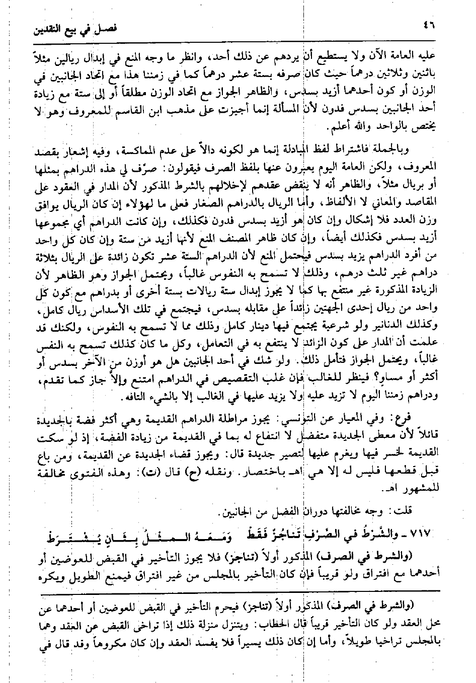 عَلَيْهِ الْعَامَّة الْآن وَلَا يَسْتَطِيع أَن يردهم عَن ذَلِك أحد، وَانْظُر مَا وَجه الْمَنْع فِي إِبْدَال ريالين مثلا بِاثْنَيْنِ وَثَلَاثِينَ درهما حَيْثُ كَانَ صرفه بِسِتَّة عشر درهما كَمَا فِي زمننا هَذَا مَعَ اتِّحَاد الْجَانِبَيْنِ فِي الْوَزْن أَو كَون أَحدهمَا أَزِيد بسدس، وَالظَّاهِر الْجَوَاز مَعَ اتِّحَاد الْوَزْن مُطلقًا أَو إِلَى سِتَّة مَعَ زِيَادَة أحد الْجَانِبَيْنِ بسدس فدون لِأَن الْمَسْأَلَة إِنَّمَا أجيزت على مَذْهَب ابْن الْقَاسِم للمعروف وَهُوَ لَا يخْتَص بِالْوَاحِدِ وَالله أعلم. وَبِالْجُمْلَةِ فاشتراط لفظ الْمُبَادلَة إِنَّمَا هُوَ لكَونه دَالا على عدم المماكسة، وَفِيه إِشْعَار بِقصد الْمَعْرُوف، وَلَكِن الْعَامَّة الْيَوْم يعبرون عَنْهَا بِلَفْظ الصّرْف فَيَقُولُونَ: صرِّف لي هَذِه الدَّرَاهِم بِمِثْلِهَا أَو بريال مثلا، وَالظَّاهِر أَنه لَا ينْقض عقدهم لإخلالهم بِالشّرطِ الْمَذْكُور لِأَن الْمدَار فِي الْعُقُود على الْمَقَاصِد والمعاني لَا الْأَلْفَاظ، وَأما الريال بِالدَّرَاهِمِ الصغار فعلى مَا لهَؤُلَاء إِن كَانَ الريال يُوَافق وزن الْعدَد فَلَا إِشْكَال وَإِن كَانَ هُوَ أَزِيد بسدس فدون فَكَذَلِك، وَإِن كَانَت الدَّرَاهِم أَي مجموعها أَزِيد بسدس فَكَذَلِك أَيْضا، وَإِن كَانَ ظَاهر المُصَنّف الْمَنْع لِأَنَّهَا أَزِيد من سِتَّة وَإِن كَانَ كل وَاحِد من أفرد الدَّرَاهِم يزِيد بسدس فَيحْتَمل الْمَنْع لِأَن الدَّرَاهِم السِّتَّة عشر تكون زَائِدَة على الريال بِثَلَاثَة دَرَاهِم غير ثلث دِرْهَم، وَذَلِكَ لَا تسمح بِهِ النُّفُوس غَالِبا، وَيحْتَمل الْجَوَاز وَهُوَ الظَّاهِر لِأَن الزِّيَادَة الْمَذْكُورَة غير منتفع بهَا كَمَا لَا يجوز إِبْدَال سِتَّة ريالات بِسِتَّة أُخْرَى أَو بِدَرَاهِم مَعَ كَون كل وَاحِد من ريال إِحْدَى الْجِهَتَيْنِ زَائِدا على مُقَابِله بسدس، فيجتمع فِي تِلْكَ الأسداس ريال كَامِل، وَكَذَلِكَ الدَّنَانِير وَلَو شَرْعِيَّة يجْتَمع فِيهَا دِينَار كَامِل وَذَلِكَ مِمَّا لَا تسمح بِهِ النُّفُوس، وَلَكِنَّك قد علمت أَن الْمدَار على كَون الزَّائِد لَا ينْتَفع بِهِ فِي التَّعَامُل، وكل مَا كَانَ كَذَلِك تسمح بِهِ النَّفس غَالِبا، وَيحْتَمل الْجَوَاز فَتَأمل ذَلِك. وَلَو شكّ فِي أحد الْجَانِبَيْنِ هَل هُوَ أوزن من الآخر بسدس أَو أَكثر أَو مساوٍ؟ فَينْظر للْغَالِب فَإِن غلب التقصيص فِي الدَّرَاهِم امْتنع وإلاَّ جَازَ كَمَا تقدم، ودراهم زمننا الْيَوْم لَا تزيد عَلَيْهِ وَلَا يزِيد عَلَيْهَا فِي الْغَالِب إِلَّا بالشَّيْء التافه. فرع: وَفِي المعيار عَن التّونسِيّ: يجوز مراطلة الدَّرَاهِم الْقَدِيمَة وَهِي أَكثر فضَّة بالجديدة قَائِلا لِأَن معطى الجديدة متفضل لَا انْتِفَاع لَهُ بِمَا فِي الْقَدِيمَة من زِيَادَة الْفضة، إِذْ لَو سكت الْقَدِيمَة لخسر فِيهَا وَيغرم عَلَيْهَا لتصير جَدِيدَة قَالَ: وَيجوز قَضَاء الجديدة عَن الْقَدِيمَة، وَمن بَاعَ قبل قطعهَا فَلَيْسَ لَهُ إِلَّا هِيَ اه بِاخْتِصَار. وَنَقله (ح) قَالَ (ت) : وَهَذِه الْفَتْوَى مُخَالفَة للمشهور اه. قلت: وَجه مخالفتها دوران الْفضل من الْجَانِبَيْنِ. والشَّرْطُ فِي الصَّرْفِ تَناجُزٌ فَقَطْ وَمَعَهُ المثْلُ بِثَانٍ يُشْتَرَطْ (وَالشّرط فِي الصّرْف) الْمَذْكُور أَولا (تناجز) فَلَا يجوز التَّأْخِير فِي الْقَبْض للعوضين أَو أَحدهمَا مَعَ افْتِرَاق وَلَو قَرِيبا فَإِن كَانَ التَّأْخِير بِالْمَجْلِسِ من غير افْتِرَاق فَيمْنَع الطَّوِيل وَيكرهُ