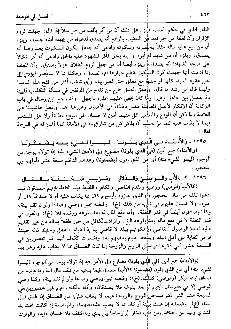 النَّادِر الَّذِي فِي حكم الْعَدَم، فَيلْزم على ذَلِك أَن من أقرّ بِأَلف من خمر مثلا إِذا قَالَ: جهلت لُزُوم الْإِقْرَار وَأَن لَفْظَة من خمر تعد من التعقيب بالرافع أَنه يصدق لدعواه من يجهله أَبنَاء جنسه، وَيلْزم أَن من بيع عَلَيْهِ مَاله مثلا بِحَضْرَتِهِ وسكوته وَادّعى أَنه جَاهِل بِكَوْن السُّكُوت يعد رضَا أَنه يصدق، وَيلْزم أَن من شهد لَهُ أَبوهُ أَو ابْنه بِحَق فَأقر الْمَشْهُود عَلَيْهِ بِالْحَقِّ وَادّعى أَنه أقرّ اتكالاً على صِحَة الشَّهَادَة أَنه يصدق، وَيلْزم أَيْضا أَن من جهل لُزُوم الطَّلَاق هزلا يصدق، وَأَن الْمُعتقَة إِذا ادَّعَت أَنَّهَا جهلت كَون التَّمْكِين يقطع خِيَارهَا أَنَّهَا تصدق، وَهَكَذَا مِمَّا لَا ينْحَصر فَيُؤَدِّي إِلَى حل عُقُود الْعَوام كلهَا أَو جلها مَعَ تعلق حق الْغَيْر بهَا، وَأي شغب أَكثر من فتح هَذَا الْبَاب وَلِهَذَا قَالَ ابْن رشد مَا قَالَ، وَأطلق الْعَمَل جَمِيع من تقدم من الموثقين فِي مَسْأَلَة التَّكْذِيب للبينة وَلم يفصل بَين جَاهِل وَغَيره وَمَا كَانَ يخفى عَلَيْهِم عذره بِالْجَهْلِ. وَقد رجح ابْن رحال فِي بَاب الْوكَالَة أَن الْإِنْكَار لأصل الْمُعَامَلَة مُضر مُطلقًا فِي الْأُصُول وَغَيرهَا اه. وَانْظُر حاشيتنا على اللامية وَلما ذكر أَن الْمُودع وَالْمُسْتَعِير كل مِنْهُمَا أَمِين لَا ضَمَان على الْمُودع مُطلقًا وَلَا على الْمُسْتَعِير فِيمَا لَا يُغَاب عَلَيْهِ كَمَا مرَّ ناسب أَن يذكر كل من شاركهما فِي الْأَمَانَة كَمَا أَشَارَ لَهُ فِي التَّرْجَمَة فَقَالَ: وَالأُمنَاءُ فِي الّذِي يَلُونا لَيْسُوا لشيءٍ مِنه يَضْمنُونَا (والأمناء) جمع أَمِين (فِي الَّذِي يلونا) مضارع ولي الْأمين الشَّيْء يَلِيهِ إِذا تولاه بِوَجْه من الْوُجُوه (لَيْسُوا لشَيْء مِنْهُ) أَي من الَّذِي يلون (يضمنونا) وعدهم النَّاظِم سَبْعَة عشر فأولهم ولي الْمَحْجُور. كالأَبِ وَالوصِيِّ وَالدَّلاَلِ ومُرْسِلِ صُحْبَتَهُ بالمَال (كَالْأَبِ وَالْوَصِيّ) ووصيه ومقدم القَاضِي وَالْكَافِر واللقيط فِيمَا التقطه فَإِنَّهُم مصدقون فِيمَا ادعوا تلفه من مَال الْمَحْجُور، وَالَّذِي حازوه بِأَيْدِيهِم كَانَ مِمَّا يُغَاب عَلَيْهِ أم لَا صَدَاقا كَانَ أَو غَيره، وَلَا ضَمَان عَلَيْهِم فِي شَيْء من ذَلِك (خَ) : وَقَبضه مجبر ووصي وصدقا وَلَو لم تقم بَيِّنَة، وَكَذَا يصدقون أَيْضا فِي قدر النَّفَقَة، وَأما دفع المَال لَهُ بعد بُلُوغه ورشده فَلَا (خَ) : وَالْقَوْل فِي قدر النَّفَقَة لَا فِي دفع مَاله بعد بُلُوغه الخ. وَالْمرَاد بالكافل من حَاز طفْلا بِمَالِه من غير تَقْدِيم عَلَيْهِ لعدم الْوُصُول للْقَاضِي أَو لكَوْنهم بِبَلَد لَا قَاضِي بهَا إِذْ الْقيام بالطفل وَحفظ مَاله حِينَئِذٍ فرض كِفَايَة على أهل الْبَلَد وَيسْقط بِقِيَام بَعضهم بِهِ، وأشعرت الْكَاف أَنهم غير مَحْصُورين فِي السَّبْعَة عشر الَّتِي ذكرهَا فَيدْخل الزَّوْج وَالزَّوْجَة إِذا كَانَ الصَدَاق مِمَّا لَا يُغَاب عَلَيْهِ وَهُوَ بيد