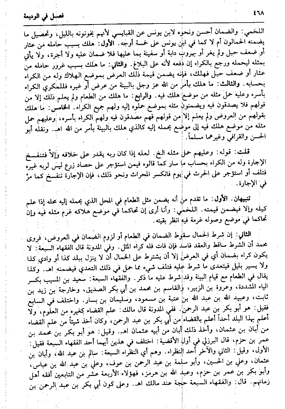 اللَّخْمِيّ: وَالضَّمان أحسن وَنَحْوه لِابْنِ يُونُس عَن القبايسي لأَنهم يخونونه بِاللَّيْلِ، وَتَحْصِيل مَا يضمنهُ الحمالون أم لَا كَمَا فِي ابْن يُونُس على خَمْسَة أوجه. الأول: هلك بِسَبَب حامله من عثار أَو ضعف حَبل وَلم يغر أَو بهروب دَابَّة أَو سفينة بِمَا عَلَيْهَا فَلَا ضَمَان عَلَيْهِ وَلَا أُجْرَة، وَلَا يَأْتِي بِمثلِهِ ليحمله وَرجع بالكراء إِن دَفعه لِأَنَّهُ على الْبَلَاغ. وَالثَّانِي: مَا هلك بِسَبَب غرور حامله من عثار أَو ضعف حَبل فَهَلَك، فَإِنَّهُ يضمن قيمَة ذَلِك الْعرض بِموضع الْهَلَاك وَله من الْكِرَاء بِحِسَابِهِ. وَالثَّالِث: مَا هلك بِأَمْر من الله عز وَجل بِالْبَيِّنَةِ من عرض أَو غَيره فللمكري الْكِرَاء بأسره وَعَلِيهِ حمل مثله من مَوضِع هلك فِيهِ. وَالرَّابِع: مَا هلك من الطَّعَام وَلم يعلم ذَلِك إِلَّا من قَوْلهم فَلَا يصدقون فِيهِ ويضمنون مثله بِموضع حملوه إِلَيْهِ وَلَهُم جَمِيع الْكِرَاء. الْخَامِس: مَا هلك بقَوْلهمْ من الْعرُوض وَلم يعلم إِلَّا من قَوْلهم فهم مصدقون فِيهِ وَلَهُم الْكِرَاء بأسره، وَعَلَيْهِم حمل مثله من مَوضِع هلك فِيهِ إِلَى مَوضِع يحملهُ إِلَيْهِ كَالَّذي هلك بِالْبَيِّنَةِ بِأَمْر من الله اه. وَنَقله أَبُو الْحسن والقرافي وَغَيرهمَا مُسلما. قلت: قَوْله: وَعَلَيْهِم حمل مثله الخ. لَعَلَّه إِذا كَانَ ربه يقدر على خِلَافه وإلاَّ فتنفسخ الْإِجَارَة وَله من الْكِرَاء بِحِسَاب مَا سَار كَمَا قَالُوهُ فِيمَن اُسْتُؤْجِرَ على حصاد زرع لَيْسَ لرَبه غَيره فَتلف أَو اُسْتُؤْجِرَ على الْحَرْث فِي يَوْم فانكسر المحراث وَنَحْو ذَلِك، فَإِن الْإِجَارَة تَنْفَسِخ كَمَا مرَّ فِي الْإِجَارَة. تَنْبِيهَانِ. الأول: مَا تقدم من أَنه يضمن مثل الطَّعَام فِي الْمحل الَّذِي يحملهُ إِلَيْهِ مَحَله إِذا علم كَيْله وَإِلَّا فَيضمن قِيمَته. اللَّخْمِيّ: وَأَنا أرى إِن تحاكما فِي مَوضِع هَلَاكه غرم مثله فِيهِ وَإِن تحاكما فِي مَوضِع وُصُوله غرمة فِيهِ انْظُر بَقِيَّته. الثَّانِي: إِن شَرط الْحمال سُقُوط الضَّمَان فِي الطَّعَام أَو لُزُوم الضَّمَان فِي الْعرُوض، فروى مُحَمَّد أَن الشَّرْط سَاقِط وَالْعقد فَاسد فَإِن فَاتَ فَلهُ كِرَاء الْمثل. وَفِي الْمُدَوَّنَة قَالَ الْفُقَهَاء السَّبْعَة: لَا يكون كِرَاء بِضَمَان أَي فِي الْعرض إِلَّا أَن يشْتَرط على الْحمال أَن لَا ينزل بِبَلَد كَذَا أَو وَادي كَذَا وَلَا يسير بلَيْل فيتعدى مَا شَرط عَلَيْهِ فَتلف شَيْء مِمَّا حمل فِي ذَلِك التَّعَدِّي فَيضمنهُ اه. وَكَذَا يُقَال فِي الطَّعَام مَعَ قيام الْبَيِّنَة وَقد شَرط عَلَيْهِ مَا ذكر. وَالْفُقَهَاء السَّبْعَة: سعيد بن الْمسيب بِكَسْر الْيَاء الْمُشَدّدَة، وَعُرْوَة بن الزبير، وَالقَاسِم بن مُحَمَّد بن أبي بكر الصّديق، وخارجة بن زيد بن ثَابت، وَعبيد الله بن عبد الله بن عتبَة بن مَسْعُود، وَسليمَان بن بسار. وَاخْتلف فِي السَّابِع فَقيل: هُوَ أَبُو بكر بن عبد الرَّحْمَن. فَفِي الْمُدَوَّنَة قَالَ مَالك: علم الْقَضَاء كَغَيْرِهِ من الْعُلُوم، وَلَا أعلم بِهَذَا الْبَلَد أحدا أعلم بِالْقضَاءِ من أبي بكر بن عبد الرَّحْمَن، وَكَانَ أَخذ شَيْئا من علم الْقَضَاء من أبان بن عُثْمَان، وَأخذ ذَلِك أبان من أَبِيه عُثْمَان اه. وَقيل: هُوَ أَبُو بكر بن مُحَمَّد بن عمر بن حزم، قَالَ الْبُرْزُليّ فِي أول الْأَقْضِيَة: اخْتلف فِي هذَيْن أَيهمَا أحد الْفُقَهَاء السَّبْعَة فَقيل: الأول، وَقيل: الثَّانِي وَالْآخر أحد النظراء. وهم أَي النظراء السَّبْعَة: سَالم بن عبد الله، وَأَبَان بن عُثْمَان، وَعلي بن الْحُسَيْن، وَأَبُو سَلمَة بن عبد الرَّحْمَن بن عَوْف، وَعلي بن عبد الله بن عَبَّاس، وَأَبُو بكر بن عمر بن حزم، وَعبد الله بن هُرْمُز، فَهَؤُلَاءِ الْأَرْبَعَة عشر من التَّابِعين أفقه أهل زمانهم. قَالَ: وَالْفُقَهَاء ا