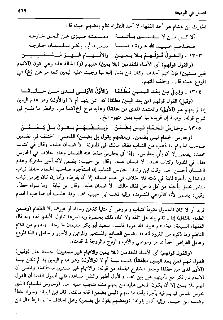 الْحَارِث بن هِشَام هُوَ أحد الْفُقَهَاء لَا أحد النظراء نظم بَعضهم حَيْثُ قَالَ: أَلا كل من لَا يقْتَدى بأئمة فقسمته ضيزى عَن الْحق خَارجه فخذهم عبيد الله عُرْوَة قاسما سعيد أَبَا بكر سُلَيْمَان خَارجه والقولُ قَوْلُهُمْ بِلَا يمينِ والاتِّهام غَيْرُ مُسْتَبينِ (وَالْقَوْل قَوْلهم) أَي الْأُمَنَاء الْمُتَقَدِّمين (بِلَا يَمِين) عَلَيْهِم (و) الْحَالة هَذِه وَهِي كَون (الاتهام غير مستبين) فَإِن اتهمَ أحدهم وَكَانَ مِمَّن يشار إِلَيْهِ بهَا وَجَبت عَلَيْهِ الْيَمين كَمَا مر عَن (خَ) فِي الْمُودع حَيْثُ قَالَ: وَحلف الْمُتَّهم. وقِيلَ مِنْ بَعْدِ اليمينِ مُطْلَقا وَالأَوَّلُ الأَوْلى لَدَى مَن حَقّقَا (وَقيل) القَوْل قَوْلهم (من بعد الْيَمين مُطلقًا) كَانَ مِمَّن يتهم أم لَا (وَالْأول) وَهُوَ عدم الْيَمين إِذا لم يتهم هُوَ (الأولى) وَالْمُعْتَمد (لَدَى من حققا) وَعَلِيهِ درج (خَ) كَمَا مر. وَانْظُر مَا تقدم فِي شرح قَوْله: وتهمة إِن قويت بهَا تجب يَمِين متهوم الخ. وَحَارِسُ الحَمَّامِ لَيْسَ يَضْمَنُ وَبَعْضُهُمْ يقولُ بلْ يُضَمَّنُ (وحارس الْحمام لَيْسَ يضمن. وَبَعْضهمْ يَقُول بل يضمن) اللَّخْمِيّ: اخْتلف فِي تضمين صَاحب الْحمام مَا ذهب من الثِّيَاب فَقَالَ مَالك فِي الْمُدَوَّنَة: لَا ضَمَان عَلَيْهِ، وَقَالَ فِي كتاب مُحَمَّد: يضمن إِلَّا أَن يَأْتِي بحارس، وَإِذا أُتِي بحارس سقط عَنهُ الضَّمَان وَعَاد الْخلاف فِي الحارس فَقَالَ فِي الْمُدَوَّنَة وَكتاب مُحَمَّد: لَا ضَمَان عَلَيْهِ. وَقَالَ ابْن حبيب: يضمن لِأَنَّهُ أجِير مُشْتَرك وَعدم الضَّمَان أحسن اه. وَقَالَ ابْن رشد: حارس الثِّيَاب إِن اسْتَأْجرهُ صَاحب الْحمام لحفظ ثِيَاب الداخلين بِأُجْرَة ثَابِتَة فِي ذمَّته فَلَا خلاف فِي عدم ضَمَانه إِلَّا أَن يفرط، وَأما إِن كَانَ يحرس ثِيَاب النَّاس يجمل بِأَخْذِهِ من كل دَاخل فَقَالَ مَالك: لَا ضَمَان عَلَيْهِ. وَقَالَ ابْن لبَابَة: وَمَا سواهُ خطأ. وَقيل: يضمن لِأَنَّهُ كَالرَّاعِي الْمُشْتَرك، وَإِلَيْهِ ذهب ابْن حبيب اه. وَقد علمت أَن صَاحب الْحمام