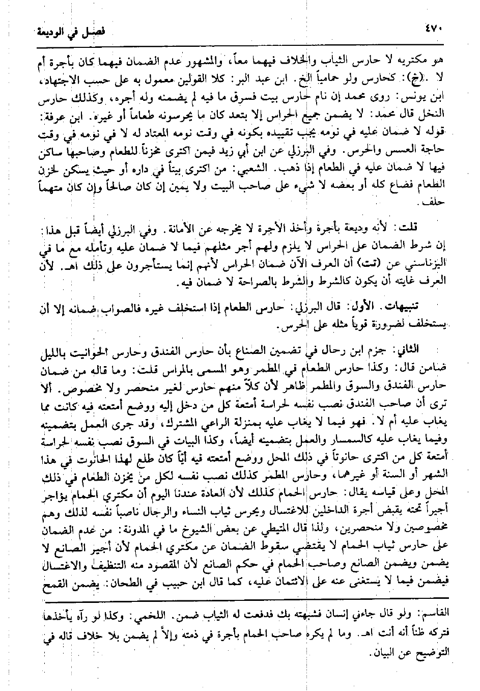 هُوَ مكتريه لَا حارس الثِّيَاب وَالْخلاف فيهمَا مَعًا، وَالْمَشْهُور عدم الضَّمَان فيهمَا كَانَ بِأُجْرَة أم لَا. (خَ) : كحارس وَلَو حمامياً الخ. ابْن عبد الْبر: كلا الْقَوْلَيْنِ مَعْمُول بِهِ على حسب الِاجْتِهَاد، ابْن يُونُس: روى مُحَمَّد إِن نَام حارس بَيت فَسرق مَا فِيهِ لم يضمنهُ وَله أجره، وَكَذَلِكَ حارس النّخل قَالَ مُحَمَّد: لَا يضمن جَمِيع الحراس إِلَّا بتعد كَانَ مَا يحرسونه طَعَاما أَو غَيره. ابْن عَرَفَة: قَوْله لَا ضَمَان عَلَيْهِ فِي نَومه يجب تَقْيِيده بِكَوْنِهِ فِي وَقت نَومه الْمُعْتَاد لَهُ لَا فِي نَومه فِي وَقت حَاجَة العسس والحرس. وَفِي الْبُرْزُليّ عَن ابْن أبي زيد فِيمَن اكترى مخزناً للطعام وصاحبها سَاكن فِيهَا لَا ضَمَان عَلَيْهِ فِي الطَّعَام إِذا ذهب. الشّعبِيّ: من اكترى بَيْتا فِي دَاره أَو حَيْثُ يسكن لخزن الطَّعَام فَضَاعَ كُله أَو بعضه لَا شَيْء على صَاحب الْبَيْت وَلَا يَمِين إِن كَانَ صَالحا وَإِن كَانَ مُتَّهمًا حلف. قلت: لِأَنَّهُ وَدِيعَة بِأُجْرَة وَأخذ الْأُجْرَة لَا يُخرجهُ عَن الْأَمَانَة. وَفِي الْبُرْزُليّ أَيْضا قبل هَذَا: إِن شَرط الضَّمَان على الحراس لَا يلْزم وَلَهُم أجر مثلهم فِيمَا لَا ضَمَان عَلَيْهِ وتأمله مَعَ مَا فِي اليزناسني عَن (تت) أَن الْعرف الْآن ضَمَان الحراس لأَنهم إِنَّمَا يستأجرون على ذَلِك اه. لِأَن الْعرف غَايَته أَن يكون كالشرط وَالشّرط بالصراحة لَا ضَمَان فِيهِ. تَنْبِيهَات. الأول: قَالَ الْبُرْزُليّ: حارس الطَّعَام إِذا اسْتخْلف غَيره فَالصَّوَاب ضَمَانه إِلَّا أَن يسْتَخْلف لضَرُورَة قَوِيا مثله على الحرس. الثَّانِي: جزم ابْن رحال فِي تضمين الصناع بِأَن حارس الفندق وحارس الحوانيت بِاللَّيْلِ ضَامِن قَالَ: وَكَذَا حارس الطَّعَام فِي المطمر وَهُوَ الْمُسَمّى بالمراس قلت: وَمَا قَالَه من ضَمَان حارس الفندق والسوق والمطمر ظَاهر لِأَن كلا مِنْهُم حارس لغير منحصر وَلَا مَخْصُوص. أَلا ترى أَن صَاحب الفندق نصب نَفسه لحراسة أَمْتعَة كل من دخل إِلَيْهِ وَوضع أمتعته فِيهِ كَانَت مِمَّا يُغَاب عَلَيْهِ أم لَا. فَهُوَ فِيمَا لَا يُغَاب عَلَيْهِ بِمَنْزِلَة الرَّاعِي الْمُشْتَرك، وَقد جرى الْعَمَل بتضمينه وَفِيمَا يُغَاب عَلَيْهِ كالسمسار وَالْعَمَل بتضمينه أَيْضا، وَكَذَا البيات فِي السُّوق نصب نَفسه لحراسة أَمْتعَة كل من اكترى حانوتاً فِي ذَلِك الْمحل وَوضع أمتعته فِيهِ أيّاً كَانَ طلع لهَذَا الْحَانُوت فِي هَذَا الشَّهْر أَو السّنة أَو غَيرهمَا، وحارس المطمر كَذَلِك نصب نَفسه لكل من يخزن الطَّعَام فِي ذَلِك الْمحل وعَلى قِيَاسه يُقَال: حارس الْحمام كَذَلِك لِأَن الْعَادة عندنَا الْيَوْم أَن مكتري الْحمام يُؤَاجر أَجِيرا تَحْتَهُ يقبض أُجْرَة الداخلين للاغتسال ويحرس ثِيَاب النِّسَاء وَالرِّجَال ناصباً نَفسه لذَلِك وهم مخصوصين وَلَا منحصرين، وَلذَا قَالَ المتيطي عَن بعض الشُّيُوخ مَا فِي الْمُدَوَّنَة: من عدم الضَّمَان على حارس ثِيَاب الْحمام لَا يَقْتَضِي سُقُوط الضَّمَان عَن مكتري الْحمام لِأَن أجِير الصَّانِع لَا يضمن وَيضمن الصَّانِع وَصَاحب الْحمام فِي حكم الصَّانِع لِأَن الْمَقْصُود مِنْهُ التَّنْظِيف والاغتسال فَيضمن فِيمَا لَا يسْتَغْنى عَنهُ على الائتمان عَلَيْهِ، كَمَا قَالَ ابْن حبيب فِي الطَّحَّان: يضمن الْقَمْح