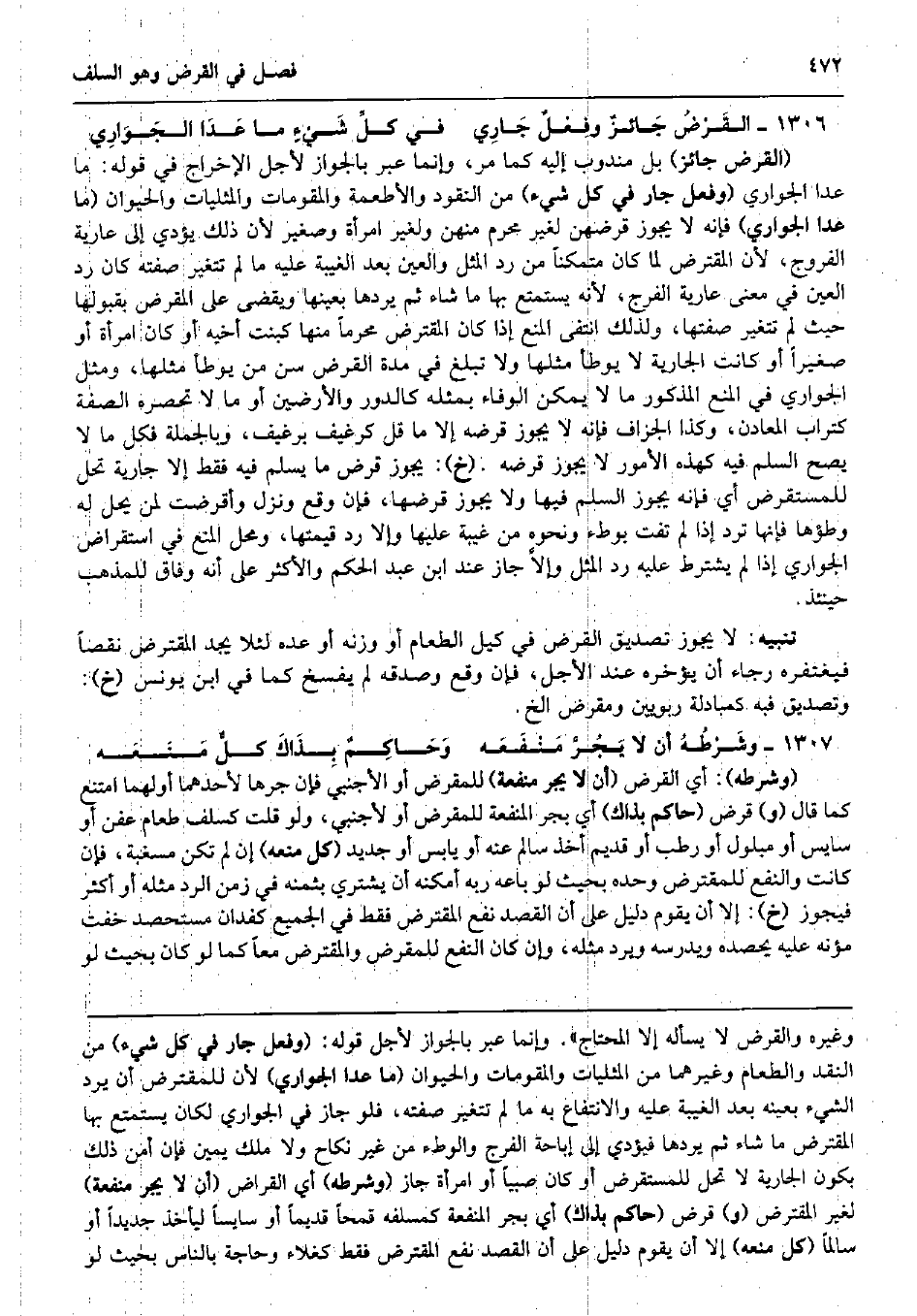 القَرْضُ جَائزٌ وفِعْلٌ جَارِي فِي كلِّ شَيْءٍ مَا عَدَا الجَوَارِي (الْقَرْض جَائِز) بل مَنْدُوب إِلَيْهِ كَمَا مر، وَإِنَّمَا عبر بِالْجَوَازِ لأجل الْإِخْرَاج فِي قَوْله: مَا عدا الْجَوَارِي (وَفعل جَار فِي كل شَيْء) من النُّقُود والأطعمة والمقومات والمثليات وَالْحَيَوَان (مَا عدا الْجَوَارِي) فَإِنَّهُ لَا يجوز قرضهن لغير محرم مِنْهُنَّ ولغير امْرَأَة وصغير لِأَن ذَلِك يُؤَدِّي إِلَى عَارِية الْفروج، لِأَن الْمُقْتَرض لما كَانَ مُتَمَكنًا من رد الْمثل وَالْعين بعد الْغَيْبَة عَلَيْهِ مَا لم تَتَغَيَّر صفته كَانَ رد الْعين فِي معنى عَارِية الْفرج، لِأَنَّهُ يسْتَمْتع بهَا مَا شَاءَ ثمَّ يردهَا بِعَينهَا وَيقْضى على الْمقْرض بقبولها حَيْثُ لم تَتَغَيَّر صفتهَا، وَلذَلِك انْتَفَى الْمَنْع إِذا كَانَ الْمُقْتَرض محرما مِنْهَا كَبِنْت أَخِيه أَو كَانَ امْرَأَة أَو صَغِيرا أَو كَانَت الْجَارِيَة لَا يُوطأ مثلهَا وَلَا تبلغ فِي مُدَّة الْقَرْض سنّ من يُوطأ مثلهَا، وَمثل الْجَوَارِي فِي الْمَنْع الْمَذْكُور مَا لَا يُمكن الْوَفَاء بِمثلِهِ كالدور وَالْأَرضين أَو مَا لَا تحصره الصّفة كتراب الْمَعَادِن، وَكَذَا الْجزَاف فَإِنَّهُ لَا يجوز قرضه إِلَّا مَا قل كرغيف برغيف، وَبِالْجُمْلَةِ فَكل مَا لَا يَصح السّلم فِيهِ كهذه الْأُمُور لَا يجوز قرضه. (خَ) : يجوز قرض مَا يسلم فِيهِ فَقَط إِلَّا جَارِيَة تحل للمستقرض أَي فَإِنَّهُ يجوز السّلم فِيهَا وَلَا يجوز قرضها، فَإِن وَقع وَنزل وأقرضت لمن يحل لَهُ وَطْؤُهَا فَإِنَّهَا ترد إِذا لم تفت بِوَطْء وَنَحْوه من غيبَة عَلَيْهَا وَإِلَّا رد قيمتهَا، وَمحل الْمَنْع فِي استقراض الْجَوَارِي إِذا لم يشْتَرط عَلَيْهِ رد الْمثل وإلاَّ جَازَ عِنْد ابْن عبد الحكم وَالْأَكْثَر على أَنه وفَاق للْمَذْهَب حِينَئِذٍ. تَنْبِيه: لَا يجوز تَصْدِيق الْقَرْض فِي كيل الطَّعَام أَو وَزنه أَو عده لِئَلَّا يجد الْمُقْتَرض نقصا فيغتفره رَجَاء أَن يُؤَخِّرهُ عِنْد الْأَجَل، فَإِن وَقع وَصدقه لم يفْسخ كَمَا فِي ابْن يُونُس (خَ) : وتصديق فبه كمبادلة ربويين ومقرض الخ. وشَرْطُهُ أَن لَا يَجُرَّ مَنْفَعَه وَحَاكِمٌ بِذَاكَ كلٌّ مَنَعَه (وَشَرطه) : أَي الْقَرْض (أَن لَا يجر مَنْفَعَة) للمقرض أَو الْأَجْنَبِيّ فَإِن جرها لأَحَدهمَا أَولهمَا امْتنع كَمَا قَالَ (و) قرض (حَاكم بِذَاكَ) أَي بجر الْمَنْفَعَة للمقرض أَو لأَجْنَبِيّ وَلَو قلت كسلف طَعَام عفن أَو سايس أَو مبلول أَو رطب أَو قديم أَخذ سَالم عَنهُ أَو يَابِس أَو جَدِيد (كل مَنعه) إِن لم تكن مسغبة، فَإِن كَانَت والنفع للمقترض وَحده بِحَيْثُ لَو