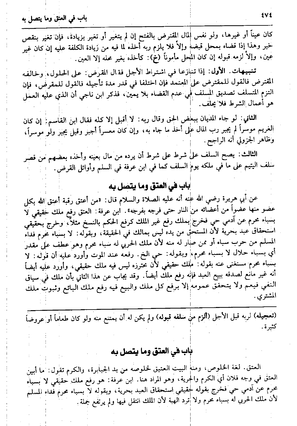 عَن أبي هُرَيْرَة رَضِي الله عَنهُ أَنه عَلَيْهِ الصَّلَاة وَالسَّلَام قَالَ: (من أعتق رَقَبَة أعتق الله بِكُل عُضْو مِنْهَا عضوا من أَعْضَائِهِ من النَّار حَتَّى فرجه بفرجه) . ابْن عَرَفَة: الْعتْق رفع ملك حَقِيقِيّ لَا بسباء محرم عَن آدَمِيّ حَيّ فَخرج بِملك رفع غير الْملك كرفع الحكم بالنسخ مثلا، وَخرج بحقيقي اسْتِحْقَاق عبد بحريّة لِأَن الْمُسْتَحق من يَده لَيْسَ بِمَالك فِي الْحَقِيقَة، وَبِقَوْلِهِ: لَا بسباء محرم فدَاء الْمُسلم من حَرْب سباه أَو مِمَّن صَار لَهُ مِنْهُ لِأَن ملك الْحَرْبِيّ لَهُ سباء محرم وَهُوَ عطف على مُقَدّر أَي بسباء حَلَال لَا بسباء محرم، وَبِقَوْلِهِ: حَيّ الخ. رَفعه عِنْد الْمَوْت وَأورد عَلَيْهِ أَن قَوْله: لَا بسباء محرم مُسْتَغْنى عَنهُ بقوله: ملك حَقِيقِيّ لِأَن مُحْتَرزه لَيْسَ فِيهِ ملك حَقِيقِيّ، وَأورد عَلَيْهِ أَيْضا أَنه غير مَانع لصدقه بِبيع العَبْد فَإِنَّهُ رفع ملك أَيْضا. وَقد يُجَاب عَن هَذَا الثَّانِي بِأَن ملك فِي سِيَاق النَّفْي فَيعم وَلَا يتَحَقَّق عُمُومه إِلَّا بِرَفْع كل ملك وَالْبيع فِيهِ رفع ملك البَائِع وَثُبُوت ملك المُشْتَرِي.