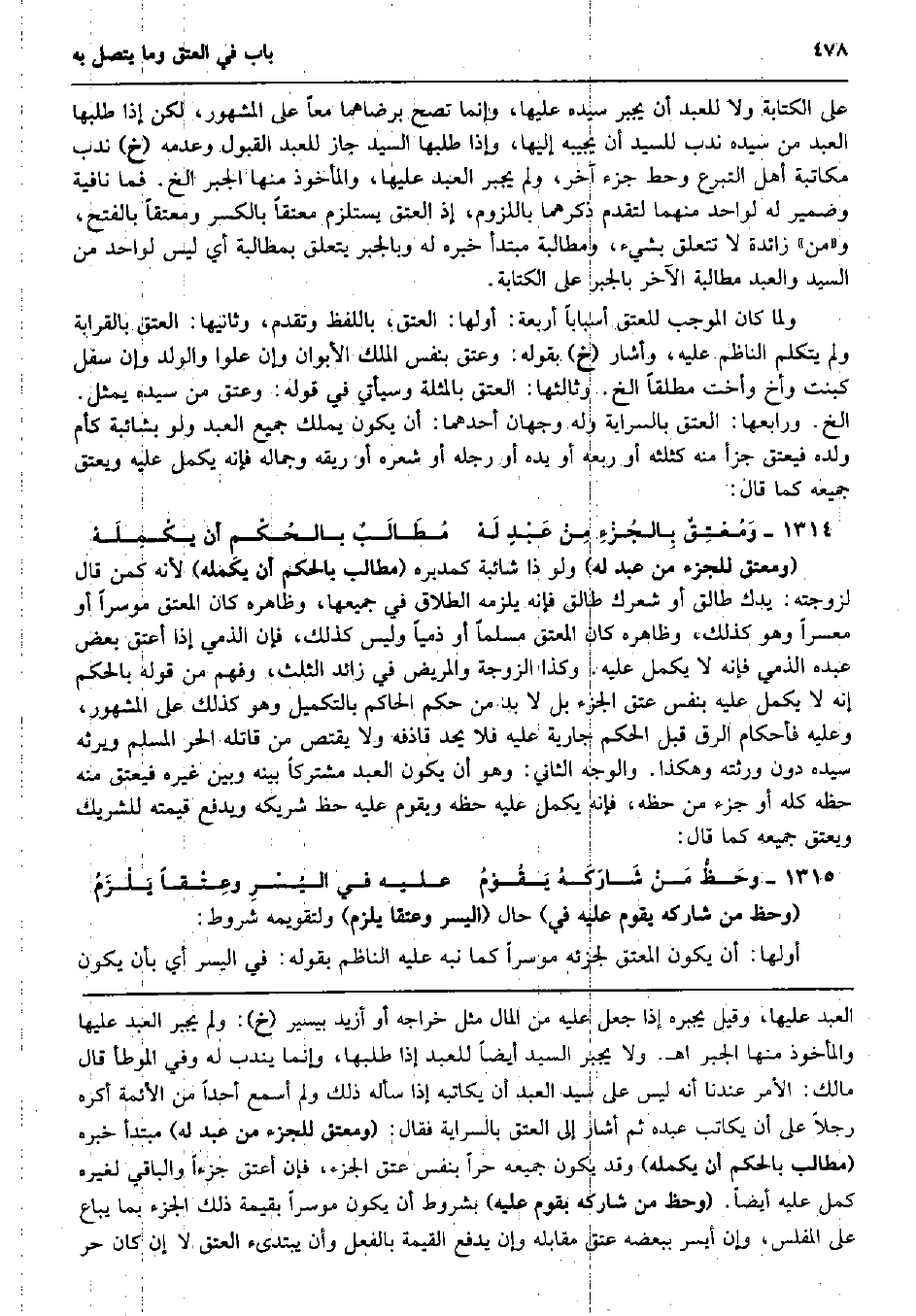 على الْكِتَابَة وَلَا للْعَبد أَن يجْبر سَيّده عَلَيْهَا، وَإِنَّمَا تصح برضاهما مَعًا على الْمَشْهُور، لَكِن إِذا طلبَهَا العَبْد من سَيّده ندب للسَّيِّد أَن يجِيبه إِلَيْهَا، وَإِذا طلبَهَا السَّيِّد جَازَ للْعَبد الْقبُول وَعَدَمه (خَ) ندب مُكَاتبَة أهل التَّبَرُّع وَحط جُزْء آخر، وَلم يجْبر العَبْد عَلَيْهَا، والمأخوذ مِنْهَا الْجَبْر الخ. فَمَا نَافِيَة وَضمير لَهُ لوَاحِد مِنْهُمَا لتقدم ذكرهمَا باللزوم، إِذْ الْعتْق يسْتَلْزم معتقاً بِالْكَسْرِ ومعتقاً بِالْفَتْح، و (من) زَائِدَة لَا تتَعَلَّق بِشَيْء، ومطالبة مُبْتَدأ خَبره لَهُ وبالجبر يتَعَلَّق بمطالبة أَي لَيْسَ لوَاحِد من السَّيِّد وَالْعَبْد مُطَالبَة الآخر بالجبر على الْكِتَابَة. وَلما كَانَ الْمُوجب لِلْعِتْقِ أسباباً أَرْبَعَة: أَولهَا: الْعتْق، بِاللَّفْظِ وَتقدم، وَثَانِيها: الْعتْق بِالْقَرَابَةِ وَلم يتَكَلَّم النَّاظِم عَلَيْهِ، وَأَشَارَ (خَ) بقوله: وَعتق بِنَفس الْملك الأبوان وَإِن علوا وَالْولد وَإِن سفل كَبِنْت وَأَخ وَأُخْت مُطلقًا الخ. وَثَالِثهَا: الْعتْق بالمثلة وَسَيَأْتِي فِي قَوْله: وَعتق من سَيّده يمثل. الخ. وَرَابِعهَا: الْعتْق بِالسّرَايَةِ وَله وَجْهَان أَحدهمَا: أَن يكون يملك جَمِيع العَبْد وَلَو بشائبة كَأُمّ وَلَده فَيعتق جزأ مِنْهُ كثلثه أَو ربعه أَو يَده أَو رجله أَو شعره أَو رِيقه وجماله فَإِنَّهُ يكمل عَلَيْهِ وَيعتق جَمِيعه كَمَا قَالَ: وَمُعْتِقٌ بِالجُزْءِ مِنْ عَبْدٍ لَهْ مُطَالَبٌ بالحُكْمِ أَن يكْمِلَهْ (ومعتق للجزء من عبد لَهُ) وَلَو ذَا شَائِبَة كمدبره (مطَالب بالحكم أَن يكمله) لِأَنَّهُ كمن قَالَ لزوجته: يدك طَالِق أَو شعرك طَالِق فَإِنَّهُ يلْزمه الطَّلَاق فِي جَمِيعهَا، وَظَاهره كَانَ الْمُعْتق مُوسِرًا أَو مُعسرا وَهُوَ كَذَلِك، وَظَاهره كَانَ الْمُعْتق مُسلما أَو ذِمِّيا وَلَيْسَ كَذَلِك، فَإِن الذِّمِّيّ إِذا أعتق بعض عَبده الذِّمِّيّ فَإِنَّهُ لَا يكمل عَلَيْهِ. وَكَذَا الزَّوْجَة وَالْمَرِيض فِي زَائِد الثُّلُث وَفهم من قَوْله بالحكم إِنَّه لَا يكمل عَلَيْهِ بِنَفس عتق الْجُزْء بل لَا بُد من حكم الْحَاكِم بالتكميل وَهُوَ كَذَلِك على الْمَشْهُور، وَعَلِيهِ فأحكام الرّقّ قبل الحكم جَارِيَة عَلَيْهِ فَلَا يحد قَاذفه وَلَا يقْتَصّ من قَاتله الْحر الْمُسلم ويرثه سَيّده دون ورثته وَهَكَذَا. وَالْوَجْه الثَّانِي: وَهُوَ أَن يكون العَبْد مُشْتَركا بَينه وَبَين غَيره فَيعتق مِنْهُ حَظه كُله أَو جُزْء من حَظه، فَإِنَّهُ يكمل عَلَيْهِ حَظه وَيقوم عَلَيْهِ حَظّ شَرِيكه وَيدْفَع قِيمَته للشَّرِيك وَيعتق جَمِيعه كَمَا قَالَ: وحَظُّ مَنْ شَارَكَهُ يَقُوْمُ عَلَيْهِ فِي اليُسْرِ وعِتْقاً يَلْزَمُ (وحظ من شَاركهُ يقوم عَلَيْهِ فِي) حَال (الْيُسْر وعتقا يلْزم) ولتقويمه شُرُوط: أَولهَا: أَن يكون الْمُعْتق لجزئه مُوسِرًا كَمَا نبه عَلَيْهِ النَّاظِم بقوله: فِي الْيُسْر أَي بِأَن يكون