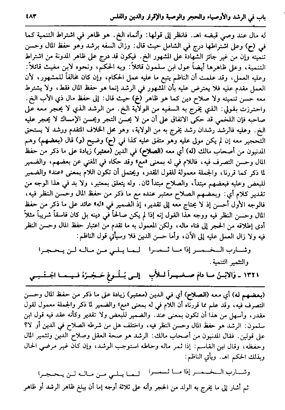 لَهُ مَال عِنْد وَصِيّ قَبضه اه. فَانْظُر إِلَى قَوْلهَا: وأنماه الخ. هُوَ ظَاهر فِي اشْتِرَاط التنمية كَمَا فِي (ح) وعَلى اشْتِرَاطهَا درج فِي الشَّامِل حَيْثُ قَالَ: وَزَالَ السَّفه برشد وَهُوَ حفظ المَال وَحسن تنميته وَإِن من غير جَائِز الشَّهَادَة على الْمَشْهُور الخ. فَيكون قد درج على ظَاهر الْمُدَوَّنَة من اشْتِرَاط التنمية، وعَلى ظَاهرهَا أَيْضا عول ابْن سَلمُون قَائِلا: وَبِه الحكم، وَنَحْوه لِابْنِ مغيث قَائِلا: وَعَلِيهِ الْعَمَل، وَقد علمت أَن النَّاظِم يتبع مَا عَلَيْهِ عمل الْحُكَّام، وَإِن كَانَ مُخَالفا للمشهور، لِأَن الْعَمَل مقدم عَلَيْهِ فَلَا يعْتَرض عَلَيْهِ بِأَن الْمَشْهُور فِي الرشد إِنَّمَا هُوَ حفظ المَال فَقَط، وَلَا يشْتَرط مَعَه حسن تنميته وَلَا صَلَاح دين كَمَا هُوَ ظَاهر (خَ) حَيْثُ قَالَ: إِلَى حفظ مَال ذِي الْأَب الخ. واحترزت بِقَوْلِي: الَّذِي يخرج بِهِ السَّفِيه من الْولَايَة الخ. من الرشد الَّذِي لَا يحْجر مَعَه على صَاحبه فَإِن اللَّخْمِيّ قد حكى الِاتِّفَاق على أَن من لَا يحسن التَّجر وَيحسن الْإِمْسَاك لَا يحْجر عَلَيْهِ الخ. وَعَلِيهِ فالرشد رشدان رشد يخرج بِهِ من الْولَايَة، وَهُوَ مَحل الْخلاف الْمُتَقَدّم ورشد لَا يسْتَحق التحجير مَعَه إِن لم يكن مولى عَلَيْهِ وَهُوَ مُتَّفق عَلَيْهِ كَذَا فِي (ح) وضيح (و) قَالَ (بَعضهم) وهم المدنيون من أَصْحَاب مَالك (لَهُ) أَي مَعَه (الصّلاح) فِي الدّين (مُعْتَبر) زِيَادَة على مَا ذكر من حفظ المَال وَحسن التَّصَرُّف فِيهِ، فَاللَّام فِي لَهُ بِمَعْنى (مَعَ) وَقد حَكَاهُ فِي الْمُغنِي عَن بَعضهم، وَالضَّمِير لما ذكر كَمَا قَررنَا، وَالْجُمْلَة معمولة لِلْقَوْلِ الْمُقدر، وَيحْتَمل أَن تكون اللَّام بِمَعْنى (عِنْد) وَالضَّمِير للْبَعْض وَعَلِيهِ فبعضهم مُبْتَدأ، وَالصَّلَاح مُبْتَدأ ثَان. وَله يتَعَلَّق بمعتبر، وَلَا بُد فِي هَذَا الْوَجْه من تَقْدِير كَلَام أَي: وَبَعْضهمْ الصّلاح مُعْتَبر عِنْده مَعَ مَا ذكر من حفظ المَال وَحسن النّظر فِيهِ، فَالْوَجْه الأول أحسن إِذْ لَا يحْتَاج مَعَه إِلَى تَقْدِير، إِذْ الضَّمِير فِي (لَهُ) عَائِد على مَا ذكر من حفظ المَال وَحسن النّظر فِيهِ وَوجه هَذَا القَوْل إِنَّه إِذا لم يكن صَالحا فِي دينه بل كَانَ فَاسِقًا شريباً مثلا أدّى إِطْلَاقه من الْحجر إِلَى فنَاء مَاله، وَلَكِن الْمَعْمُول بِهِ مَا تقدم من اعْتِبَار حفظ المَال وَحسن النّظر فِيهِ وَلَا زَالَ الْعَمَل عَلَيْهِ إِلَى الْآن، وَأما حسن الدّين فَلَا وَسَيَأْتِي قَول النَّاظِم: وشارب الْخمر إِذا مَا ثمرا لما يَلِي من مَاله لن يحجرا والتثمير التنمية. وَالابْنُ مَا دامَ صَغِيرا للأَبِ إِلَى بُلُوغٍ حَجْرُهُ فِيمَا اجْتُبي