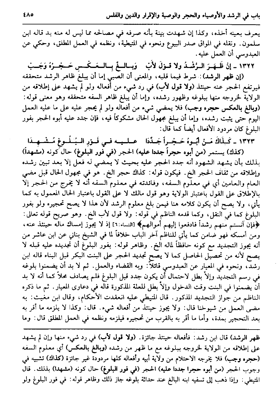 يعرف بِعَيْنِه أَخذه، وَكَذَا إِن شهِدت بَيِّنَة بِأَنَّهُ صرفه فِي مَصَالِحه مِمَّا لَيْسَ لَهُ مِنْهُ بُد قَالَه ابْن سَلمُون. وَنَقله فِي الْمواق صدر الْبيُوع وَنَحْوه فِي الْمُتَيْطِيَّة، ونظمه فِي الْعَمَل الْمُطلق، وَحكي عَن العبدوسي أَن الْعَمَل عَلَيْهِ. إنْ ظَهَرَ الرُّشْدُ وَلَا قوْلَ لأَبْ وَبالغٌ بِالعَكْسِ حَجْرُهُ وَجَبْ (إِن ظهر الرشد) : شَرط فِيمَا قلبه، وَالْمعْنَى أَن الصَّبِي إِمَّا أَن يبلغ ظَاهر الرشد متحققه فيرتفع الْحجر عَنهُ حِينَئِذٍ (وَلَا قَول لأَب) فِي رد شَيْء من أَفعاله وَلَو لم يشْهد على إِطْلَاقه من الْولَايَة لِخُرُوجِهِ مِنْهَا بِبُلُوغِهِ وَظُهُور رشده، وَإِمَّا أَن يبلغ ظَاهر السَّفه متحققه وَهُوَ معنى قَوْله: (وَبَالغ بِالْعَكْسِ حجره وَجب) فَلَا يمْضِي شَيْء من أَفعاله وَلَو لم يحْجر عَلَيْهِ على مَا عَلَيْهِ الْعَمَل الْيَوْم حَتَّى يثبت رشده، وَإِمَّا أَن يبلغ مَجْهُول الْحَال مشكوكاً فِيهِ، فَإِن جدد عَلَيْهِ أَبوهُ الْحجر بفور الْبلُوغ كَانَ مَرْدُود الْأَفْعَال أَيْضا كَمَا قَالَ: كَذَاكَ مَنْ أبُوهُ حَجْراً جَدَّدَا عَلَيْهِ فِي فَوْرِ البُلُوغِ مُشْهِدَا (كذك) يسْتَمر (من أَبوهُ حجرا جددا عَلَيْهِ) الْحجر (فِي فَور الْبلُوغ) حَال كَونه (مشهداً) بذلك بِأَن يشْهد الشُّهُود أَنه جدد الْحجر عَلَيْهِ بِحَيْثُ لَا يمْضِي لَهُ فعل إِلَّا بعد تبين رشده وإطلاقه من ثقاف الْحجر الخ. فَيكون قَوْله: كَذَاك حجر الخ. هُوَ فِي مَجْهُول الْحَال قبل مُضِيّ الْعَام والعامين أَي فِي مَعْلُوم السَّفه، وَفَائِدَته فِي مَعْلُوم السَّفه أَنه لَا يخرج من الْحجر إِلَّا بِالْإِطْلَاقِ على القَوْل بِاعْتِبَار الْولَايَة وَهُوَ قَول مَالك لَا على القَوْل بِاعْتِبَار الْحَال الْمَعْمُول بِهِ كَمَا يَأْتِي، وَلَا يَصح أَن يكون كَلَامه هُنَا فِيمَن بلغ مَعْلُوم الرشد لِأَن هَذَا لَا يَصح تحجيره وَلَو بفور الْبلُوغ كَمَا فِي النَّقْل، وكما قدمه النَّاظِم فِي قَوْله: وَلَا قَول لأَب الخ. وَهُوَ صَرِيح قَوْله تَعَالَى: فَإِن آنستم مِنْهُم رشدا فادفعوا إِلَيْهِم أَمْوَالهم} (النِّسَاء: 6) إِذْ لَا يجوز إمْسَاك مَاله حِينَئِذٍ عَنهُ، وَمن أمْسكهُ فَهُوَ ضَامِن كَمَا يَأْتِي للناظم آخر الْبَاب خلافًا لما فِي الشَّيْخ بناني عَن ابْن عَاشر من أَنه يجوز التَّجْدِيد مَعَ كَونه حَافِظًا لمَاله الخ. وَظَاهر قَوْله: بفور الْبلُوغ أَن تجديده عَلَيْهِ قبله لَا يَصح لِأَنَّهُ من تَحْصِيل الْحَاصِل كَمَا لَا يَصح تَجْدِيد الْحجر على الْبِنْت الْبكر قبل الْبناء قَالَه ابْن رشد، وَنَحْوه فِي المعيار عَن العبدوسي قَائِلا: وَبِه الْقَضَاء وَالْعَمَل. ثمَّ لَا بُد أَن يضمنوا بُلُوغه فِي رسم التَّجْدِيد وإلاَّ بَطل لاحْتِمَال أَن يكون جدد قبل الْبلُوغ فَلم يُصَادف محلا كَمَا أَنه لَا بُد أَن يضمنوا فِي الْبِنْت وَقت الدُّخُول وإلاَّ بَطل لِلْعِلَّةِ الْمَذْكُورَة قَالَه فِي دعاوى المعيار. ثمَّ مَا ذكره النَّاظِم من جَوَاز التَّجْدِيد الْمَذْكُور. قَالَ المتيطي عَلَيْهِ انْعَقَدت الْأَحْكَام، وَقَالَ ابْن مغيث: بِهِ مضى الْعَمَل من شُيُوخنَا قَالَ: وَلَا يجوز حِينَئِذٍ من أَفعاله شَيْء. قَالَ: وَكَذَا لَا يلْزمه مَا أقرّ بِهِ بعد التحجير بِمدَّة، وَأما مَا أقرّ بِهِ بِالْقربِ من تحجيره فَيلْزمهُ ونظمه فِي الْعَمَل الْمُطلق قَالَ: وَمَا