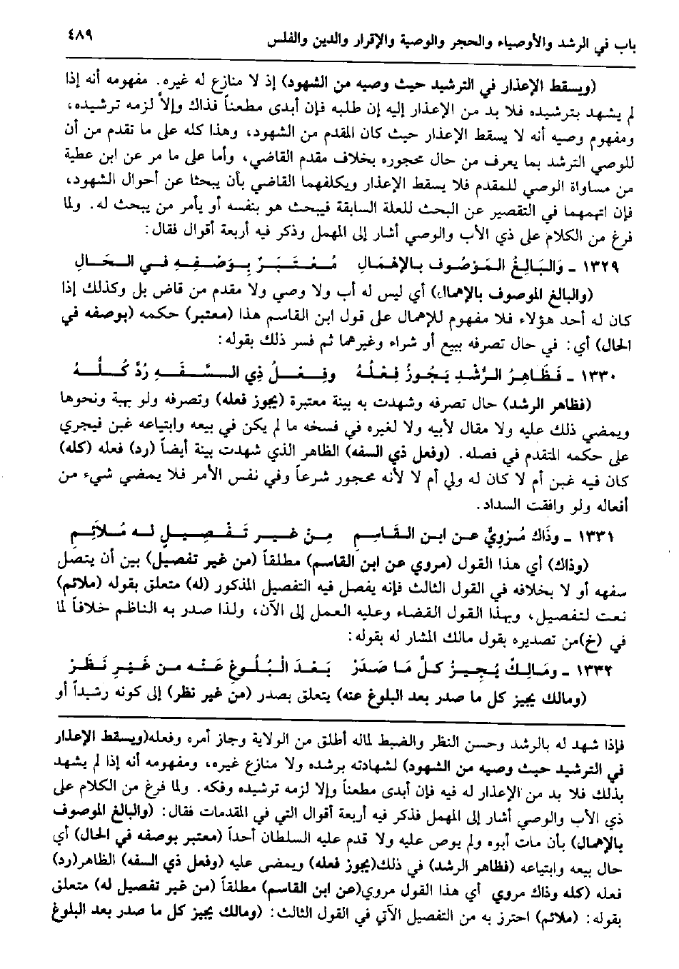 (وَيسْقط الْإِعْذَار فِي الترشيد حَيْثُ وَصِيّه من الشُّهُود) إِذْ لَا مُنَازع لَهُ غَيره. مَفْهُومه أَنه إِذا لم يشْهد بترشيده فَلَا بُد من الْإِعْذَار إِلَيْهِ إِن طلبه فَإِن أبدى مطعناً فَذَاك وإلاَّ لزمَه ترشيده، وَمَفْهُوم وَصِيّه أَنه لَا يسْقط الْإِعْذَار حَيْثُ كَانَ الْمُقدم من الشُّهُود، وَهَذَا كُله على مَا تقدم من أَن للْوَصِيّ الترشد بِمَا يعرف من حَال مَحْجُوره بِخِلَاف مقدم القَاضِي، وَأما على مَا مر عَن ابْن عَطِيَّة من مُسَاوَاة الْوَصِيّ للمقدم فَلَا يسْقط الْإِعْذَار ويكلفهما القَاضِي بِأَن يبحثا عَن أَحْوَال الشُّهُود، فَإِن اتَّهَمَهُمَا فِي التَّقْصِير عَن الْبَحْث لِلْعِلَّةِ السَّابِقَة فيبحث هُوَ بِنَفسِهِ أَو يَأْمر من يبْحَث لَهُ. وَلما فرغ من الْكَلَام على ذِي الْأَب وَالْوَصِيّ أَشَارَ إِلَى المهمل وَذكر فِيهِ أَرْبَعَة أَقْوَال فَقَالَ: وَالبَالِغُ المَوْصُوف بالإهْمَالِ مُعْتَبَرٌ بِوَصْفِهِ فِي الحَالِ (والبالغ الْمَوْصُوف بالإهمال) أَي لَيْسَ لَهُ أَب وَلَا وَصِيّ وَلَا مقدم من قَاض بل وَكَذَلِكَ إِذا كَانَ لَهُ أحد هَؤُلَاءِ فَلَا مَفْهُوم للإهمال على قَول ابْن الْقَاسِم هَذَا (مُعْتَبر) حكمه (بوصفه فِي الْحَال) أَي: فِي حَال تصرفه بِبيع أَو شِرَاء وَغَيرهمَا ثمَّ فسر ذَلِك بقوله: فَظَاهِرُ الرُّشْدِ يَجُوزُ فِعْلُهُ وفِعْلُ ذِي السَّفَهِ رُدَّ كُلُّهُ (فَظَاهر الرشد) حَال تصرفه وَشهِدت بِهِ بَيِّنَة مُعْتَبرَة (يجوز فعله) وتصرفه وَلَو بِهِبَة وَنَحْوهَا ويمضي ذَلِك عَلَيْهِ وَلَا مقَال لِأَبِيهِ وَلَا لغيره فِي فَسخه مَا لم يكن فِي بَيْعه وابتياعه غبن فَيجْرِي على حكمه الْمُتَقَدّم فِي فَصله. (وَفعل ذِي السَّفه) الظَّاهِر الَّذِي شهِدت بَيِّنَة أَيْضا (رد) فعله (كُله) كَانَ فِيهِ غبن أم لَا كَانَ لَهُ ولي أم لَا لِأَنَّهُ مَحْجُور شرعا وَفِي نفس الْأَمر فَلَا يمْضِي شَيْء من أَفعاله وَلَو وَافَقت السداد. وذَاك مُرْوِيٌّ عَن ابْن القَاسِمِ مِنْ غير تَفْصِيلٍ لَهُ مُلاَئِمِ (وَذَاكَ) أَي هَذَا القَوْل (مَرْوِيّ عَن ابْن الْقَاسِم) مُطلقًا (من غير تَفْصِيل) بَين أَن يتَّصل سفهه أَو لَا بِخِلَافِهِ فِي القَوْل الثَّالِث فَإِنَّهُ يفصل فِيهِ التَّفْصِيل الْمَذْكُور (لَهُ) مُتَعَلق بقوله (ملائم) نعت لتفصيل، وَبِهَذَا القَوْل الْقَضَاء وَعَلِيهِ الْعَمَل إِلَى الْآن، وَلذَا صدر بِهِ النَّاظِم خلافًا لما فِي (خَ) من تصديره بقول مَالك الْمشَار لَهُ بقوله: ومَالِكٌ يُجِيزُ كلَّ مَا صَدَرْ بَعْدَ الْبُلُوغِ عَنْه من غَيْرِ نَظَرْ (وَمَالك يُجِيز كل مَا صدر بعد الْبلُوغ عَنهُ) يتَعَلَّق بصدر (من غير نظر) إِلَى كَونه رشيدا أَو