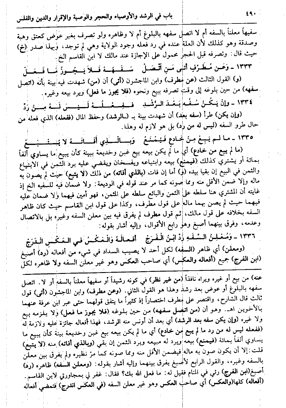 سَفِيها مُعْلنا بالسفه أم لَا اتَّصل سفهه بِالْبُلُوغِ أم لَا وَظَاهره وَلَو تصرف بِغَيْر عوض كعتق وَهبة وَصدقَة وَهُوَ كَذَلِك لِأَن الْعلَّة عِنْده فِي رد فعله وجود الْولَايَة وَهِي لم تُوجد وَبِهَذَا صدر (خَ) حَيْثُ قَالَ: وتصرفه قبل الْحجر مَحْمُول على الْإِجَازَة عِنْد مَالك لَا ابْن الْقَاسِم الخ. وَعَن مُطَرَّفٍ أَتَى مَنِ اتَّصَلْ سَفَهُهُ فَلاَ يَجُوزُ مَا فَعَلْ (و) القَوْل الثَّالِث (عَن مطرف) وَابْن الْمَاجشون (أَتَى) أَن (من) شهِدت فِيهِ بَيِّنَة بِأَنَّهُ (اتَّصل سفهه) من حِين بُلُوغه إِلَى وَقت تصرفه بِبيع وَنَحْوه (فَلَا يجوز مَا فعل) وَيرد بَيْعه وَغَيره. وإنْ يَكُنْ سُفِّه بَعْدَ الرُّشْدِ ففِعْلُهُ لَيْسَ لَهُ مِنْ رَدِّ (وَإِن يكن) طَرَأَ (سفه بعد) أَن شهِدت بَيِّنَة ب (الرشد) وَحفظ المَال (فَفعله) الَّذِي فعله من حَال طرُو السَّفه (لَيْسَ لَهُ من رد) بل هُوَ لَازم لَهُ وَهَذَا. مَا لم يَبِعْ مِنْ خَادعٍ فَيُمْنَعُ وَبالّذِي أَفَاتَهُ لَا يُتْبَعُ (مَا لم يبع من خَادع) أَي مَا لم يكن بَيْعه بيع غبن وخديعة بِبَيِّنَة كَأَن يَبِيع مَا يُسَاوِي ألفا بِمِائَة أَو يَشْتَرِي كَذَلِك (فَيمْنَع) بَيْعه وابتياعه ويفسخان وَيَقْضِي عَلَيْهِ برد الثّمن فِي الابتياع وَالثمن فِي البيع إِن بقيا بِيَدِهِ (و) أما إِن فَاتَ (بِالَّذِي أفاته) من ذَلِك (لَا يتبع) حَيْثُ لم يصون بِهِ مَاله وَإِلَّا ضمن الْأَقَل مِنْهُ وَمِمَّا صونه كَمَا مر عِنْد قَوْله فِي الْوَدِيعَة: وَلَا ضَمَان فِيهِ للسفيه الخ إِذْ غَايَته أَن المُشْتَرِي هُنَا سلطه على الثّمن وَالْبَائِع سلطه على الْمُثمن، فَهُوَ أَمِين فيهمَا وَلَا ضَمَان عَلَيْهِ فيهمَا حَيْثُ لم يصن بهما مَاله على قَول مطرف، وَكَذَا على قَول ابْن الْقَاسِم حَيْثُ كَانَ ظَاهر السَّفه بِخِلَافِهِ على قَول مَالك، ثمَّ قَول مطرف لم يفرق فِيهِ بَين معلن السَّفه وَغَيره بل بالاتصال وَعَدَمه، وَفرق بَينهمَا أصبغ وَهُوَ رَابِع الْأَقْوَال، وَإِلَيْهِ أَشَارَ بقوله: وَمُعْلِنُ السَّفَهِ رَدَّ ابْنُ الْفَرَجْ أفعالَهُ وَالْعَكْسُ فِي العَكْسِ انْدَرَجْ (ومعلن) أَي ظَاهر (السَّفه) لكل أحد