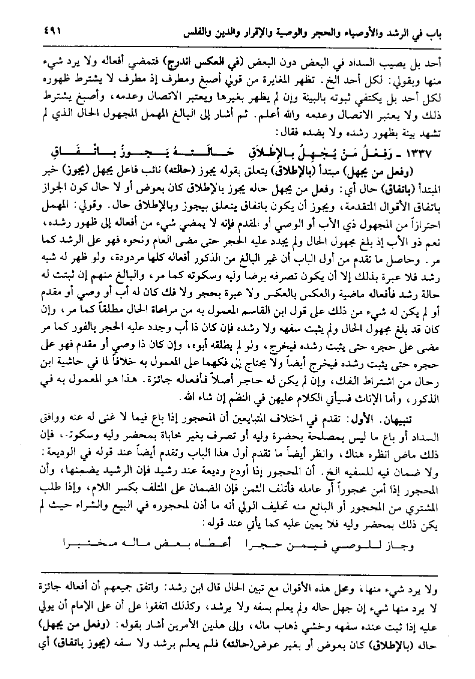 لَا يُصِيب السداد فِي شَيْء من أَفعاله (رد) أصبغ (ابْن الْفرج) جَمِيع (أَفعاله وَالْعَكْس) أَي صَاحب الْعَكْس وَهُوَ غير معلن السَّفه وَلَا ظَاهره لكل أحد بل يُصِيب السداد فِي الْبَعْض دون الْبَعْض (فِي الْعَكْس اندرج) فتمضي أَفعاله وَلَا يرد شَيْء مِنْهَا وبقولي: لكل أحد الخ. تظهر الْمُغَايرَة من قولي أصبغ ومطرف إِذْ مطرف لَا يشْتَرط ظُهُوره لكل أحد بل يَكْتَفِي ثُبُوته بِالْبَيِّنَةِ وَإِن لم يظْهر بغَيْرهَا وَيعْتَبر الِاتِّصَال وَعَدَمه، وَأصبغ يشْتَرط ذَلِك وَلَا يعْتَبر الِاتِّصَال وَعَدَمه وَالله أعلم. ثمَّ أَشَارَ إِلَى الْبَالِغ المهمل الْمَجْهُول الْحَال الَّذِي لم تشهد بَيِّنَة بِظُهُور رشده وَلَا بضده فَقَالَ: وَفِعْلُ مَنْ يُجْهِلُ بالإِطْلاَقِ حَالَتهُ يَجوزُ باتِّفَاقِ (وَفعل من يجهل) مُبْتَدأ (بِالْإِطْلَاقِ) يتَعَلَّق بقوله يجوز (حَالَته) نَائِب فَاعل يجهل (يجوز) خبر الْمُبْتَدَأ (بِاتِّفَاق) حَال أَي: وَفعل من يجهل حَاله يجوز بِالْإِطْلَاقِ كَانَ بعوض أَو لَا حَال كَون الْجَوَاز بِاتِّفَاق الْأَقْوَال الْمُتَقَدّمَة، وَيجوز أَن يكون بِاتِّفَاق يتَعَلَّق بيجوز وبالإطلاق حَال. وَقَوْلِي: المهمل احْتِرَازًا من الْمَجْهُول ذِي الْأَب أَو الْوَصِيّ أَو الْمُقدم فَإِنَّهُ لَا يمْضِي شَيْء من أَفعاله إِلَى ظُهُور رشده، نعم ذُو الْأَب إِذْ بلغ مَجْهُول الْحَال وَلم يجدد عَلَيْهِ الْحجر حَتَّى مضى الْعَام وَنَحْوه فَهُوَ على الرشد كَمَا مر. وَحَاصِل مَا تقدم من أول الْبَاب أَن غير الْبَالِغ من الذُّكُور أَفعاله كلهَا مَرْدُودَة، وَلَو ظهر لَهُ شبه رشد فَلَا عِبْرَة بذلك إِلَّا أَن يكون تصرفه بِرِضا وليه وسكوته كَمَا مر، والبالغ مِنْهُم إِن ثبتَتْ لَهُ حَالَة رشد فأفعاله مَاضِيَة وَالْعَكْس بِالْعَكْسِ وَلَا عِبْرَة بِحجر وَلَا فك كَانَ لَهُ أَب أَو وَصِيّ أَو مقدم أَو لم يكن لَهُ شَيْء من ذَلِك على قَول ابْن الْقَاسِم الْمَعْمُول بِهِ من مُرَاعَاة الْحَال مُطلقًا كَمَا مر، وَإِن كَانَ قد بلغ مَجْهُول الْحَال وَلم يثبت سفهه وَلَا رشده فَإِن كَانَ ذَا أَب وجدد عَلَيْهِ الْحجر بالفور كَمَا مر مضى على حجره حَتَّى يثبت رشده فَيخرج، وَلَو لم يُطلقهُ أَبوهُ، وَإِن كَانَ ذَا وَصِيّ أَو مقدم فَهُوَ على حجره حَتَّى يثبت رشده فَيخرج أَيْضا وَلَا يحْتَاج إِلَى فكهما على الْمَعْمُول بِهِ خلافًا لما فِي حَاشِيَة ابْن رحال من اشْتِرَاط الفك وَإِن لم يكن لَهُ حاجر أصلا فأفعاله جَائِزَة. هَذَا هُوَ الْمَعْمُول بِهِ فِي الذُّكُور، وَأما الْإِنَاث فَسَيَأْتِي الْكَلَام عَلَيْهِنَّ فِي النّظم إِن شَاءَ الله. تَنْبِيهَانِ. الأول: تقدم فِي اخْتِلَاف الْمُتَبَايعين أَن الْمَحْجُور إِذا بَاعَ فِيمَا لَا غنى لَهُ عَنهُ وَوَافَقَ السداد أَو بَاعَ مَا لَيْسَ بمصلحة بِحَضْرَة وليه أَو تصرف بِغَيْر مُحَابَاة بِمحضر وليه وسكوته، فَإِن ذَلِك مَاض اُنْظُرْهُ هُنَاكَ، وَانْظُر أَيْضا مَا تقدم أول هَذَا الْبَاب وَتقدم أَيْضا عِنْد قَوْله فِي الْوَدِيعَة: وَلَا ضَمَان فِيهِ للسفيه الخ. أَن الْمَحْجُور إِذا أودع وَدِيعَة عِنْد رشيد فَإِن الرشيد يضمنهَا، وَأَن الْمَحْجُور إِذا أَمن مَحْجُورا أَو عَامله فأتلف الثّمن فَإِن الضَّمَان على الْمُتْلف بِكَسْر اللَّام، وَإِذا طلب المُشْتَرِي من الْمَحْجُور أَو البَائِع مِنْهُ تَحْلِيف الْوَلِيّ أَنه مَا أذن لمحجوره فِي البيع وَالشِّرَاء حَيْثُ لم يكن ذَلِك بِمحضر وليه فَلَا يَمِين عَلَيْهِ كَمَا يَأْتِي عِنْد قَوْله: وَجَاز للْوَصِيّ فِيمَن حجرا أعطَاهُ بعض مَاله مختبرا