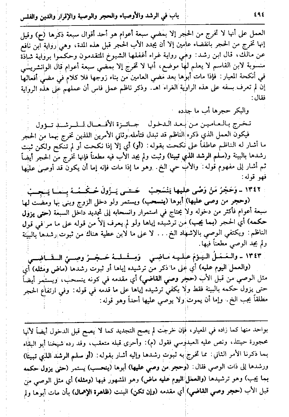 الْعَمَل على أَنَّهَا لَا تخرج من الْحجر إِلَّا بِمُضِيِّ سَبْعَة أَعْوَام هُوَ أحد أَقْوَال سَبْعَة ذكرهَا (ح) وَقيل إِنَّهَا تخرج من الْحجر بِانْقِضَاء عَاميْنِ إِلَّا أَن يجدد الْأَب الْحجر قبل هَذِه الْمدَّة، وَهِي رِوَايَة ابْن نَافِع عَن مَالك، قَالَ ابْن رشد: وَهِي رِوَايَة غراء أغفلها الشُّيُوخ المتقدمون وحكموا بِرِوَايَة شَاذَّة منسوبة لِابْنِ الْقَاسِم لَا يعلم لَهَا مَوضِع، أَنَّهَا لَا تخرج إِلَّا بِمُضِيِّ سَبْعَة أَعْوَام قَالَ الوانشريسي فِي أنكحة المعيار: فَإِذا مَاتَ أَبوهَا بعد مُضِيّ العامين من بِنَاء زَوجهَا فَلَا كَلَام فِي مُضِيّ أفعالها إِن لم تعرف بِسَفَه على هَذِه الراوية الغراء اه. وَذكر ناظم عمل فاس أَن عَمَلهم على هَذِه الرِّوَايَة فَقَالَ: وَالْبكْر حجرها أَب مَا جدده تخرج بالعامين من بعد الدُّخُول جَائِزَة الْأَفْعَال للرشد تؤول فَيكون الْعَمَل الَّذِي ذكره النَّاظِم قد تبدل فَتَأَمّله وَثَانِي الْأَمريْنِ اللَّذين تخرج بهما من الْحجر مَا أَشَارَ لَهُ النَّاظِم عاطفاً على نكحت بقوله: (أَو) أَي إِلَّا إِذا نكحت أَو لم تنْكح وَلَكِن ثَبت رشدها بِالْبَيِّنَةِ و (سلم الرشد الَّذِي تَبينا) وَثَبت وَلم يجد الْأَب فِيهِ مطعناً فَإِنَّهَا تخرج من الْحجر أَيْضا ثمَّ أَشَارَ إِلَى مَفْهُوم قَوْله: وَالْأَب حَيّ الخ. وَهُوَ مَا إِذا مَاتَ فَإِنَّهُ إِمَّا أَن يكون قد أوصى عَلَيْهَا فَهُوَ قَوْله: وَحَجْرُ مَنْ وَصَّى عَلَيْهَا يَنْسَحِبْ حَتى يَزُولَ حُكْمُهُ بِما يَجِبْ (وَحجر من وصّى عَلَيْهَا) أَبوهَا (ينسحب) وَيسْتَمر وَلَو دخل الزَّوْج وَبنى بهَا وَمَضَت لَهَا سَبْعَة أَعْوَام فَأكْثر من دُخُوله وَلَا يحْتَاج فِي اسْتِمْرَار وانسحابه إِلَى تَجْدِيد دَاخل السَّبْعَة (حَتَّى يَزُول حكمه) أَي الْحجر (بِمَا يجب) من ترشيده إِيَّاهَا وَلَو لم يعرف إلاَّ من قَوْله على مَا مر فِي قَول النَّاظِم: ويكتفي الْوَصِيّ بِالْإِشْهَادِ الخ ... لَا على مَا لِابْنِ عَطِيَّة هُنَاكَ من ثُبُوت رشدها بِالْبَيِّنَةِ وَلم يجد الْوَصِيّ مطعناً فِيهَا. والعَمَلُ اليَوْمَ عَلَيْهِ ماضِي وَمِثْلهُ حَجْرُ وصِيِّ القَاضِي (وَالْعَمَل الْيَوْم عَلَيْهِ) أَي على مَا ذكر من ترشيده إِيَّاهَا أَو ثُبُوت رشدها (مَاض وَمثله) أَي مثل الْوَصِيّ من قبل الْأَب (حجر وَصِيّ القَاضِي) أَي مقدمه فِي كَونه ينسحب، وَيسْتَمر أَيْضا حَتَّى يَزُول حكمه بِالْبَيِّنَةِ فَقَط وَلَا يَكْفِي ترشيده إِيَّاهَا على مَا قدمه فِي قَوْله: وَفِي ارْتِفَاع الْحجر مُطلقًا يجب الخ. وَإِمَّا أَن يَمُوت وَلَا يُوصي عَلَيْهَا أحدا وَهُوَ قَوْله: