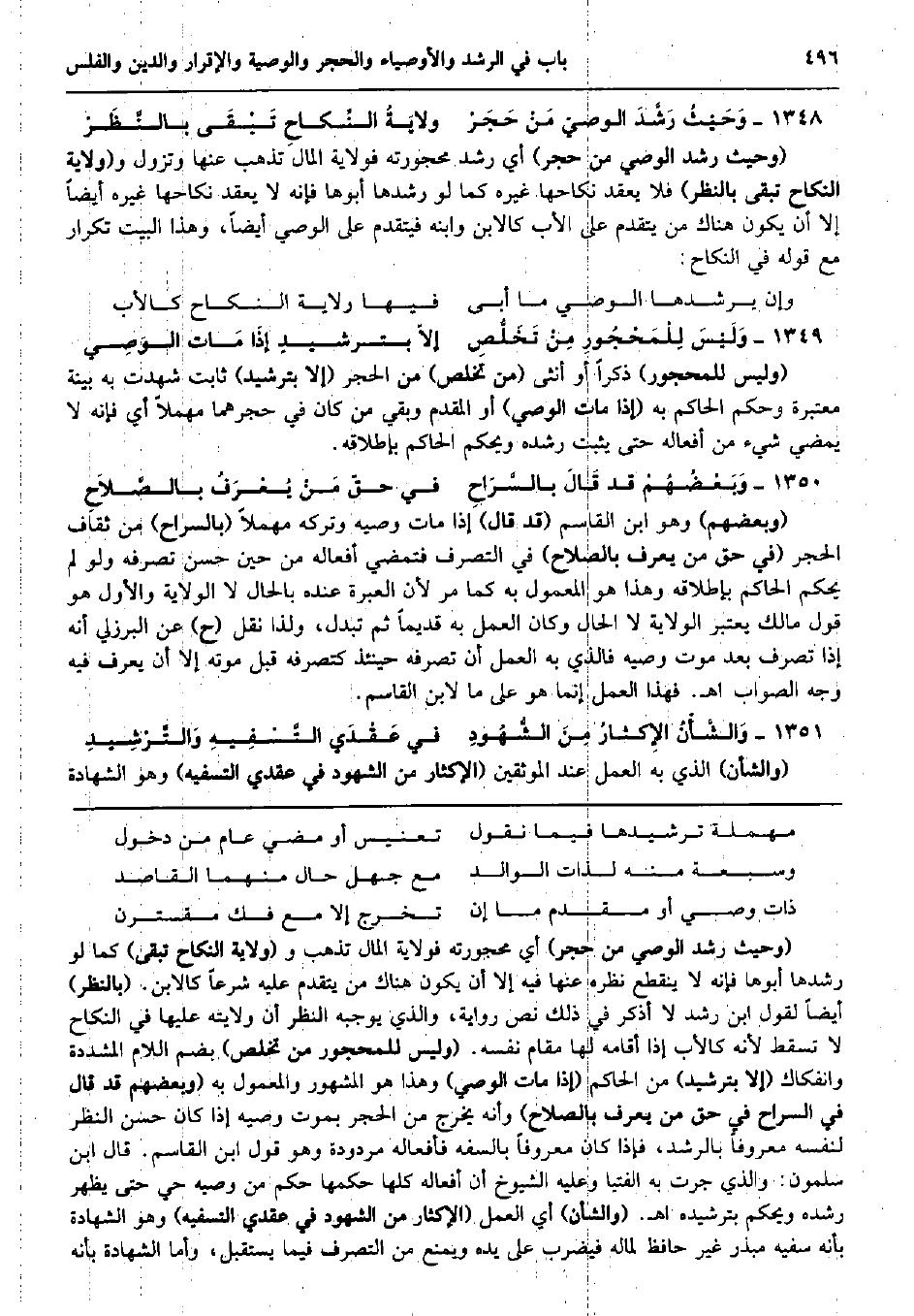 وَحَيْثُ رَشَّدَ الوصيّ مَنْ حَجَرْ ولايَةُ النِّكاحِ تَبْقَى بالنَّظَرْ (وَحَيْثُ رشد الْوَصِيّ من حجر) أَي رشد محجورته فولاية المَال تذْهب عَنْهَا وتزول و (ولَايَة النِّكَاح تبقى بِالنّظرِ) فَلَا يعْقد نِكَاحهَا غَيره كَمَا لَو رشدها أَبوهَا فَإِنَّهُ لَا يعْقد نِكَاحهَا غَيره أَيْضا إِلَّا أَن يكون هُنَاكَ من يتَقَدَّم على الْأَب كالابن وَابْنه فيتقدم على الْوَصِيّ أَيْضا وَهَذَا الْبَيْت تكْرَار مَعَ قَوْله فِي النِّكَاح: وَإِن يرشدها الْوَصِيّ مَا أَبى فِيهَا ولَايَة النِّكَاح كَالْأَبِ وَلَيْسَ لِلْمَحْجُورِ مِنْ تَخَلُّصِ إلاّ بترشيدٍ إذَا مَات الوَصِي (وَلَيْسَ للمحجور) ذكرا أَو أُنْثَى (من تخلص) من الْحجر (إِلَّا بترشيد) ثَابت شهِدت بِهِ بَيِّنَة مُعْتَبرَة وَحكم الْحَاكِم بِهِ (إِذا مَاتَ الْوَصِيّ) أَو الْمُقدم وَبَقِي من كَانَ فِي حجرهما مهملاً أَي فَإِنَّهُ لَا يمْضِي شَيْء من أَفعاله حَتَّى يثبت رشده وَيحكم الْحَاكِم بِإِطْلَاقِهِ. وَبَعْضُهُمْ قد قَالَ بالسَّرَاحِ فِي حقّ مَنْ يُعْرَفُ بالصَّلاَحِ (وَبَعْضهمْ) وَهُوَ ابْن الْقَاسِم (قد قَالَ) إِذا مَاتَ وَصِيّه وَتَركه مهملاً (بالسراح) من ثقاف الْحجر (فِي حق من يعرف بالصلاح) فِي التَّصَرُّف فتمضي أَفعاله من حِين حسن تصرفه وَلَو لم يحكم الْحَاكِم بِإِطْلَاقِهِ وَهَذَا هُوَ الْمَعْمُول بِهِ كَمَا مر لِأَن الْعبْرَة عِنْده بِالْحَال لَا الْولَايَة وَالْأول هُوَ قَول مَالك يعْتَبر الْولَايَة لَا الْحَال وَكَانَ الْعَمَل بِهِ قَدِيما ثمَّ تبدل، وَلذَا نقل (ح) عَن الْبُرْزُليّ أَنه إِذا تصرف بعد موت وَصِيّه فَالَّذِي بِهِ الْعَمَل أَن تصرفه حِينَئِذٍ كتصرفه قبل مَوته إِلَّا أَن يعرف فِيهِ وَجه الصَّوَاب اه. فَهَذَا الْعَمَل إِنَّمَا هُوَ على مَا لِابْنِ الْقَاسِم. وَالشَّأْنُ الإِكثارُ مِنَ الشُّهُودِ فِي عَقْدَي التَّسْفِيهِ وَالتَّرْشِيدِ (والشأن) الَّذِي بِهِ الْعَمَل عِنْد الموثقين (الْإِكْثَار من الشُّهُود فِي عقدي التسفيه) وَهُوَ الشَّهَادَة