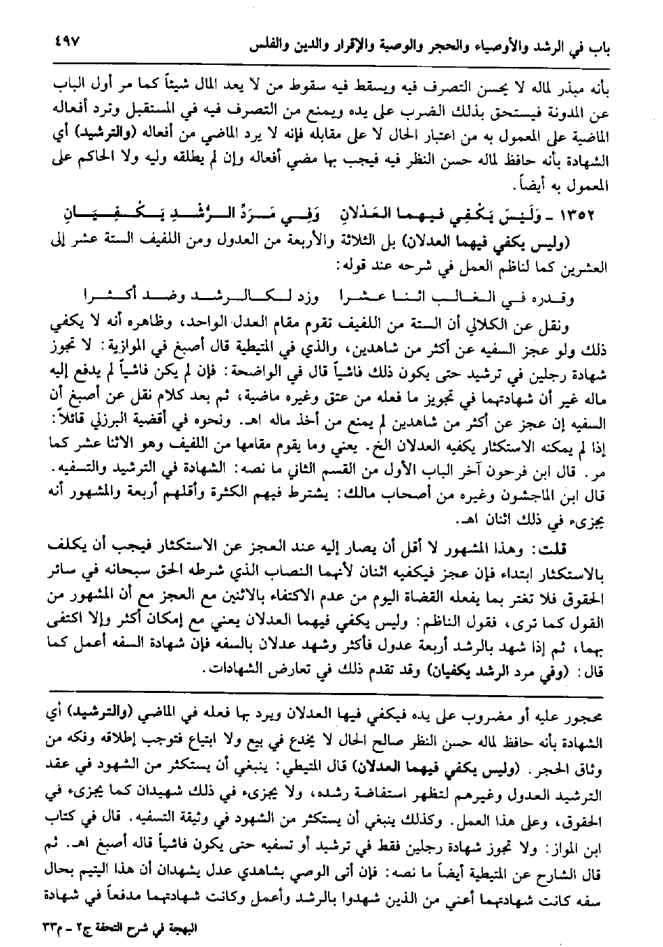 بِأَنَّهُ مبذر لمَاله لَا يحسن التَّصَرُّف فِيهِ وَيسْقط فِيهِ سُقُوط من لَا يعد المَال شَيْئا كَمَا مر أول الْبَاب عَن الْمُدَوَّنَة فَيسْتَحق بذلك الضَّرْب على يَده وَيمْنَع من التَّصَرُّف فِيهِ فِي الْمُسْتَقْبل وَترد أَفعاله الْمَاضِيَة على الْمَعْمُول بِهِ من اعْتِبَار الْحَال لَا على مُقَابِله فَإِنَّهُ لَا يرد الْمَاضِي من أَفعاله (والترشيد) أَي الشَّهَادَة بِأَنَّهُ حَافظ لمَاله حسن النّظر فِيهِ فَيجب بهَا مُضِيّ أَفعاله وَإِن لم يُطلقهُ وليه وَلَا الْحَاكِم على الْمَعْمُول بِهِ أَيْضا. وَلَيْسَ يَكْفِي فيهمَا العَدْلانِ وَفِي مَرَدِّ الرُّشْدِ يَكْفِيَانِ (وَلَيْسَ يَكْفِي فيهمَا العدلان) بل الثَّلَاثَة وَالْأَرْبَعَة من الْعُدُول وَمن اللفيف السِّتَّة عشر إِلَى الْعشْرين كَمَا لناظم الْعَمَل فِي شَرحه عِنْد قَوْله: وَقدره فِي الْغَالِب اثْنَا عشرا وزد لكالرشد وضد أكثرا وَنقل عَن الكلالي أَن السِّتَّة من اللفيف تقوم مقَام الْعدْل الْوَاحِد، وَظَاهره أَنه لَا يَكْفِي ذَلِك وَلَو عجز السَّفِيه عَن أَكثر من شَاهِدين، وَالَّذِي فِي الْمُتَيْطِيَّة قَالَ أصبغ فِي الْمُوازِية: لَا تجوز شَهَادَة رجلَيْنِ فِي ترشيد حَتَّى يكون ذَلِك فاشياً قَالَ فِي الْوَاضِحَة: فَإِن لم يكن فاشياً لم يدْفع إِلَيْهِ مَاله غير أَن شَهَادَتهمَا فِي تَجْوِيز مَا فعله من عتق وَغَيره مَاضِيَة، ثمَّ بعد كَلَام نقل عَن أصبغ أَن السَّفِيه إِن عجز عَن أَكثر من شَاهِدين لم يمْنَع من أَخذ مَاله اه. وَنَحْوه فِي أقضية الْبُرْزُليّ قَائِلا: إِذا لم يُمكنهُ الاستكثار يَكْفِيهِ العدلان الخ. يَعْنِي وَمَا يقوم مقَامهَا من اللفيف وَهُوَ الاثنا عشر كَمَا مر. قَالَ ابْن فَرِحُونَ آخر الْبَاب الأول من الْقسم الثَّانِي مَا نَصه: الشَّهَادَة فِي الترشيد والتسفيه. قَالَ ابْن الْمَاجشون وَغَيره من أَصْحَاب مَالك: يشْتَرط فيهم الْكَثْرَة وَأَقلهمْ أَرْبَعَة وَالْمَشْهُور أَنه يجزىء فِي ذَلِك اثْنَان اه. قلت: وَهَذَا الْمَشْهُور لَا أقل أَن يُصَار إِلَيْهِ عِنْد الْعَجز عَن الاستكثار فَيجب أَن يُكَلف بالاستكثار ابْتِدَاء فَإِن عجز فيكفيه اثْنَان لِأَنَّهُمَا النّصاب الَّذِي شَرطه الْحق سُبْحَانَهُ فِي سَائِر الْحُقُوق فَلَا تغتر بِمَا يَفْعَله الْقُضَاة الْيَوْم من عدم الِاكْتِفَاء بالاثنين مَعَ الْعَجز مَعَ أَن الْمَشْهُور من القَوْل كَمَا ترى، فَقَوْل النَّاظِم: وَلَيْسَ يَكْفِي فيهمَا العدلان يَعْنِي مَعَ إِمْكَان أَكثر وَإِلَّا اكْتفى بهما، ثمَّ إِذا شهد بِالرشد أَرْبَعَة عدُول فَأكْثر وَشهد عَدْلَانِ بالسفه فَإِن شَهَادَة السَّفه أعمل كَمَا قَالَ: (وَفِي مرد الرشد يكفيان) وَقد تقدم ذَلِك فِي تعَارض الشَّهَادَات.