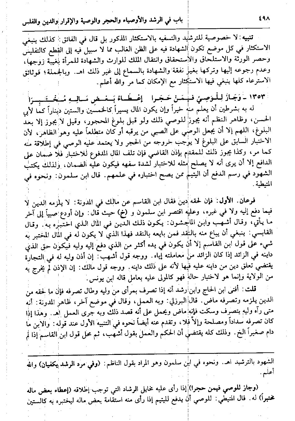 تَنْبِيه: لَا خُصُوصِيَّة للترشيد والتسفيه بالاستكثار الْمَذْكُور بل قَالَ فِي الْفَائِق: كَذَلِك يَنْبَغِي الاستكثار فِي كل مَوضِع تكون الشَّهَادَة فِيهِ على الظَّن الْغَالِب مِمَّا لَا سَبِيل فِيهِ إِلَى الْقطع كالتفليس وَحصر الْوَرَثَة والاستلحاق والاستحقاق وانتقال الْملك للْوَارِث وَالشَّهَادَة للْمَرْأَة بغيبة زَوجهَا، وَعدم رُجُوعه إِلَيْهَا وَتركهَا بِغَيْر نَفَقَة وَالشَّهَادَة بِالسَّمَاعِ إِلَى غير ذَلِك اه. وَبِالْجُمْلَةِ؛ فوثائق الاسترعاء كلهَا يَنْبَغِي فِيهَا الاستكثار مَعَ الْإِمْكَان كَمَا مر وَالله أعلم. وَجَازَ لِلْوَصِيِّ فيمَنْ حَجَرا إعْطَاءُ بَعْضِ مَالِهِ مُخْتَبِرَا لَهُ بِهِ بِشَرْطَيْنِ أَن يعلم مِنْهُ خيرا وَإِن يكون المَال يَسِيرا كالخمسين وَالسِّتِّينَ دِينَارا كَمَا لأبي الْحسن، وَظَاهر النّظم أَنه يجوز للْوَصِيّ ذَلِك وَلَو قبل بُلُوغ الْمَحْجُور، وَقيل لَا يجوز إِلَّا بعد الْبلُوغ، اللَّهُمَّ إِلَّا أَن يَجْعَل الْوَصِيّ على الصَّبِي من يرقبه أَو كَانَ متطلعاً عَلَيْهِ وَهُوَ الظَّاهِر، لِأَن الاختبار السَّابِق على الْبلُوغ لَا يُوجب خُرُوجه من الْحجر وَلَا يعْتَمد عَلَيْهِ الْوَصِيّ فِي إطلاقة مِنْهُ كَمَا مر، وَكَذَا يجوز ذَلِك للمقدم بِإِذن القَاضِي فَإِن تلف المَال الْمَدْفُوع للاختبار فَلَا ضَمَان على الدَّافِع إِلَّا أَن يرى أَنه لَا يصلح مثله للاختبار لشدَّة سفهه فَيكون عَلَيْهِ الضَّمَان، وَلذَلِك يكْتب الشُّهُود فِي رسم الدّفع أَن الْيَتِيم مِمَّن يَصح اختباره فِي علمهمْ. قَالَ ابْن سَلمُون: وَنَحْوه فِي الْمُتَيْطِيَّة. فرعان. الأول: فَإِن لحقه دين فَقَالَ ابْن الْقَاسِم عَن مَالك فِي الْمُدَوَّنَة: لَا يلْزمه الدّين لَا فِيمَا دفع إِلَيْهِ وَلَا فِي غَيره، وَعَلِيهِ اقْتصر ابْن سَلمُون و (خَ) حَيْثُ قَالَ: وَإِن أودع صَبيا إِلَى آخر مَا يَأْتِي، وَقَالَ أَشهب وَابْن الْمَاجشون: يكون ذَلِك الدّين فِي المَال الَّذِي اختبره بِهِ. وَقَالَ الْقَابِسِيّ: يَنْبَغِي أَن يُبَاع مِنْهُ بِالنَّقْدِ فَمن بَايعه بِالنَّقْدِ فَهَذَا الَّذِي لَا يكون لَهُ فِي المَال المختبر بِهِ شَيْء على قَول ابْن الْقَاسِم إِلَّا أَن يكون فِي يَده أَكثر من الَّذِي دفع إِلَيْهِ وليه فَيكون حق الَّذِي داينه فِي الزَّائِد إِذا كَانَ الزَّائِد من مُعَامَلَته إِيَّاه. وَوجه قَول أَشهب: إِن أذن وليه لَهُ فِي التِّجَارَة يَقْتَضِي تعلق دين من داينه عَلَيْهِ فِيهَا لِأَنَّهُ على ذَلِك داينه. وَوجه قَول مَالك: إِن الْإِذْن لم يخرج بِهِ من الْولَايَة وَإِنَّمَا هُوَ لاختبار حَاله فَهُوَ كالمولى عَلَيْهِ بعامل قَالَه ابْن يُونُس. قلت: أفتى ابْن الْحَاج وَابْن رشد أَنه إِذا تصرف بمرأى من وليه وَطَالَ تصرفه فَإِن مَا لحقه من الدّين يلْزمه وتصرفه مَاض. قَالَ الْبُرْزُليّ: وَبِه الْعَمَل، وَقَالَ فِي مَوضِع آخر، ظَاهر الْمُدَوَّنَة: أَنه مَتى رَآهُ وليه يتَصَرَّف وَسكت فَإِنَّهُ مَاض وَيحمل على أَنه قصد ذَلِك وَبِه جرى الْعَمَل اه. وَهَذَا إِذا كَانَ تصرفه سداداً ومصلحة وإلاَّ فَلَا، وَتقدم عَنهُ أَيْضا نَحوه فِي التَّنْبِيه الأول عِنْد قَوْله: وَالِابْن مَا دَامَ صَغِيرا الخ. وَذَلِكَ كُله يَقْتَضِي أَن الحكم وَالْعَمَل بقول أَشهب، ثمَّ مَحل قَول ابْن الْقَاسِم إِذا لم