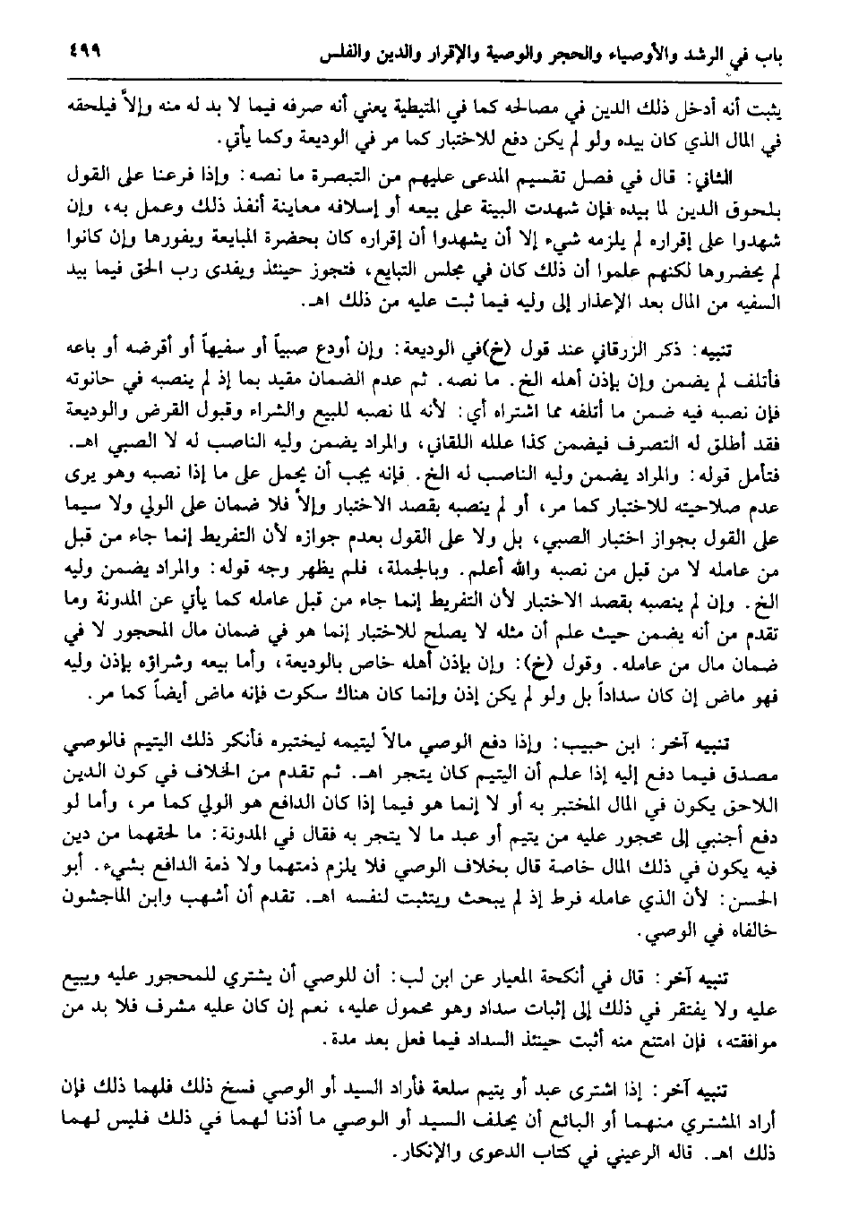 يثبت أَنه أَدخل ذَلِك الدّين فِي مَصَالِحه كَمَا فِي الْمُتَيْطِيَّة يَعْنِي أَنه صرفه فِيمَا لَا بُد لَهُ مِنْهُ وإلاَّ فيلحقه فِي المَال الَّذِي كَانَ بِيَدِهِ وَلَو لم يكن دفع للاختبار كَمَا مر فِي الْوَدِيعَة وكما يَأْتِي. الثَّانِي: قَالَ فِي فصل تَقْسِيم الْمُدعى عَلَيْهِم من التَّبْصِرَة مَا نَصه: وَإِذا فرعنا على القَوْل بلحوق الدّين لما بِيَدِهِ فَإِن شهِدت الْبَيِّنَة على بَيْعه أَو إسلافه مُعَاينَة أنفذ ذَلِك وَعمل بِهِ، وَإِن شهدُوا على إِقْرَاره لم يلْزمه شَيْء إِلَّا أَن يشْهدُوا أَن إِقْرَاره كَانَ بِحَضْرَة الْمُبَايعَة وبفورها وَإِن كَانُوا لم يحضروها لكِنهمْ علمُوا أَن ذَلِك كَانَ فِي مجْلِس التبايع، فَتجوز حِينَئِذٍ ويفدى رب الْحق فِيمَا بيد السَّفِيه من المَال بعد الْإِعْذَار إِلَى وليه فِيمَا ثَبت عَلَيْهِ من ذَلِك اه. تَنْبِيه: ذكر الزّرْقَانِيّ عِنْد قَول (خَ) فِي الْوَدِيعَة: وَإِن أودع صَبيا أَو سَفِيها أَو أقْرضهُ أَو بَاعه فأتلف لم يضمن وَإِن بِإِذن أَهله الخ. مَا نَصه. ثمَّ عدم الضَّمَان مُقَيّد بِمَا إِذْ لم ينصبه فِي حانوته فَإِن نَصبه فِيهِ ضمن مَا أتْلفه مِمَّا اشْتَرَاهُ أَي: لِأَنَّهُ لما نَصبه للْبيع وَالشِّرَاء وَقبُول الْقَرْض والوديعة فقد أطلق لَهُ التَّصَرُّف فَيضمن كَذَا علله اللَّقَّانِيّ، وَالْمرَاد يضمن وليه الناصب لَهُ لَا الصَّبِي اه. فَتَأمل قَوْله: وَالْمرَاد يضمن وليه الناصب لَهُ الخ. فَإِنَّهُ يجب أَن يحمل على مَا إِذا نَصبه وَهُوَ يرى عدم صلاحيته للاختبار كَمَا مر، أَو لم ينصبه بِقصد الاختبار وإلاَّ فَلَا ضَمَان على الْوَلِيّ وَلَا سِيمَا على القَوْل بِجَوَاز اختبار الصَّبِي، بل وَلَا على القَوْل بِعَدَمِ جَوَازه لِأَن التَّفْرِيط إِنَّمَا جَاءَ من قبل من عَامله لَا من قبل من نَصبه وَالله أعلم. وَبِالْجُمْلَةِ، فَلم يظْهر وَجه قَوْله: وَالْمرَاد يضمن وليه الخ. وَإِن لم ينصبه بِقصد الاختبار لِأَن التَّفْرِيط إِنَّمَا جَاءَ من قبل عَامله كَمَا يَأْتِي عَن الْمُدَوَّنَة وَمَا تقدم من أَنه يضمن حَيْثُ علم أَن مثله لَا يصلح للاختبار إِنَّمَا هُوَ فِي ضَمَان مَال الْمَحْجُور لَا فِي ضَمَان مَال من عَامله. وَقَول (خَ) : وَإِن بِإِذن أَهله خَاص بالوديعة، وَأما بَيْعه وشراؤه بِإِذن وليه فَهُوَ مَاض إِن كَانَ سداداً بل وَلَو لم يكن إِذن وَإِنَّمَا كَانَ هُنَاكَ سكُوت فَإِنَّهُ مَاض أَيْضا كَمَا مر. تَنْبِيه آخر: ابْن حبيب: وَإِذا دفع الْوَصِيّ مَالا ليتيمه ليختبره فَأنْكر ذَلِك الْيَتِيم فالوصي مُصدق فِيمَا دفع إِلَيْهِ إِذا علم أَن الْيَتِيم كَانَ يتجر اه. ثمَّ تقدم من الْخلاف فِي كَون الدّين اللَّاحِق يكون فِي المَال المختبر بِهِ أَو لَا إِنَّمَا هُوَ فِيمَا إِذا كَانَ الدَّافِع هُوَ الْوَلِيّ كَمَا مر، وَأما لَو دفع أَجْنَبِي إِلَى مَحْجُور عَلَيْهِ من يَتِيم أَو عبد مَا لَا يتجر بِهِ فَقَالَ فِي الْمُدَوَّنَة: مَا لحقهما من دين فِيهِ يكون فِي ذَلِك المَال خَاصَّة قَالَ بِخِلَاف الْوَصِيّ فَلَا يلْزم ذمتهما وَلَا ذمَّة الدَّافِع بِشَيْء. أَبُو الْحسن: لِأَن الَّذِي عَامله فرط إِذْ لم يبْحَث ويتثبت لنَفسِهِ اه. تقدم أَن أَشهب وَابْن الْمَاجشون خالفاه فِي الْوَصِيّ. تَنْبِيه آخر: قَالَ فِي أنكحة المعيار عَن ابْن لب: أَن للْوَصِيّ أَن يَشْتَرِي للمحجور عَلَيْهِ وَيبِيع عَلَيْهِ وَلَا يفْتَقر فِي ذَلِك إِلَى إِثْبَات سداد وَهُوَ مَحْمُول عَلَيْهِ، نعم إِن كَانَ عَلَيْهِ مشرف فَلَا بُد من مُوَافَقَته، فَإِن امْتنع مِنْهُ أثبت حِينَئِذٍ السداد فِيمَا فعل بعد مُدَّة. تَنْبِيه آخر: إِذا اشْترى عبد أَو يَتِيم سلْعَة فَأَرَادَ السَّيِّد أَو الْوَصِيّ فسخ ذَلِك فَلَهُمَا ذَلِك فَإِن أَرَادَ المُشْتَرِي مِنْهُمَا أَو البَائِع أَن يحلف السَّيِّد أَو الْوَصِيّ مَا أذنا لَهما فِي ذَلِك 