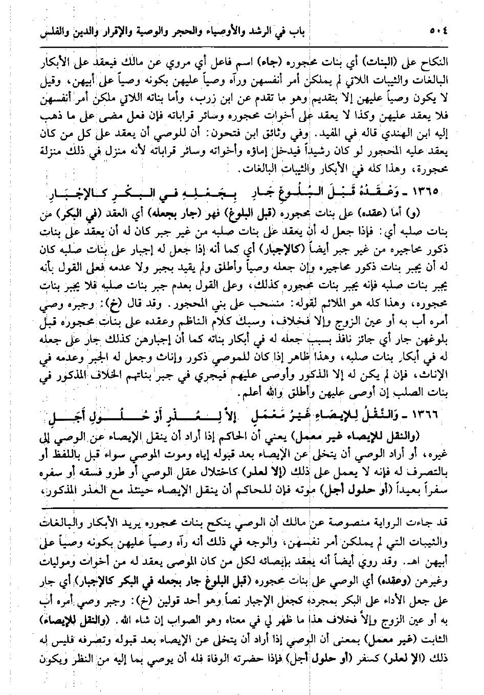 النِّكَاح على (الْبَنَات) أَي بَنَات مَحْجُوره (جَاءَ) اسْم فَاعل أَي مَرْوِيّ عَن مَالك فيعقد على الْأَبْكَار البالغات والثيبات اللَّاتِي لم يملكن أَمر أَنْفسهنَّ وَرَآهُ وَصِيّا عَلَيْهِنَّ بِكَوْنِهِ وَصِيّا على أبيهن وَقيل لَا يكون وَصِيّا عَلَيْهِنَّ إِلَّا بِتَقْدِيم وَهُوَ مَا تقدم عَن ابْن زرب، وَأما بَنَاته اللَّاتِي ملكن أَمر أَنْفسهنَّ فَلَا يعْقد عَلَيْهِنَّ وَكَذَا لَا يعْقد على أَخَوَات مَحْجُوره وَسَائِر قراباته فَإِن فعل مضى على مَا ذهب إِلَيْهِ ابْن الْهِنْدِيّ قَالَه فِي الْمُفِيد. وَفِي وثائق ابْن فتحون: أَن للْوَصِيّ أَن يعْقد على كل من كَانَ يعْقد عَلَيْهِ الْمَحْجُور لَو كَانَ رشيدا فَيدْخل إماؤه وأخواته وَسَائِر قراباته لِأَنَّهُ منزل فِي ذَلِك منزلَة محجورة، وَهَذَا كُله فِي الْأَبْكَار والثيبات البالغات. وَعْقَدُهُ قَبْلَ البُلُوغِ جَارِ بِجَعْلِهِ فِي البكْرِ كالإجْبَارِ (و) أما (عقده) على بَنَات مَحْجُوره (قبل الْبلُوغ) فَهُوَ (جَار بجعله) أَي العقد (فِي الْبكر) من بَنَات صلبه أَي: فَإِذا جعل لَهُ أَن يعْقد على بَنَات صلبه من غير جبر كَانَ لَهُ أَن يعْقد على بَنَات ذُكُور محاجيره من غير جبر أَيْضا (كالإجبار) أَي كَمَا أَنه إِذا جعل لَهُ إِجْبَار على بَنَات صلبه كَانَ لَهُ أَن يجْبر بَنَات ذُكُور محاجيره وَإِن جعله وَصِيّا وَأطلق وَلم يُقيد بجبر وَلَا عَدمه فعلى القَوْل بِأَنَّهُ يجْبر بَنَات صلبه فَإِنَّهُ يجْبر بَنَات مَحْجُوره كَذَلِك، وعَلى القَوْل بِعَدَمِ جبر بَنَات صلبه فَلَا يجْبر بَنَات مَحْجُوره، وَهَذَا كُله هُوَ الملائم لقَوْله: منسحب على بني الْمَحْجُور. وَقد قَالَ (خَ) : وجبره وَصِيّ أمره أَب بِهِ أَو عين الزَّوْج وَإِلَّا فخلاف، وسبك كَلَام النَّاظِم وعقده على بَنَات مَحْجُوره قبل بلوغهن جَار أَي جَائِز نَافِذ بِسَبَب جعله لَهُ فِي أبكار بَنَاته كَمَا أَن إجبارهن كَذَلِك جَار على جعله لَهُ فِي أبكار بَنَات صلبه، وَهَذَا ظَاهر إِذا كَانَ للْمُوصي ذُكُور وإناث وَجعل لَهُ الْجَبْر وَعَدَمه فِي الْإِنَاث، فَإِن لم يكن لَهُ إِلَّا الذُّكُور وَأوصى عَلَيْهِم فَيجْرِي فِي جبر بناتهم الْخلاف الْمَذْكُور فِي بَنَات الصلب إِن أوصى عَلَيْهِنَّ وَأطلق وَالله أعلم. وَالنَّقْلُ لِلإيصَاءِ غَيْرُ مَعْمَلٍ إلاَّ لِعُذْرٍ أَوْ حُلُولِ أَجَلِ (وَالنَّقْل للإيصاء غير معمل) يَعْنِي أَن الْحَاكِم إِذا أَرَادَ أَن ينْقل الْإِيصَاء عَن الْوَصِيّ إِلَى غَيره، أَو أَرَادَ الْوَصِيّ أَن يتخلى عَن الْإِيصَاء بعد قبُوله إِيَّاه وَمَوْت الْمُوصي سَوَاء قبل بِاللَّفْظِ أَو بِالتَّصَرُّفِ لَهُ فَإِنَّهُ لَا يعْمل على ذَلِك (إِلَّا لعذر) كاختلال عقل الْوَصِيّ أَو طرُو فسقه أَو سَفَره سفرا بَعيدا (أَو حُلُول أجل) مَوته فَإِن للْحَاكِم أَن ينْقل الْإِيصَاء حِينَئِذٍ مَعَ الْعذر الْمَذْكُور،