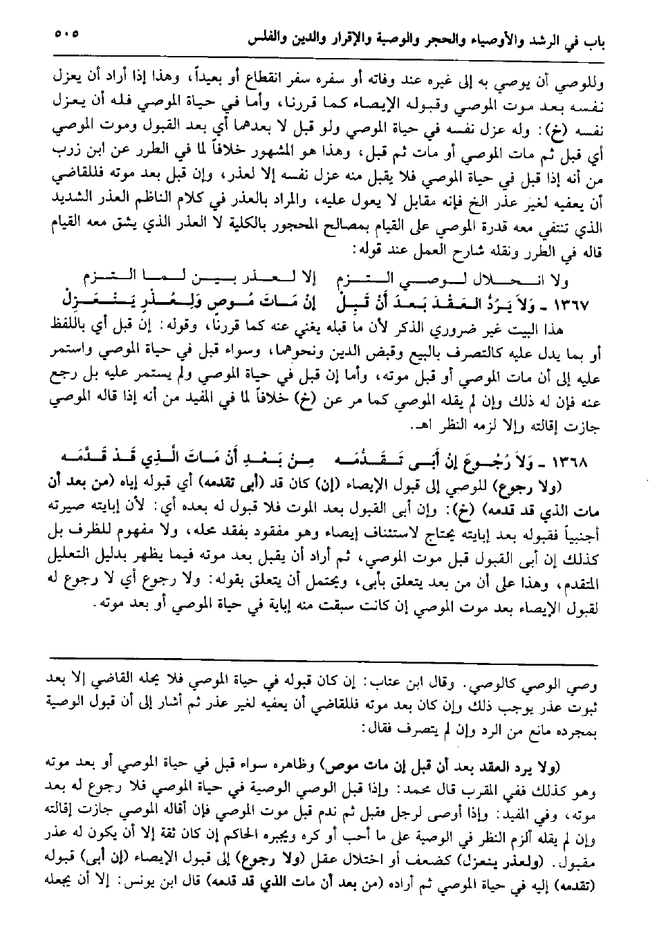 وللوصي أَن يُوصي بِهِ إِلَى غَيره عِنْد وَفَاته أَو سَفَره سفر انْقِطَاع أَو بَعيدا، وَهَذَا إِذا أَرَادَ أَن يعْزل نَفسه بعد موت الْمُوصي وقبوله الْإِيصَاء كَمَا قَررنَا، وَأما فِي حَيَاة الْمُوصي فَلهُ أَن يعْزل نَفسه (خَ) : وَله عزل نَفسه فِي حَيَاة الْمُوصي وَلَو قبل لَا بعدهمَا أَي بعد الْقبُول وَمَوْت الْمُوصي أَي قبل ثمَّ مَاتَ الْمُوصي أَو مَاتَ ثمَّ قبل، وَهَذَا هُوَ الْمَشْهُور خلافًا لما فِي الطرر عَن ابْن زرب من أَنه إِذا قبل فِي حَيَاة الْمُوصي فَلَا يقبل مِنْهُ عزل نَفسه إِلَّا لعذر، وَإِن قبل بعد مَوته فللقاضي أَن يعفيه لغير عذر الخ فَإِنَّهُ مُقَابل لَا يعول عَلَيْهِ، وَالْمرَاد بالعذر فِي كَلَام النَّاظِم الْعذر الشَّديد الَّذِي تَنْتفِي مَعَه قدرَة الْمُوصي على الْقيام بمصالح الْمَحْجُور بِالْكُلِّيَّةِ لَا الْعذر الَّذِي يشق مَعَه الْقيام قَالَه فِي الطرر وَنَقله شَارِح الْعَمَل عِنْد قَوْله: وَلَا انحلال لوصي الْتزم إِلَّا لعذر بَين لما الْتزم وَلاَ يَرُدُّ العَقْدَ بَعْدَ أَنْ قَبِلْ إنْ مَاتَ مُوصٍ وَلِعُذْرٍ يَنْعَزِلْ هَذَا الْبَيْت غير ضَرُورِيّ الذّكر لِأَن مَا قبله يُغني عَنهُ كَمَا قَررنَا، وَقَوله: إِن قبل أَي بِاللَّفْظِ أَو بِمَا يدل عَلَيْهِ كالتصرف بِالْبيعِ وَقبض الدّين وَنَحْوهمَا، وَسَوَاء قبل فِي حَيَاة الْمُوصي وَاسْتمرّ عَلَيْهِ إِلَى أَن مَاتَ الْمُوصي أَو قبل مَوته، وَأما إِن قبل فِي حَيَاة الْمُوصي وَلم يسْتَمر عَلَيْهِ بل رَجَعَ عَنهُ فَإِن لَهُ ذَلِك وَإِن لم يقلهُ الْمُوصي كَمَا مر عَن (خَ) خلافًا لما فِي الْمُفِيد من أَنه إِذا قَالَه الْمُوصي جَازَت إقالته وَإِلَّا لزمَه النّظر اه. وَلاَ رُجُوعَ إنْ أَبَى تَقَدُّمَه مِنْ بَعْدِ أَنْ مَاتَ الَّذِي قَدْ قَدَّمَه (وَلَا رُجُوع) للْوَصِيّ إِلَى قبُول الْإِيصَاء (إِن) كَانَ قد (أَبى تقدمه) أَي قبُوله إِيَّاه (من بعد أَن مَاتَ الَّذِي قد قدمه) (خَ) : وَإِن أَبى الْقبُول بعد الْمَوْت فَلَا قبُول لَهُ بعده أَي: لِأَن إبايته صيرته أَجْنَبِيّا فقبوله بعد إبايته يحْتَاج لاستئناف إيصاء وَهُوَ مَفْقُود بفقد مَحَله، وَلَا مَفْهُوم للظرف بل كَذَلِك إِن أَبى الْقبُول قبل موت الْمُوصي، ثمَّ أَرَادَ أَن يقبل بعد مَوته فِيمَا يظْهر بِدَلِيل التَّعْلِيل الْمُتَقَدّم، وَهَذَا على أَن من بعد يتَعَلَّق بأبى، وَيحْتَمل أَن يتَعَلَّق بقوله: وَلَا رُجُوع أَي لَا رُجُوع لَهُ لقبُول الْإِيصَاء بعد موت الْمُوصي إِن كَانَت سبقت مِنْهُ إباية فِي حَيَاة الْمُوصي أَو بعد مَوته.