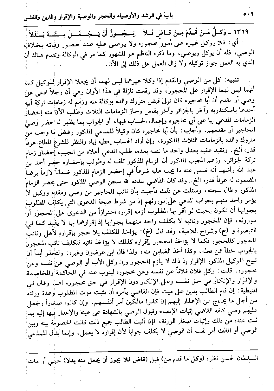 وَكلُّ مَنْ قُدِّمَ مِنْ قاضٍ فَلاَ يَجُوزُ أَنْ يَجْعَلَ مِنْهُ بَدَلاَ أَي: فَلَا يُوكل غَيره على أُمُور مَحْجُوره وَلَا يوصى عَلَيْهِ عِنْد حُضُور وَفَاته بِخِلَاف الْوَصِيّ، فَلهُ أَن يُوكل ويوصي، وَمَا ذكره النَّاظِم هُوَ الْمَشْهُور كَمَا مر فِي الْوكَالَة وَتقدم هُنَاكَ أَن الَّذِي بِهِ الْعَمَل جَوَاز تَوْكِيله وَلَا زَالَ الْعَمَل على ذَلِك إِلَى الْآن. تَنْبِيه: كل من الْوَصِيّ والمقدم إِذا وكلا غَيرهمَا لَيْسَ لَهما أَن يجعلا الْإِقْرَار للْوَكِيل كَمَا أَنَّهُمَا لَيْسَ لَهما الْإِقْرَار على الْمَحْجُور، وَقد وَقعت نازلة فِي هَذَا الأوان وَهِي أَن رجلا ادّعى على وَصِيّ أَو مقدم أَن أَبَا محاجيره كَانَ تولى قبض مَتْرُوك وَالِده بوكالة مِنْهُ وزمم لَهُ زمامات تَرِكَة أَبِيه أَحدهَا باسكندرية وَآخر بالجزائر وَآخر بفاس وَحَازَ الزمامات الثَّلَاث وَطلب الْآن مِنْهُ إِحْضَار الزمامات الْمُدَّعِي بهَا على أبي محاجيره وإعمال الْحساب فِيهَا، أَو الْجَواب بِمَا يظْهر لَهُ حضر وَصِيّ المحاجير أَو مقدمهم، وَأجَاب: بِأَن أَبَا محاجيره كَانَ وَكيلا للْمُدَّعِي الْمَذْكُور وَقبض مَا وَجب من مَتْرُوك وَالِده بالزمامات الثَّلَاث الْمَذْكُورَة، وَإِن أَرَادَ الْحساب يُعْطِيهِ إِيَّاه وَالنَّظَر للشَّرْع المطاع عرفا قدره الخ. وتقيد عقبه بِعدْل وَاحِد مَا نَصه بَعْدَمَا طلب الْمُدَّعِي أَعْلَاهُ من الْمُجيب إِحْضَار زِمَام تَرِكَة الجزائر، وَزعم الْمُجيب الْمَذْكُور أَن الزِّمَام الْمَذْكُور تلف لَهُ وطولب بإحضاره حضر أَحْمد بن عبد الله وَأشْهد أَنه ضمن عَنهُ مَا يجب عَلَيْهِ شرعا فِي إِحْضَار الزِّمَام الْمَذْكُور ضمانا لَازِما بِرِضا الْمَضْمُون لَهُ عرفا قدره الخ. وَقد كَانَ القَاضِي سدده الله سجن الْوَصِيّ الْمَذْكُور حَتَّى يحضر الزِّمَام الْمَذْكُور وَطَالَ سجنه، وسئلت عَن ذَلِك فأجبت بِأَن نَائِب المحاجير من وَصِيّ ومقدم ووكيل لَا يُؤمر وَاحِد مِنْهُم بِجَوَاب الْمُدَّعِي على موروثهم إِذْ من شَرط صِحَة الدَّعْوَى الَّتِي يُكَلف الْمَطْلُوب بجوابها أَن تكون بِحَيْثُ لَو أقرّ بهَا الْمَطْلُوب لزمَه إِقْرَاره احْتِرَازًا من الدَّعْوَى على الْمَحْجُور أَو موروثه، فَإِن الْمَحْجُور ونائبه لَا يُكَلف وَاحِد مِنْهُمَا بجوابها إِذْ إقرارهما بهَا لَا يُفِيد كَمَا فِي التَّبْصِرَة و (ح) وشراح اللامية، وَقد قَالَ (خَ) : يُؤَاخذ الْمُكَلف بِلَا حجر بِإِقْرَارِهِ لأهل ونائب الْمَحْجُور كالمحجور فَكَمَا لَا يُؤَاخذ الْمَحْجُور بِإِقْرَارِهِ كَذَلِك لَا يُؤَاخذ نَائِبه فتكليف نَائِب الْمَحْجُور بِالْجَوَابِ خطأ مِمَّن فعله، وَكَذَا أَخذ الضَّامِن مِنْهُ، وَلذَا قَالَ ابْن عرضون وَغَيره: ولتحذر أبدا أَن تبيح للْوَكِيل الْمَذْكُور الْإِقْرَار إِذْ ذَاك لَا يلْزم الْمَحْجُور وَإِن وكل الْأَب أَو الْوَصِيّ عَن نَفسه وَعَن مَحْجُوره. قلت: وكل فلَان فلَانا عَن نَفسه وَعَن مَحْجُوره لينوب عَنهُ فِي المحاكمة والمخاصمة وَالْإِقْرَار وَالْإِنْكَار فِي حق نَفسه وعَلى الْإِنْكَار دون الْإِقْرَار فِي حق مَحْجُوره اه. وَقَالَ فِي الْمُتَيْطِيَّة: إِن قَامَ الطَّالِب بدين على ميت فَإِن القَاضِي يَأْمُرهُ أَن يثبت موت الْمَطْلُوب وعدة ورثته من أجل مَا يحْتَاج من الْإِعْذَار إِلَيْهِم إِن كَانُوا مالكين أَمر أنفسهم، وَإِن كَانُوا صغَارًا وَجعل عَلَيْهِم وَصِيّ كلفه القَاضِي إِثْبَات الْإِيصَاء وَقبُول الْوَصِيّ بِالشَّهَادَةِ على عينه والإعذار فِيهَا إِلَيْهِ بِمَا ثَبت عِنْده من ذَلِك وَإِثْبَات صغَار الْوَرَثَة، فَإِذا أثبت الطَّالِب جَمِيع ذَلِك كَانَت الْخُصُومَة بَينه وَبَين الْوَصِيّ أَو الْمَالِك أَمر نَفسه أَن الْوَصِيّ لَا يُكَلف جَوَابا لِأَن إِقْرَاره لَا يعْمل، وَإِنَّمَا يُقَال للْمُدَّعِي