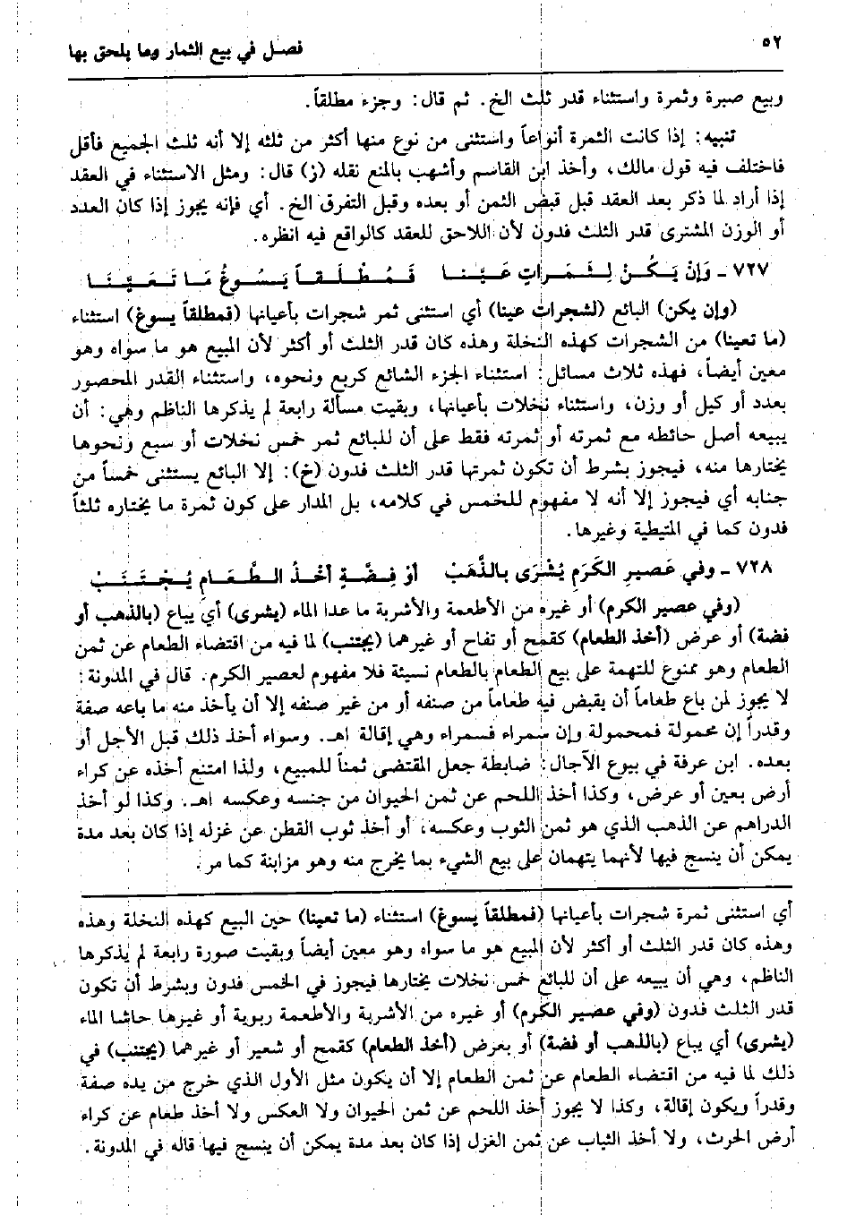 وَبيع صبرَة وَثَمَرَة واستثناء قدر ثلث الخ. ثمَّ قَالَ: وجزء مُطلقًا. تَنْبِيه: إِذا كَانَت الثَّمَرَة أنواعاً وَاسْتثنى من نوع مِنْهَا أَكثر من ثلثه إِلَّا أَنه ثلث الْجَمِيع فَأَقل فَاخْتلف فِيهِ قَول مَالك، وَأخذ ابْن الْقَاسِم وَأَشْهَب بِالْمَنْعِ نَقله (ز) قَالَ: وَمثل الِاسْتِثْنَاء فِي العقد إِذا أَرَادَ لما ذكر بعد العقد قبل قبض الثّمن أَو بعده وَقبل التَّفَرُّق الخ. أَي فَإِنَّهُ يجوز إِذا كَانَ الْعدَد أَو الْوَزْن الْمُشْتَرى قدر الثُّلُث فدون لِأَن اللَّاحِق للْعقد كالواقع فِيهِ اُنْظُرْهُ. وَإنْ يَكُنْ لِثَمَراتٍ عَيَّنا فَمُطْلَقاً يَسُوغُ مَا تَعَيَّنَا (وَإِن يكن) البَائِع (لشجرات عينا) أَي اسْتثْنى ثَمَر شجرات بِأَعْيَانِهَا (فمطلقاً يسوغ) اسْتثِْنَاء (مَا تعينا) من الشجرات كهذه النَّخْلَة وَهَذِه كَانَ قدر الثُّلُث أَو أَكثر لِأَن الْمَبِيع هُوَ مَا سواهُ وَهُوَ معِين أَيْضا، فَهَذِهِ ثَلَاث مسَائِل: اسْتثِْنَاء الْجُزْء الشَّائِع كربع وَنَحْوه، واستثناء الْقدر المحصور بِعَدَد أَو كيل أَو وزن، واستثناء نخلات بِأَعْيَانِهَا، وَبقيت مَسْأَلَة رَابِعَة لم يذكرهَا النَّاظِم وَهِي: أَن يَبِيعهُ أصل حَائِطه مَعَ ثَمَرَته أَو ثَمَرَته فَقَط على أَن للْبَائِع ثَمَر خمس نخلات أَو سبع وَنَحْوهَا يختارها مِنْهُ، فَيجوز بِشَرْط أَن تكون ثَمَرَتهَا قدر الثُّلُث فدون (خَ) : إِلَّا البَائِع يسْتَثْنى خمْسا من جنابه أَي فَيجوز إِلَّا أَنه لَا مَفْهُوم للخمس فِي كَلَامه، بل الْمدَار على كَون ثَمَرَة مَا يختاره ثلثا فدون كَمَا فِي الْمُتَيْطِيَّة وَغَيرهَا. وَفِي عَصيرِ الكَرَمِ يُشْرَى بالذَّهَبْ أوْ فِضَّةٍ أخْذُ الطَّعَامِ يُجْتَنَبْ (وَفِي عصير الْكَرم) أَو غَيره من الْأَطْعِمَة والأشربة مَا عدا المَاء (يشرى) أَي يُبَاع (بِالذَّهَب أَو فضَّة) أَو عرض (أَخذ الطَّعَام) كقمح أَو تفاح أَو غَيرهمَا (يجْتَنب) لما فِيهِ من اقْتِضَاء الطَّعَام عَن ثمن الطَّعَام وَهُوَ مَمْنُوع للتُّهمَةِ على بيع الطَّعَام بِالطَّعَامِ نَسِيئَة فَلَا مَفْهُوم لعصير الْكَرم. قَالَ فِي الْمُدَوَّنَة: لَا يجوز لمن بَاعَ طَعَاما أَن يقبض فِيهِ طَعَاما من صنفه أَو من غير صنفه إِلَّا أَن يَأْخُذ مِنْهُ مَا بَاعه صفة وَقدرا إِن مَحْمُولَة فمحمولة وَإِن سمراء فسمراء وَهِي إِقَالَة اه. وَسَوَاء أَخذ ذَلِك قبل الْأَجَل أَو بعده. ابْن عَرَفَة فِي بُيُوع الْآجَال: ضابطة جعل الْمُقْتَضى ثمنا للْمَبِيع، وَلذَا امْتنع أَخذه عَن كِرَاء أَرض بِعَين أَو عرض، وَكَذَا أَخذ اللَّحْم عَن ثمن الْحَيَوَان من جنسه وَعَكسه اه. وَكَذَا لَو أَخذ الدَّرَاهِم عَن الذَّهَب الَّذِي هُوَ ثمن الثَّوْب وَعَكسه، أَو أَخذ ثوب الْقطن عَن غزله إِذا كَانَ بعد مُدَّة يُمكن أَن ينسج فِيهَا لِأَنَّهُمَا يتهمان على بيع الشَّيْء بِمَا يخرج مِنْهُ وَهُوَ مزابنة كَمَا مر.