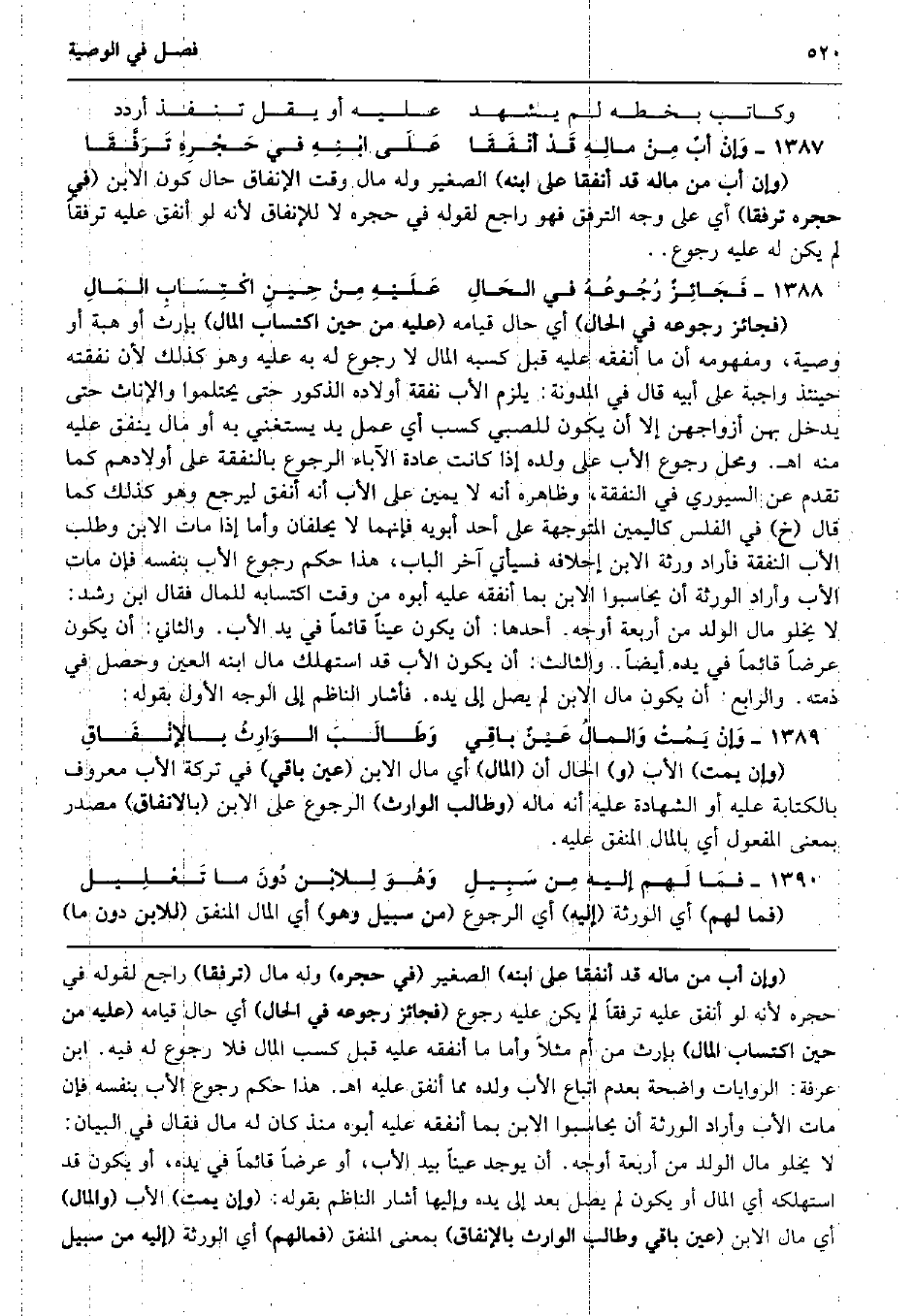 وَكَاتب بِخَطِّهِ لم يشْهد عَلَيْهِ أَو يقل تنفذ أردد وَإنْ أبٌ مِنْ مالِهِ قَدْ أنْفَقَا عَلَى ابْنِهِ فِي حَجْرِهِ تَرَفَّقَا (وَإِن أَب من مَاله قد أنفقا على ابْنه) الصَّغِير وَله مَال وَقت الْإِنْفَاق حَال كَون الابْن (فِي حجره ترفقا) أَي على وَجه الترفق فَهُوَ رَاجع لقَوْله فِي حجره لَا للإنفاق لِأَنَّهُ لَو أنْفق عَلَيْهِ ترفقاً لم يكن لَهُ عَلَيْهِ رُجُوع. . فَجَائِزٌ رُجُوعُهُ فِي الحَالِ عَلَيْهِ مِنْ حِينِ اكْتِسَابِ المَالِ (فَجَائِز رُجُوعه فِي الْحَال) أَي حَال قِيَامه (عَلَيْهِ من حِين اكْتِسَاب المَال) بِإِرْث أَو هبة أَو وَصِيَّة، وَمَفْهُومه أَن مَا أنفقهُ عَلَيْهِ قبل كَسبه المَال لَا رُجُوع لَهُ بِهِ عَلَيْهِ وَهُوَ كَذَلِك لِأَن نَفَقَته حِينَئِذٍ وَاجِبَة على أَبِيه قَالَ فِي الْمُدَوَّنَة: يلْزم الْأَب نَفَقَة أَوْلَاده الذُّكُور حَتَّى يحتلموا وَالْإِنَاث حَتَّى يدْخل بِهن أَزوَاجهنَّ إِلَّا أَن يكون للصَّبِيّ كسب أَي عمل يَد يَسْتَغْنِي بِهِ أَو مَال ينْفق عَلَيْهِ مِنْهُ اه. وَمحل رُجُوع الْأَب على وَلَده إِذا كَانَت عَادَة الْآبَاء الرُّجُوع بِالنَّفَقَةِ على أَوْلَادهم كَمَا تقدم عَن السيوري فِي النَّفَقَة، وَظَاهره أَنه لَا يَمِين على الْأَب أَنه أنْفق ليرْجع وَهُوَ كَذَلِك كَمَا قَالَ (خَ) فِي الْفلس كاليمين المتوجهة على أحد أَبَوَيْهِ فَإِنَّهُمَا لَا يحلفان وَأما إِذا مَاتَ الابْن وَطلب الْأَب النَّفَقَة فَأَرَادَ وَرَثَة الابْن إحلافه فَسَيَأْتِي آخر الْبَاب، هَذَا حكم رُجُوع الْأَب بِنَفسِهِ فَإِن مَاتَ الْأَب وَأَرَادَ الْوَرَثَة أَن يحاسبوا الابْن بِمَا أنفقهُ عَلَيْهِ أَبوهُ من وَقت اكتسابه لِلْمَالِ فَقَالَ ابْن رشد: لَا يَخْلُو مَال الْوَلَد من أَرْبَعَة أوجه. أَحدهَا: أَن يكون عينا قَائِما فِي يَد الْأَب. وَالثَّانِي: أَن يكون عرضا قَائِما فِي يَده أَيْضا. وَالثَّالِث: أَن يكون الْأَب قد اسْتهْلك مَال ابْنه الْعين وَحصل فِي ذمَّته. وَالرَّابِع: أَن يكون مَال الابْن لم يصل إِلَى يَده. فَأَشَارَ النَّاظِم إِلَى الْوَجْه الأول بقوله: وَإنْ يَمُتْ وَالمالُ عَيْنٌ باقِي وَطَالَبَ الوَارِثُ بالإنْفَاقِ (وَإِن يمت) الْأَب (و) الْحَال أَن (المَال) أَي مَال الابْن (عين بَاقِي) فِي تَرِكَة الْأَب مَعْرُوف بِالْكِتَابَةِ عَلَيْهِ أَو الشَّهَادَة عَلَيْهِ أَنه مَاله (وطالب الْوَارِث) الرُّجُوع على الابْن (بالانفاق) مصدر بِمَعْنى الْمَفْعُول أَي بِالْمَالِ الْمُنفق عَلَيْهِ. فمَا لَهم إِلَيْهِ مِن سَبِيلِ وَهُوَ لِلابْن دُونَ مَا تَعْلِيل (فَمَا لَهُم) أَي الْوَرَثَة (إِلَيْهِ) أَي الرُّجُوع (من سَبِيل وَهُوَ) أَي المَال الْمُنفق (للِابْن دون مَا)