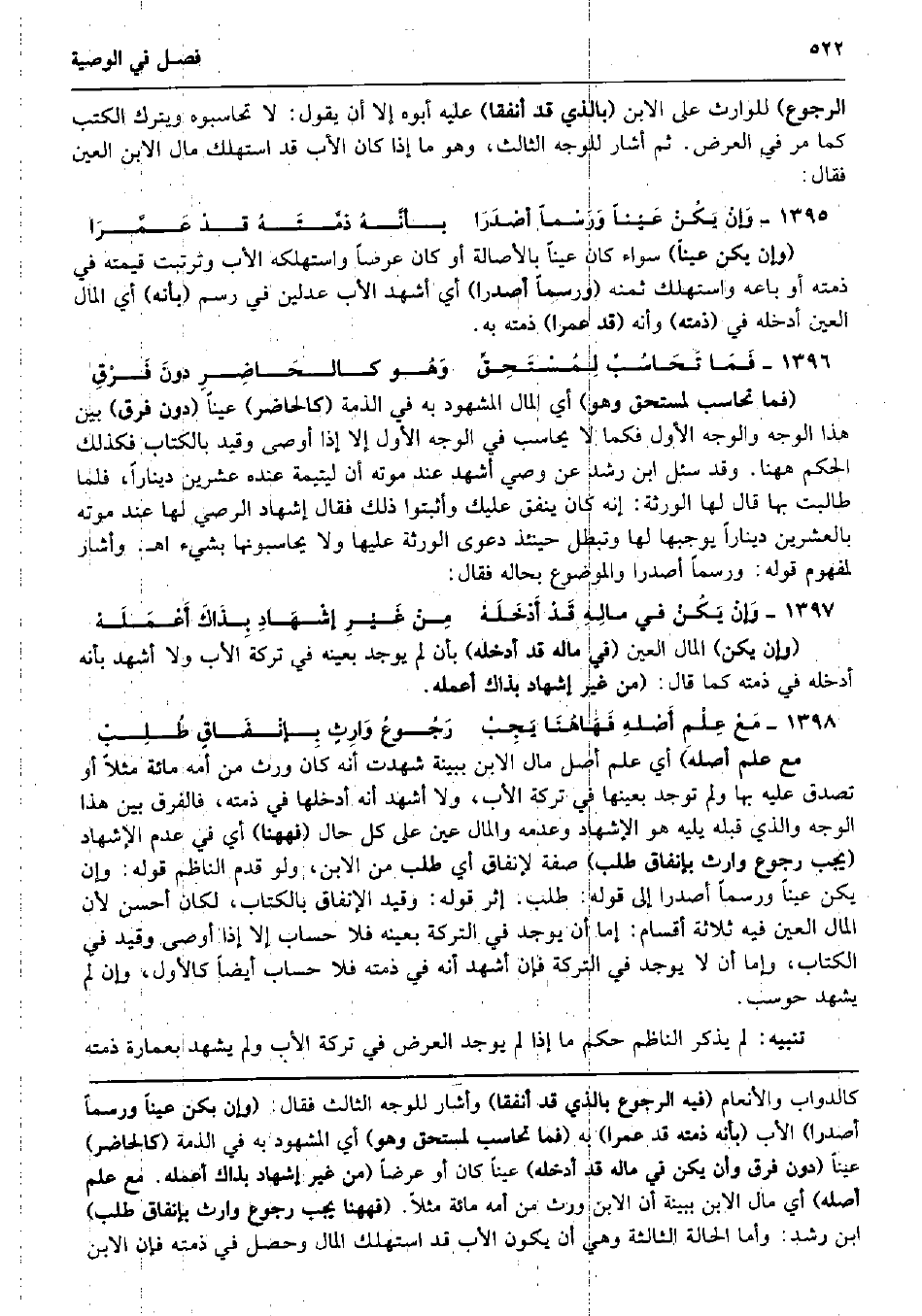 الرُّجُوع) للْوَارِث على الابْن (بِالَّذِي قد أنفقا) عَلَيْهِ أَبوهُ إِلَّا أَن يَقُول: لَا تحاسبوه وَيتْرك الْكتب كَمَا مر فِي الْعرض. ثمَّ أَشَارَ للْوَجْه الثَّالِث، وَهُوَ مَا إِذا كَانَ الْأَب قد اسْتهْلك مَال الابْن الْعين فَقَالَ: وَإنْ يَكُنْ عَيْناً وَرَسْماً أصْدَرَا بأنَّهُ ذمَّتَهُ قدْ عَمَّرَا (وَإِن يكن عينا) سَوَاء كَانَ عينا بِالْأَصَالَةِ أَو كَانَ عرضا واستهلكه الْأَب وترتبت قِيمَته فِي ذمَّته أَو بَاعه واستهلك ثمنه (ورسماً أصْدرَا) أَي أشهد الْأَب عَدْلَيْنِ فِي رسم (بِأَنَّهُ) أَي المَال الْعين أدخلهُ فِي (ذمَّته) وَأَنه (قد عمرا) ذمَّته بِهِ. فَمَا تَحَاسُبٌ لِمُسْتَحِقِّ وَهُو كالحَاضِرِ دونَ فَرْقِ (فَمَا تحاسب لمستحق وَهُوَ) أَي المَال الْمَشْهُود بِهِ فِي الذِّمَّة (كالحاضر) عينا (دون فرق) بَين هَذَا الْوَجْه وَالْوَجْه الأول فَكَمَا لَا يُحَاسب فِي الْوَجْه الأول إِلَّا إِذا أوصى وَقيد بِالْكتاب فَكَذَلِك الحكم هَهُنَا. وَقد سُئِلَ ابْن رشد عَن وَصِيّ أشهد عِنْد مَوته أَن ليتيمة عِنْده عشْرين دِينَارا، فَلَمَّا طالبت بهَا قَالَ لَهَا الْوَرَثَة: إِنَّه كَانَ ينْفق عَلَيْك وأثبتوا ذَلِك فَقَالَ إِشْهَاد الْوَصِيّ لَهَا عِنْد مَوته بالعشرين دِينَارا يُوجِبهَا لَهَا وَتبطل حِينَئِذٍ دَعْوَى الْوَرَثَة عَلَيْهَا وَلَا يحاسبونها بِشَيْء اه. وَأَشَارَ لمَفْهُوم قَوْله: ورسماً أصْدرَا والموضوع بِحَالهِ فَقَالَ: وَإنْ يَكُنْ فِي مالِهِ قَدْ أَدْخَلَهْ مِنْ غَيْرِ إشْهَادِ بِذَاكَ أَعْمَلَهْ (وَإِن يكن) المَال الْعين (فِي مَاله قد أدخلهُ) بِأَن لم يُوجد بِعَيْنِه فِي تَرِكَة الْأَب وَلَا أشهد بِأَنَّهُ أدخلهُ فِي ذمَّته كَمَا قَالَ: (من غير إِشْهَاد بِذَاكَ أعمله. مَعْ عِلْمِ أَصْلهِ فَهَاهُنَا يَجِبْ رَجُوعُ وَارِثٍ بِإنْفَاقٍ طُلِبْ مَعَ علم أَصله) أَي علم أصل مَال الابْن بِبَيِّنَة شهِدت أَنه كَانَ ورث من أمه مائَة مثلا أَو تصدق عَلَيْهِ بهَا وَلم تُوجد بِعَينهَا فِي تَرِكَة الْأَب، وَلَا أشهد أَنه أدخلها فِي ذمَّته فَالْفرق بَين هَذَا الْوَجْه وَالَّذِي قبله يَلِيهِ هُوَ الْإِشْهَاد وَعَدَمه وَالْمَال عين على كل حَال (فههنا) أَي فِي عدم الْإِشْهَاد (يجب رُجُوع وَارِث بإنفاق طلب) صفة لإنفاق أَي طلب من الابْن، وَلَو قدم النَّاظِم قَوْله: وَإِن يكن عينا ورسماً أصْدرَا إِلَى قَوْله: طلب. إِثْر قَوْله: وَقيد الْإِنْفَاق بِالْكتاب، لَكَانَ أحسن لِأَن المَال الْعين فِيهِ ثَلَاثَة أَقسَام: إِمَّا أَن يُوجد فِي التَّرِكَة بِعَيْنِه فَلَا حِسَاب إِلَّا إِذا أوصى وَقيد فِي الْكتاب، وَإِمَّا أَن لَا يُوجد فِي التَّرِكَة فَإِن أشهد أَنه فِي ذمَّته فَلَا حِسَاب أَيْضا كَالْأولِ، وَإِن لم يشْهد حُوسِبَ. تَنْبِيه: لم يذكر النَّاظِم حكم مَا إِذا لم يُوجد الْعرض فِي تَرِكَة الْأَب وَلم يشْهد بعمارة ذمَّته