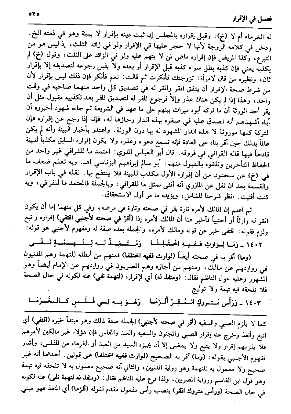 لَهُ الْغُرَمَاء أم لَا (خَ) : وَقبل إِقْرَاره بِالْمَجْلِسِ إِن ثَبت دينه بِإِقْرَار لَا بِبَيِّنَة وَهُوَ فِي ذمَّته الخ. وَدخل فِي كَلَامه الزَّوْجَة لِأَنَّهَا لَا حجر عَلَيْهَا فِي الْإِقْرَار وَلَو فِي زَائِد الثُّلُث، إِذْ لَيْسَ هُوَ من التَّبَرُّع، وَكَذَا الْمَرِيض فَإِن إِقْرَاره مَاض لمن لَا يتهم عَلَيْهِ وَلَو فِي الزَّائِد على الثُّلُث، وَقَول (خَ) لم يكذبهُ يَعْنِي فَإِن كذبه بَطل سَوَاء كذبه قبل الْإِقْرَار أَو بعده وَلَا يقبل رُجُوعه لتصديقه إِلَّا بِإِقْرَار ثَان، وَنَظِيره من قَالَ لامْرَأَة: تَزَوَّجتك فأنكرت ثمَّ قَالَت: نعم فَأنْكر فَإِن ذَلِك لَيْسَ بِإِقْرَار لِأَن من شَرط صِحَة الْإِقْرَار أَن يتَّفق الْمقر وَالْمقر لَهُ فِي تَصْدِيق كل وَاحِد مِنْهُمَا صَاحبه فِي وَقت وَاحِد، وَهَذَا إِذا لم يكن هُنَاكَ عذر وإلاَّ فرجوع الْمقر لَهُ لتصديق الْمقر بعد تَكْذِيبه مَقْبُول مثل أَن يقر أحد الْوَرَثَة أَن مَا تَركه أَبوهُ مِيرَاث بَينهم على مَا عهد فِي الشَّرِيعَة ثمَّ جَاءَهُ شُهُود أَخْبرُوهُ أَن أَبَاهُ أشهدهم أَنه تصدق عَلَيْهِ فِي صغره بِهَذِهِ الدَّار وحازها لَهُ، فَإِنَّهُ إِذا رَجَعَ عَن إِقْرَاره فَإِن التَّرِكَة كلهَا موروثة لَا هَذِه الدَّار الْمَشْهُود لَهُ بهَا دون الْوَرَثَة. وَاعْتذر بأخبار الْبَيِّنَة وَأَنه لم يكن عَالما بذلك حِين أقرّ بناه على الْعَادة فَإِنَّهُ تسمع دَعْوَاهُ وعذره وَلَا يكون إِقْرَاره السَّابِق مُكَذبا للبينة قادحاً فِيهَا قَالَه الْقَرَافِيّ فِي فروقه. قَالَ أَبُو الْعَبَّاس الملوي: اعْتمد مَا للقرافي غير وَاحِد من الْحفاظ الْمُتَأَخِّرين وتلقوه بِالْقبُولِ مِنْهُم: أَبُو سَالم إِبْرَاهِيم اليزناسي اه. وَبِه تعلم ضعف مَا فِي (خَ) عَن سَحْنُون من أَن إِقْرَاره الأول مكذب للبينة فَلَا ينْتَفع بهَا. نَقله فِي بَاب الْإِقْرَار وَالْقِسْمَة بعد ان نقل عَن الْمَازرِيّ أَنه أفتى بِمثل مَا للقرافي، وَبِالْجُمْلَةِ فَالْمُعْتَمَد مَا للقرافي وَبِه كنت أَفْتيت. انْظُر شرحنا للشامل، وَيُؤَيِّدهُ مَا مر أول الِاسْتِحْقَاق. ثمَّ اعْلَم إِن الْمَالِك لأَمره تَارَة يقر فِي صِحَّته وَتارَة فِي مَرضه، وَفِي كل مِنْهُمَا إِمَّا أَن يكون الْمقر لَهُ وَارِثا أَو أَجْنَبِيّا فَأخْبر هُنَا أَن الْمَالِك لأَمره إِذا (أقرَّ فِي صِحَّته لأَجْنَبِيّ اقتفي) إِقْرَاره وَاتبع وَلزِمَ فَقَوله: اقتفى خبر عَن قَوْله وَمَالك لأَمره، وَالْجُمْلَة بعده صفة لَهُ وَمَفْهُوم لأَجْنَبِيّ هُوَ قَوْله: وَمَا لِوَارِثٍ ففيهِ اخْتُلِفَا وَمُنْفِذٌ لَهُ لِتُهمْةٍ نَفَى (وَمَا) أقرّ بِهِ فِي صِحَّته أَيْضا (لوَارث فَفِيهِ اخْتلفَا) فَمنهمْ من أبْطلهُ للتُّهمَةِ وهم المدنيون فِي روايتهم عَن مَالك، وَمِنْهُم من أجَازه وهم المصريون فِي روايتهم عَن الإِمَام أَيْضا وَهُوَ الْمَشْهُور وَعَلِيهِ عول النَّاظِم فَقَالَ: (ومنفذ لَهُ) أَي لإِقْرَاره (لتهمة نفى) عَنهُ لكَونه فِي حَال الصِّحَّة فَلَا تلْحقهُ فِيهِ تُهْمَة وَلَا توليج. وَرَأْس مَتروكٍ المُقِرِّ أَلزَمَا وَهْوَ بهِ فِي فَلَسٍ كالغُرَمَا