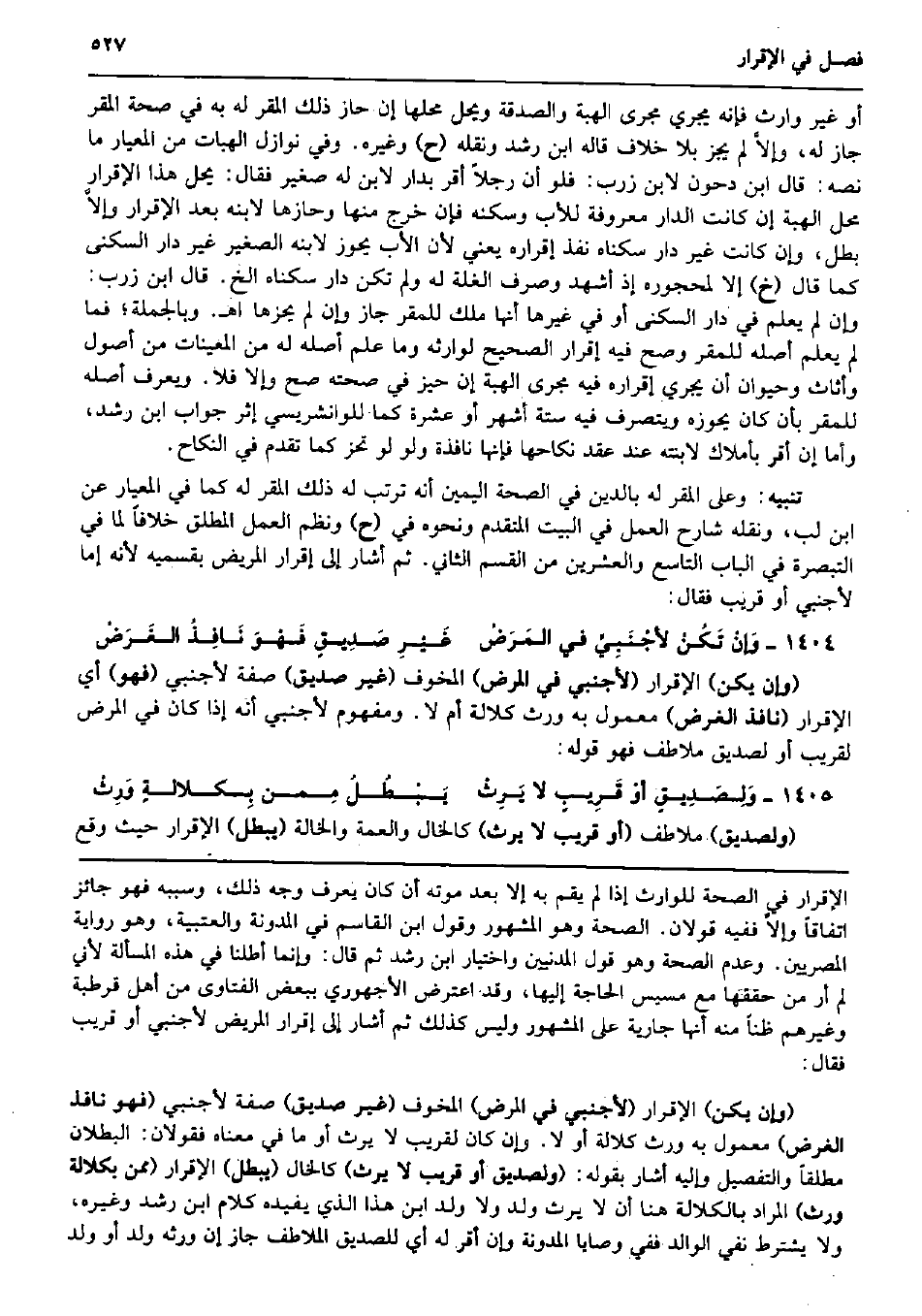 أَو غير وَارِث فَإِنَّهُ يجْرِي مجْرى الْهِبَة وَالصَّدَََقَة وَيحل محلهَا إِن حَاز ذَلِك الْمقر لَهُ بِهِ فِي صِحَة الْمقر جَازَ لَهُ، وإلاَّ لم يجز بِلَا خلاف قَالَه ابْن رشد وَنَقله (ح) وَغَيره. وَفِي نَوَازِل الهبات من المعيار مَا نَصه: قَالَ ابْن دحون لِابْنِ زرب: فَلَو أَن رجلا أقرّ بدار لِابْنِ لَهُ صَغِير فَقَالَ: يحل هَذَا الْإِقْرَار مَحل الْهِبَة إِن كَانَت الدَّار مَعْرُوفَة للْأَب وسكنه فَإِن خرج مِنْهَا وحازها لِابْنِهِ بعد الْإِقْرَار وإلاَّ بَطل، وَإِن كَانَت غير دَار سكناهُ نفذ إِقْرَاره يَعْنِي لِأَن الْأَب يحوز لِابْنِهِ الصَّغِير غير دَار السُّكْنَى كَمَا قَالَ (خَ) إِلَّا لمحجوره إِذْ أشهد وَصرف الْغلَّة لَهُ وَلم تكن دَار سكناهُ الخ. قَالَ ابْن زرب: وَإِن لم يعلم فِي دَار السُّكْنَى أَو فِي غَيرهَا أَنَّهَا ملك للْمقر جَازَ وَإِن لم يحزها اه. وَبِالْجُمْلَةِ؛ فَمَا لم يعلم أَصله للْمقر وَصَحَّ فِيهِ إِقْرَار الصَّحِيح لوَارِثه وَمَا علم أَصله لَهُ من المعينات من أصُول وأثاث وحيوان أَن يجْرِي إِقْرَاره فِيهِ مجْرى الْهِبَة إِن حيّز فِي صِحَّته صَحَّ وَإِلَّا فَلَا. وَيعرف أَصله للْمقر بِأَن كَانَ يحوزه ويتصرف فِيهِ سِتَّة أشهر أَو عشرَة كَمَا للوانشريسي إِثْر جَوَاب ابْن رشد، وَأما إِن أقرّ بأملاك لابنته عِنْد عقد نِكَاحهَا فَإِنَّهَا نَافِذَة وَلَو لَو تحز كَمَا تقدم فِي النِّكَاح. تَنْبِيه: وعَلى الْمقر لَهُ بِالدّينِ فِي الصِّحَّة الْيَمين أَنه ترَتّب لَهُ ذَلِك الْمقر لَهُ كَمَا فِي المعيار عَن ابْن لب، وَنَقله شَارِح الْعَمَل فِي الْبَيْت الْمُتَقَدّم وَنَحْوه فِي (ح) ونظم الْعَمَل الْمُطلق خلافًا لما فِي التَّبْصِرَة فِي الْبَاب التَّاسِع وَالْعِشْرين من الْقسم الثَّانِي. ثمَّ أَشَارَ إِلَى إِقْرَار الْمَرِيض بقسميه لِأَنَّهُ إِمَّا لأَجْنَبِيّ أَو قريب فَقَالَ: وَإنْ تَكُنْ لأجْنَبِيَ فِي المَرَضْ غَيْرِ صَدِيقٍ فَهْوَ نَافِذُ الغَرَضْ (وَإِن يكن) الْإِقْرَار (لأَجْنَبِيّ فِي الْمَرَض) الْمخوف (غير صديق) صفة لأَجْنَبِيّ (فَهُوَ) أَي الْإِقْرَار (نَافِذ الْغَرَض) مَعْمُول بِهِ ورث كَلَالَة أم لَا. وَمَفْهُوم لأَجْنَبِيّ أَنه إِذا كَانَ فِي الْمَرَض لقريب أَو لصديق ملاطف فَهُوَ قَوْله: وَلِصَدِيقٍ أوْ قَرِيبٍ لَا يَرِثْ يَبْطُلُ مِمن بِكلالةٍ وَرِثْ (ولصديق) ملاطف (أَو قريب لَا يَرث) كالخال والعمة وَالْخَالَة (يبطل) الْإِقْرَار حَيْثُ وَقع