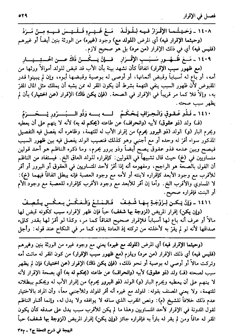 وَحَيْثُما الإقْرَارُ فِيهِ لِلْوَلَدْ مَعْ غَيْرِهِ فَلَيْسَ فيهِ مِنْ مَرَدْ (وحيثما الْإِقْرَار فِيهِ) أَي الْمَرَض (للْوَلَد مَعَ) وجود (غَيره) من الْوَرَثَة بَنِينَ أَيْضا أَو غَيرهم (فَلَيْسَ فِيهِ) أَي فِي ذَلِك الْإِقْرَار (من مرد) بل هُوَ صَحِيح لَازم. مَعَ ظُهُورِ سَبَبِ الإقْرَارِ فإنْ يَكُنْ ذَاكَ عَن اخْتِيَارِ (مَعَ ظُهُور سَبَب الْإِقْرَار) اتِّفَاقًا كَأَن تشهد بَيِّنَة بِأَن الْأَب قد قبض للْوَلَد أَمْوَالًا ورثهَا من أمه، أَو بَاعَ لَهُ أسباباً وَقبض أثمانها، أَو أوصى لَهُ بِوَصِيَّة وَقَبضهَا أَبوهُ، وَإِن لم يبينوا قدر الْمَقْبُوض لِأَن ظُهُور السَّبَب يَنْفِي التُّهْمَة بِشَرْط أَن يكون الْمقر لَهُ مِمَّن يشبه أَن يملك مثل المَال المقرّ بِهِ، وإلاَّ فَلَا كَمَا مر قَرِيبا فِي الْإِقْرَار فِي الصِّحَّة. (فَإِن يكن ذَاك) الْإِقْرَار (عَن اخْتِيَار) بِأَن لم يظْهر سَبَب صِحَّته. فَذُو عُقوقٍ وَانْحِرَافٍ يُحْكَمُ لَهُ بِهِ وَذُو البُرُورِ يُحْرَمُ (ف) ولد (ذُو عقوق) لِأَبِيهِ (وانحراف) عَن طَاعَته (يحكم لَهُ بِهِ) لِأَنَّهُ لَا يتهم على أَن يُعْطِيهِ وَيحرم الْبَار (و) الْوَلَد (ذُو البرور يحرم) من إِقْرَار الْأَب لَهُ للتُّهمَةِ، وَظَاهره أَنه يفصل فِيهِ التَّفْصِيل الْمَذْكُور سَوَاء أقرّ لَهُ وَحده أَو مَعَ أَجْنَبِي وَهُوَ كَذَلِك فنصيب الْوَلَد يفصل فِيهِ بَين ظُهُور السَّبَب فَيصح وَبَين عَدمه فذو عقوق يَصح أَيْضا وَذُو برور يحرم، وَمَا ذكره النَّاظِم هُوَ أحد قَوْلَيْنِ متساويين فِي (خَ) حَيْثُ قَالَ تَشْبِيها فِي الْقَوْلَيْنِ: كإقراره للْوَلَد الْعَاق الخ. فيستفاد من النَّاظِم أَن القَوْل بِالصِّحَّةِ هُوَ الرَّاجِح، وَمَفْهُومه أَنه إِذا أقرّ لأحد المتساويين فِي العقوق أَو البرور أَو أقرّ للأقرب مَعَ وجود الْأَبْعَد كإقراره لابنته أَو لأمه مَعَ وجود الْعصبَة فَإِنَّهُ يبطل اتِّفَاقًا فيهمَا (خَ) : لَا الْمسَاوِي وَالْأَقْرَب الخ. وَأما إِن أقرّ للأبعد مَعَ وجود الْأَقْرَب كإقراره للْعصبَةِ مَعَ وجود الْأُم أَو الْبِنْت فَإِقْرَاره صَحِيح. وَإنْ يَكن لِزَوْجَةٍ بِهَا شُغِفْ فَالمَنْعُ وَالْعَكْسُ بعكْسٍ يتَّصِفْ (وَإِن يكن) إِقْرَار الْمَرِيض (لزوجة بهَا شغف) حبا فَإِن ظهر لإِقْرَاره سَبَب كَكَوْنِهِ قبض لَهَا مَالا أَو عرف أَنه بَاعَ لَهَا أسباباً فلإقرار صَحِيح اتِّفَاقًا كَمَا مر، وَكَذَا لَو أقرّ لَهَا بِقدر كالىء صَدَاقهَا لِأَنَّهُ لَو لم يقرّ بِهِ لَأَخَذته من تركته إِذْ الْعَادة بَقَاؤُهُ كَمَا مر فِي النِّكَاح عِنْد قَوْله: وَأجل
