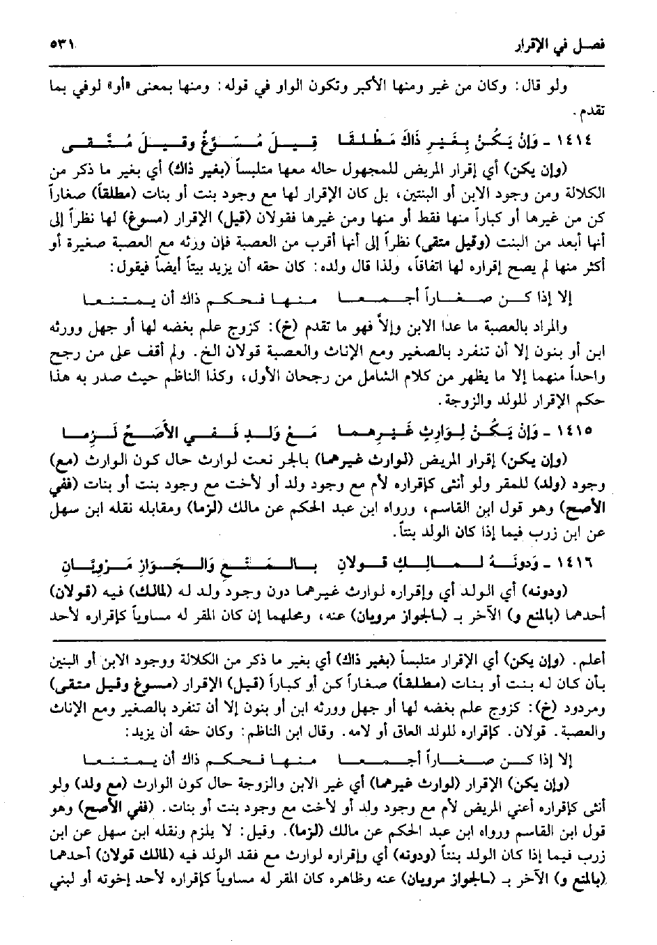 وَلَو قَالَ: وَكَانَ من غير وَمِنْهَا الْأَكْبَر وَتَكون الْوَاو فِي قَوْله: وَمِنْهَا بِمَعْنى (أَو) لوفي بِمَا تقدم. وَإنْ يَكُنْ بِغَيْرِ ذَاكَ مَطْلقَا قِيلَ مُسَوَّغٌ وقيلَ مُتَّقى (وَإِن يكن) أَي إِقْرَار الْمَرِيض للْمَجْهُول حَاله مَعهَا متلبساً (بِغَيْر ذَاك) أَي بِغَيْر مَا ذكر من الْكَلَالَة وَمن وجود الابْن أَو البنتين، بل كَانَ الْإِقْرَار لَهَا مَعَ وجود بنت أَو بَنَات (مُطلقًا) صغَارًا كن من غَيرهَا أَو كبارًا مِنْهَا فَقَط أَو مِنْهَا وَمن غَيرهَا فَقَوْلَانِ (قيل) الْإِقْرَار (مسوغ) لَهَا نظرا إِلَى أَنَّهَا أبعد من الْبِنْت (وَقيل متقى) نظرا إِلَى أَنَّهَا أقرب من الْعصبَة فَإِن وَرثهُ مَعَ الْعصبَة صَغِيرَة أَو أَكثر مِنْهَا لم يَصح إِقْرَاره لَهَا اتِّفَاقًا، وَلذَا قَالَ وَلَده: كَانَ حَقه أَن يزِيد بَيْتا أَيْضا فَيَقُول: إِلَّا إِذا كن صغَارًا أجمعا مِنْهَا فَحكم ذَاك أَن يمتنعا وَالْمرَاد بالعصبة مَا عدا الابْن وإلاَّ فَهُوَ مَا تقدم (خَ) : كَزَوج علم بغضه لَهَا أَو جهل وَورثه ابْن أَو بنُون إِلَّا أَن تنفرد بالصغير وَمَعَ الْإِنَاث والعصبة قَولَانِ الخ. وَلم أَقف على من رجح وَاحِدًا مِنْهُمَا إِلَّا مَا يظْهر من كَلَام الشَّامِل من رُجْحَان الأول، وَكَذَا النَّاظِم حَيْثُ صدر بِهِ هَذَا حكم الْإِقْرَار للْوَلَد وَالزَّوْجَة. وَإنْ يَكُنْ لِوَارِثٍ غَيْرِهما مَعْ وَلدٍ فَفي الأَصَحِّ لَزِما (وَإِن يكن) إِقْرَار الْمَرِيض (لوَارث غَيرهمَا) بِالْجَرِّ نعت لوَارث حَال كَون الْوَارِث (مَعَ) وجود (ولد) للْمقر وَلَو أُنْثَى كإقراره لأم مَعَ وجود ولد أَو لأخت مَعَ وجود بنت أَو بَنَات (فَفِي الْأَصَح) وَهُوَ قَول ابْن الْقَاسِم، وَرَوَاهُ ابْن عبد الحكم عَن مَالك (لزما) وَمُقَابِله نَقله ابْن سهل عَن ابْن زرب فِيمَا إِذا كَانَ الْوَلَد بِنْتا. وَدونَهُ لمالِكٍ قولانِ بالمَنْعِ وَالجَوَازِ مَرْوِيَّانِ (ودونه) أَي الْوَلَد أَي وَإِقْرَاره لوَارث غَيرهمَا دون وجود ولد لَهُ (لمَالِك) فِيهِ (قَولَانِ) أَحدهمَا (بِالْمَنْعِ و) الآخر ب (الْجَوَاز مرويان) عَنهُ، ومحلهما إِن كَانَ الْمقر لَهُ مُسَاوِيا كإقراره لأحد