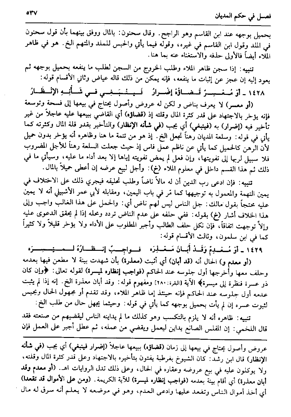 بحميل بِوَجْهِهِ عِنْد ابْن الْقَاسِم وَهُوَ الرَّاجِح. وَقَالَ سَحْنُون: بِالْمَالِ ووفق بَينهمَا بِأَن قَول سَحْنُون فِي الملد وَقَول ابْن الْقَاسِم فِي غَيره، وَقَوله فِيمَا يَأْتِي وَالْحَبْس للملد وَالْمُتَّهَم الخ. هُوَ فِي ظَاهر الملاء أَيْضا فَالْأولى حذفه والاستغناء عَنهُ بِمَا هُنَا. تَنْبِيه: إِذا سجن ظَاهر الملاء وَطلب الْخُرُوج من السجْن لطلب مَا يَنْفَعهُ بحميل بِوَجْهِهِ ثمَّ يعود إِلَيْهِ إِن عجز عَن إِثْبَات مَا يَنْفَعهُ، فَإِنَّهُ يُمكن من ذَلِك قَالَه عِيَاض وَثَانِي الْأَقْسَام قَوْله: أوْ مُعْسِرٌ قَضاؤُهُ إضْرارُ فَينْبَغِي فِي شَأْنِهِ الإنْظَارُ (أَو مُعسر) لَا يعرف بناض وَلَكِن لَهُ عرُوض وأصول يحْتَاج فِي بيعهَا إِلَى فسحة وتوسعة فَإِنَّهُ يُؤَخر بِالِاجْتِهَادِ على قدر كَثْرَة المَال وقلته إِذْ (قَضَاؤُهُ) أَي القَاضِي بِبَيْعِهَا عَلَيْهِ عَاجلا من غير تَأْخِير فِيهِ (إِضْرَار) بِهِ (فَيَنْبَغِي) أَي يجب (فِي شَأْنه الإنظار) وَالتَّأْخِير بِقدر قلَّة المَال وكثرته كَمَا يَأْتِي فِي قَوْله: وسلعة الْمديَان رهنا تجْعَل الخ. إِذْ هُوَ من تَتِمَّة مَا هُنَا وَظَاهره أَنه يُؤَخر بِدُونِ حميل لِأَن الرَّهْن كالحميل كَمَا يَأْتِي عَن ناظم عمل فاس إِذْ حَيْثُ جعلت السّلْعَة رهنا للأجل الْمَضْرُوب فَلَا سَبِيل لِرَبِّهَا إِلَى تفويتها، وَإِن فعل لم يمض تفويته إِيَّاهَا إِلَّا بعد أَدَاء مَا عَلَيْهِ، وَسَيَأْتِي مَا فِي ذَلِك ثمَّ هَذَا الْقسم دَاخل فِي مَعْلُوم الملاء (خَ) : وَأجل لبيع عرضه إِن أعْطى حميلاً بِالْمَالِ. تَنْبِيه: فَإِن ادّعى رب الدّين أَن لَهُ مَالا ناضاً وَطلب تَحْلِيفه فَيجْرِي ذَلِك على الِاخْتِلَاف فِي يَمِين التُّهْمَة والمعمول بِهِ توجيهها كَمَا مّر فِي بَاب الْيَمين، وَمُقَابِله لأبي عمر الأشبيلي أَنه لَا يَمِين عَلَيْهِ محتجاً بقول مَالك: جلّ النَّاس لَيْسَ لَهُم ناض أَي: وَالْحمل على هَذَا الْغَالِب وَاجِب وَإِلَى هَذَا الْخلاف أَشَارَ (خَ) بقوله: فَفِي حلفه على عدم الناض تردد وَمحله إِذا لم يُحَقّق الدَّعْوَى عَلَيْهِ وإلاَّ تَوَجَّهت اتِّفَاقًا، فَإِن نكل حلف الطَّالِب وأجبر الْمَطْلُوب على الْأَدَاء وَلَا يُؤَخر قَلِيلا وَلَا كثيرا كَمَا فِي ابْن سَلمُون، وثالث الْأَقْسَام قَوْله: أوْ مُعْدِمٌ وَقَدْ أَبَانَ مَعْذِرَه فواجِبٌ إنظارُهُ لميْسِرَه (أَو معدم و) الْحَال أَنه (قد أبان) أَي أثبت (معذرة) بِأَن شهِدت بَيِّنَة لَا مطْعن فِيهَا بِعَدَمِهِ وَحلف مَعهَا وأخرجها أول جُلُوسه عِنْد الْحَاكِم (فَوَاجِب إنظاره لِميسرَة) لقَوْله تَعَالَى: وَإِن كَانَ ذُو عسرة فنظرة إِلَى ميسرَة} الْآيَة (الْبَقَرَة: 280) وَمَفْهُوم قَوْله: وَقد أبان معذرة الخ. إِنَّه إِذا لم يثبت عَدمه أول جُلُوسه عِنْد الْحَاكِم فَإِنَّهُ حِينَئِذٍ إِمَّا ظَاهر الملاء، وَقد تقدم أَو مَجْهُول الْحَال وَيحبس لثُبُوت عسره إِن لم يَأْتِ بحميل بِوَجْهِهِ كَمَا يَأْتِي فِي قَوْله: وحيثما يجهل حَال من طلب الخ: تَنْبِيه: ظَاهره أَنه لَا يلْزم بالتكسب وَهُوَ كَذَلِك مَا لم يداينه النَّاس ليقضيهم من صَنعته فقد قَالَ اللَّخْمِيّ: إِن الْمُفلس الصَّانِع يداين ليعْمَل وَيَقْضِي من عمله، ثمَّ عطل أجبر على الْعَمَل فَإِن