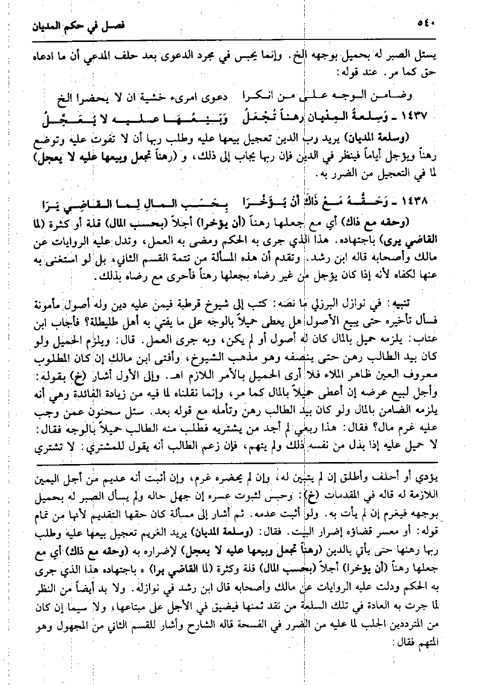 يسئل الصَّبْر لَهُ بحميل بِوَجْهِهِ الخ. وَإِنَّمَا يحبس فِي مُجَرّد الدَّعْوَى بعد حلف الْمُدَّعِي أَن مَا ادَّعَاهُ حق كَمَا مر. عِنْد قَوْله: وضامن الْوَجْه على من انكرا دَعْوَى امرىء خشيَة ان لَا يحضرا الخ وَسِلعةُ المِدْيان رهنا تُجْعَلُ وَبَيْعُهَا عَلَيْهِ لَا يُعَجَّلُ (وسلعة الْمديَان) يُرِيد رب الدّين تَعْجِيل بيعهَا عَلَيْهِ وَطلب رَبهَا أَن لَا تفوت عَلَيْهِ وتوضع رهنا ويؤجل أَيَّامًا فَينْظر فِي الدّين فَإِن رَبهَا يُجَاب إِلَى ذَلِك، و (رهنا تجْعَل وَبَيْعهَا عَلَيْهِ لَا يعجل) لما فِي التَّعْجِيل من الضَّرَر بِهِ. وَحَقُّهُ مَعْ ذَاكَ أنْ يُؤَخَّرَا بِحَسَب المالِ لِما القاضِي يَرَا (وَحقه مَعَ ذَاك) أَي مَعَ جعلهَا رهنا (أَن يؤخرا) أَََجَلًا (بِحَسب المَال) قلَّة أَو كَثْرَة (لما القَاضِي يرى) بِاجْتِهَادِهِ. هَذَا الَّذِي جرى بِهِ الحكم وَمضى بِهِ الْعَمَل، وتدل عَلَيْهِ الرِّوَايَات عَن مَالك وَأَصْحَابه قَالَه ابْن رشد. وَتقدم أَن هَذِه الْمَسْأَلَة من تَتِمَّة الْقسم الثَّانِي، بل لَو اسْتغنى بِهِ عَنْهَا لكفاه لِأَنَّهُ إِذا كَانَ يُؤَجل من غير رِضَاهُ بجعلها رهنا فأحرى مَعَ رِضَاهُ بذلك. تَنْبِيه: فِي نَوَازِل الْبُرْزُليّ مَا نَصه: كتب إِلَى شُيُوخ قرطبة فِيمَن عَلَيْهِ دين وَله أصُول مَأْمُونَة فَسَأَلَ تَأْخِيره حَتَّى يَبِيع الْأُصُول هَل يعْطى حميلاً بِالْوَجْهِ على مَا يُفْتِي بِهِ أهل طليطلة؟ فَأجَاب ابْن عتاب: يلْزمه حميل بِالْمَالِ كَانَ لَهُ أصُول أَو لم يكن، وَبِه جرى الْعَمَل. قَالَ: وَيلْزم الْحميل وَلَو كَانَ بيد الطَّالِب رهن حَتَّى ينصفه وَهُوَ مَذْهَب الشُّيُوخ، وَأفْتى ابْن مَالك إِن كَانَ الْمَطْلُوب مَعْرُوف الْعين ظَاهر الملاء فَلَا أرى الْحميل بِالْأَمر اللَّازِم اه. وَإِلَى الأول أَشَارَ (خَ) بقوله: وَأجل لبيع عرضه إِن أعْطى حميلاً بِالْمَالِ كَمَا مر، وَإِنَّمَا نَقَلْنَاهُ لما فِيهِ من زِيَادَة الْفَائِدَة وَهِي أَنه يلْزمه الضَّامِن بِالْمَالِ وَلَو كَانَ بيد الطَّالِب رهن وتأمله مَعَ قَوْله بعد. سُئِلَ سَحْنُون عَمَّن وَجب عَلَيْهِ غرم مَال؟ فَقَالَ: هَذَا ربعي لم أجد من يَشْتَرِيهِ فَطلب مِنْهُ الطَّالِب حميلاً بِالْوَجْهِ فَقَالَ: لَا حميل عَلَيْهِ إِذا بذل من نَفسه ذَلِك وَلم يتهم، فَإِن زعم الطَّالِب أَنه يَقُول للْمُشْتَرِي: لَا تشتري