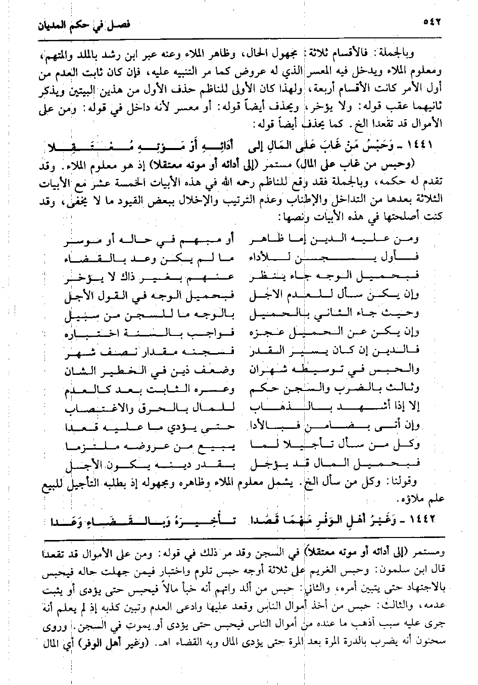 وَبِالْجُمْلَةِ: فالأقسام ثَلَاثَة: مَجْهُول الْحَال، وَظَاهر الملاء وَعنهُ عبر ابْن رشد بالملد وَالْمُتَّهَم، وَمَعْلُوم الملاء وَيدخل فِيهِ الْمُعسر الَّذِي لَهُ عرُوض كَمَا مر التَّنْبِيه عَلَيْهِ، فَإِن كَانَ ثَابت الْعَدَم من أول الْأَمر كَانَت الْأَقْسَام أَرْبَعَة، وَلِهَذَا كَانَ الأولى للناظم حذف الأول من هذَيْن الْبَيْتَيْنِ وَيذكر ثَانِيهمَا عقب قَوْله: وَلَا يُؤَخر، ويحذف أَيْضا قَوْله: أَو مُعسر لِأَنَّهُ دَاخل فِي قَوْله: وَمن على الْأَمْوَال قد تقعدا الخ. كَمَا يحذف أَيْضا قَوْله: وَحَبْسُ مَنْ غَابَ عَلى المَالِ إِلَى أدَائِهِ أَوْ مَوْتِهِ مُعْتَقِلا (وَحبس من غَابَ على المَال) مُسْتَمر (إِلَى أَدَائِهِ أَو مَوته معتقلا) إِذْ هُوَ مَعْلُوم الملاء. وَقد تقدم لَهُ حكمه، وَبِالْجُمْلَةِ فقد وَقع للناظم رَحمَه الله فِي هَذِه الأبيات الْخَمْسَة عشر مَعَ الأبيات الثَّلَاثَة بعْدهَا من التَّدَاخُل والإطناب وَعدم التَّرْتِيب والإخلال بِبَعْض الْقُيُود مَا لَا يخفى، وَقد كنت أصلحتها فِي هَذِه الأبيات وَنَصهَا: وَمن عَلَيْهِ الدّين إِمَّا ظَاهر أَو مُبْهَم فِي حَاله أَو مُوسر فَأول يسجن للْأَدَاء مَا لم يكن وعد بِالْقضَاءِ فبحميل الْوَجْه جَاءَ ينظر عَنْهُم بِغَيْر ذَاك لَا يُؤَخر وَإِن يكن سَأَلَ للعدم الاجل فبحميل الْوَجْه فِي القَوْل الْأَجَل وَحَيْثُ جَاءَ الثَّانِي بالحميل بِالْوَجْهِ مَا للسجن من سَبِيل وَإِن يكن عَن الْحميل عَجزه فَوَاجِب بِالسنةِ اختباره فالدين إِن كَانَ يسير الْقدر فسجنه مِقْدَار نصف شهر وَالْحَبْس فِي توسيطه شَهْرَان وَضعف ذين فِي الخطير الشان وثالث بِالضَّرْبِ والسجن حكم وعسره الثَّابِت بعد كَالْعدمِ إِلَّا إِذا أشهد بالذهاب لِلْمَالِ بالحرق والاغتصاب وَإِن أَتَى بضامن فبالأدا حَتَّى يُؤَدِّي مَا عَلَيْهِ قعدا وكل من سَأَلَ تأجيلا لما يَبِيع من عروضه مُلْتَزما فبحميل المَال قد يُؤَجل بِقدر دينه يكون الْأَجَل وَقَوْلنَا: وكل من سَأَلَ الخ. يَشْمَل مَعْلُوم الملاء وَظَاهره ومجهوله إِذْ بِطَلَبِهِ التَّأْجِيل للْبيع علم ملاؤه. وَغَيْرُ أهْلِ الوَفْرِ مَهْمَا قَصَدا تأْخِيرَهُ وَبالقَضَاءِ وَعَدا