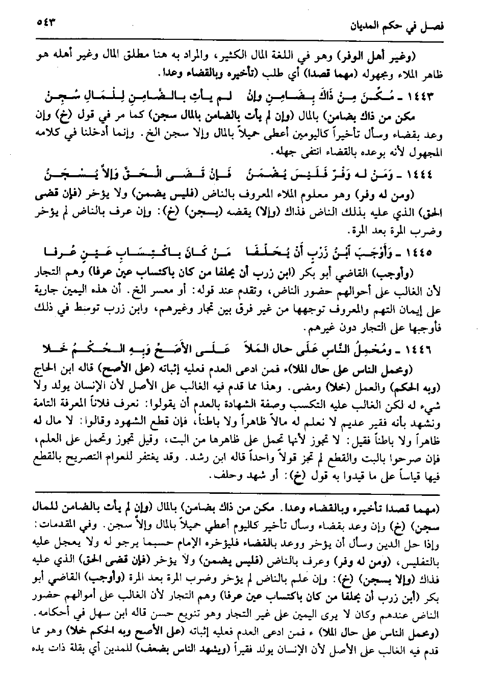 (وَغير أهل الوفر) وَهُوَ فِي اللُّغَة المَال الْكثير، وَالْمرَاد بِهِ هُنَا مُطلق المَال وَغير أَهله هُوَ ظَاهر الملاء ومجهوله (مهما قصدا) أَي طلب (تَأْخِيره وبالقضاء وَعدا. مُكِّنَ مِنْ ذَاكَ بِضَامِنِ وإنْ لم يأتِ بالضَّامِنِ لِلْمَالِ سُجِنْ مكن من ذَاك بضامن) بِالْمَالِ (وَإِن لم يَأْتِ بالضامن بِالْمَالِ سجن) كَمَا مر فِي قَول (خَ) وَإِن وعد بِقَضَاء وَسَأَلَ تَأْخِيرا كاليومين أعْطى حميلاً بِالْمَالِ وَإِلَّا سجن الخ. وَإِنَّمَا أدخلنا فِي كَلَامه الْمَجْهُول لِأَنَّهُ بوعده بِالْقضَاءِ انْتَفَى جَهله. وَمَنْ لَهُ وَفْرٌ فَلَيْسَ يُضْمَنُ فَإنْ قَضَى الْحَقَّ وَإلاَّ يُسْجَنُ (وَمن لَهُ وفر) وَهُوَ مَعْلُوم الملاء الْمَعْرُوف بالناض (فَلَيْسَ يضمن) وَلَا يُؤَخر (فَإِن قضى الْحق) الَّذِي عَلَيْهِ بذلك الناض فَذَاك (وَإِلَّا) يقضه (يسجن) (خَ) : وَإِن عرف بالناض لم يُؤَخر وَضرب الْمرة بعد الْمرة. وَأَوْجَبَ ابْنُ زَرْبٍ أَنْ يُحَلّفَا مَنْ كَانَ باكْتِسَابِ عَيْنٍ عُرفا (وَأوجب) القَاضِي أَبُو بكر (ابْن زرب أَن يحلفا من كَانَ باكتساب عين عرفا) وهم التُّجَّار لِأَن الْغَالِب على أَحْوَالهم حُضُور الناض، وَتقدم عِنْد قَوْله: أَو مُعسر الخ. أَن هَذِه الْيَمين جَارِيَة على إِيمَان التهم وَالْمَعْرُوف توجهها من غير فرق بَين تجار وَغَيرهم، وَابْن زرب توَسط فِي ذَلِك فأوجبها على التُّجَّار دون غَيرهم. ومُحْمِلُ النَّاسِ عَلَى حَال المَلاَ عَلَى الأَصَحِّ وَبِهِ الحُكْمُ خَلا (ومحمل النَّاس على حَال الملا) ء فَمن ادّعى الْعَدَم فَعَلَيهِ إثْبَاته (على الْأَصَح) قَالَه ابْن الْحَاج (وَبِه الحكم) وَالْعَمَل (خلا) وَمضى. وَهَذَا مِمَّا قدم فِيهِ الْغَالِب على الأَصْل لِأَن الْإِنْسَان يُولد وَلَا شَيْء لَهُ لَكِن الْغَالِب عَلَيْهِ التكسب وَصفَة الشَّهَادَة بِالْعدمِ أَن يَقُولُوا: نَعْرِف فلَانا الْمعرفَة التَّامَّة ونشهد بِأَنَّهُ فَقير عديم لَا نعلم لَهُ مَالا ظَاهرا وَلَا بَاطِنا، فَإِن قطع الشُّهُود وَقَالُوا: لَا مَال لَهُ ظَاهرا وَلَا بَاطِنا فَقيل: لَا تجوز لِأَنَّهَا تحمل على ظَاهرهَا من الْبَتّ، وَقيل تجوز وَتحمل على الْعلم، فَإِن صَرَّحُوا بالبت وَالْقطع لم تجز قولا وَاحِدًا قَالَه ابْن رشد. وَقد يغْتَفر للعوام التَّصْرِيح بِالْقطعِ فِيهَا قِيَاسا على مَا قيدوا بِهِ قَول (خَ) : أَو شهد وَحلف.