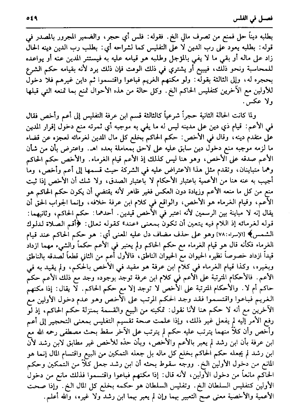 بِطَلَبِهِ دينا حل فَمنع من تصرف مَالِي الخ. فَقَوله: فلس أَي حجر، وَالضَّمِير الْمَجْرُور بِالْمَصْدَرِ فِي قَوْله: بِطَلَبِهِ يعود على رب الدّين لَا على التَّفْلِيس كَمَا لشراحه أَي: بِطَلَب رب الدّين دينه الْحَال زَاد على مَاله أَو بَقِي مَا لَا يَفِي بالمؤجل وَطَلَبه هُوَ قِيَامه عَلَيْهِ بِهِ فيستتر الْمَدِين عَنهُ أَو يواعده للمحاسبة وَنَحْو ذَلِك، فيبيع أَو يَشْتَرِي فِي ذَلِك الْوَقْت فَإِن ذَلِك يرد لِأَنَّهُ بقيامه حكم الشَّرْع بحجره لَهُ، وَإِلَى الثَّالِثَة بقوله: وَلَو مكنهم الْغَرِيم فباعوا واقتسموا ثمَّ داين غَيرهم فَلَا دُخُول للأولين مَعَ الآخرين كتفليس الْحَاكِم الخ. وكل حَالَة من هَذِه الْأَحْوَال تمنع بِمَا تَمنعهُ الَّتِي قبلهَا وَلَا عكس. وَلما كَانَت الْحَالة الثَّانِيَة حجرا شَرْعِيًّا كالثالثة قسم ابْن عَرَفَة التَّفْلِيس إِلَى أَعم وأخص فَقَالَ فِي الْأَعَمّ: قيام ذِي دين على مدينه لَيْسَ لَهُ مَا يَفِي بِهِ مُوجبه أَي ثَمَرَته منع دُخُول إِقْرَار الْمَدِين على مُتَقَدم دينه، وَقَالَ فِي الْأَخَص: حكم الْحَاكِم بخلع كل مَال الْمَدِين لغرمائه لعَجزه عَن قَضَاء مَا لزمَه مُوجبه منع دُخُول دين سَابق عَلَيْهِ على لَاحق بمعاملة بعده اه. وَاعْترض بِأَن من شَأْن الْأَعَمّ صدقه على الْأَخَص، وَهُوَ هُنَا لَيْسَ كَذَلِك إِذْ الْأَعَمّ قيام الْغُرَمَاء. والأخص حكم الْحَاكِم وهما متباينان، وَتقدم مثل هَذَا الِاعْتِرَاض عَلَيْهِ فِي الشّركَة حَيْثُ قسمهَا إِلَى أَعم وأخص، وَمَا أُجِيب بِهِ عَنهُ هُنَا من الأعمية بِاعْتِبَار الْأَحْكَام لَا بِاعْتِبَار الصدْق، وَلَا شكّ أَن الْأَخَص إِذا ثَبت منع من كل مَا مَنعه الْأَعَمّ وَزِيَادَة دون الْعَكْس فَغير ظَاهر لِأَنَّهُ يَقْتَضِي أَن يكون حكم الْحَاكِم هُوَ الْأَعَمّ، وَقيام الْغُرَمَاء هُوَ الْأَخَص، وَالْوَاقِع فِي كَلَام ابْن عَرَفَة خِلَافه، وَإِنَّمَا الْجَواب الْحق أَن يُقَال إِنَّه لَا مباينة بَين الرسمين لِأَنَّهُ اعْتبر فِي الْأَخَص قيدين. أَحدهمَا: حكم الْحَاكِم، وَثَانِيهمَا: قَوْله لغرمائه إِذْ اللَّام فِيهِ يتَعَيَّن أَن تكون بِمَعْنى (عِنْد) كَقَوْلِه تَعَالَى: أقِم الصَّلَاة لدلوك الشَّمْس} (الْإِسْرَاء: 78) وَهُوَ على حذف مُضَاف دلّ عَلَيْهِ الْمَعْنى أَي: هُوَ حكم الْحَاكِم عِنْد قيام الْغُرَمَاء فَكَأَنَّهُ قَالَ هُوَ قيام الْغُرَمَاء مَعَ حكم الْحَاكِم وَلم يعْتَبر فِي الْأَعَمّ حكما وَالشَّيْء مهما ازْدَادَ قيدا ازْدَادَ خُصُوصا نَظِيره الْحَيَوَان مَعَ الْحَيَوَان النَّاطِق، فَالْأول أَعم من الثَّانِي قطعا لصدقه بالناطق وَبِغَيْرِهِ، وَكَذَا قيام الْغُرَمَاء فِي كَلَام ابْن عَرَفَة هُوَ مُقَيّد فِي الْأَخَص بالحكم، وَلم يُقيد بِهِ فِي الْأَعَمّ. فالأحكام المترتبة على الْأَعَمّ فِي كَلَام ابْن عَرَفَة تُوجد بِوُجُودِهِ وجد مَعَ ذَلِك الْأَعَمّ حكم حَاكم أم لَا. وَالْأَحْكَام المترتبة على الْأَخَص لَا تُوجد إِلَّا مَعَ حكم الْحَاكِم. لَا يُقَال: إِذا مكنهم الْغَرِيم فباعوا واقتسموا فقد وجد الحكم الْمُرَتّب على الْأَخَص وَهُوَ عدم دُخُول الْأَوَّلين مَعَ الآخرين مَعَ أَنه لَا حكم هُنَا لأَنا نقُول: تَمْكِينه من البيع وَالْقِسْمَة بِمَنْزِلَة حكم الْحَاكِم، إِذْ لَو رفع الْأَمر إِلَيْهِ لم يفعل غير ذَلِك، وَإِذا علمت صِحَة تَقْسِيم التَّفْلِيس بِمَعْنى التحجير إِلَى أَعم وأخص وَأَن كلا مِنْهُمَا يَتَرَتَّب عَلَيْهِ حكم لم يَتَرَتَّب على الآخر سقط بحث مصطفى رَحمَه الله مَعَ ابْن عَرَفَة بِأَن ابْن رشد لم يعبر بالأعم والأخص، وَبِأَن حدّه للأخص غير مُطَابق لِابْنِ رشد لِأَن ابْن رشد لم يَجعله حكم الْحَاكِم بخلع كل مَاله بل جعله التَّمْكِين من البيع واقتسام المَال إِنَّمَا هُوَ الْمَانِع من دُخُول الْأَوَّلين الخ. وَوجه سُق