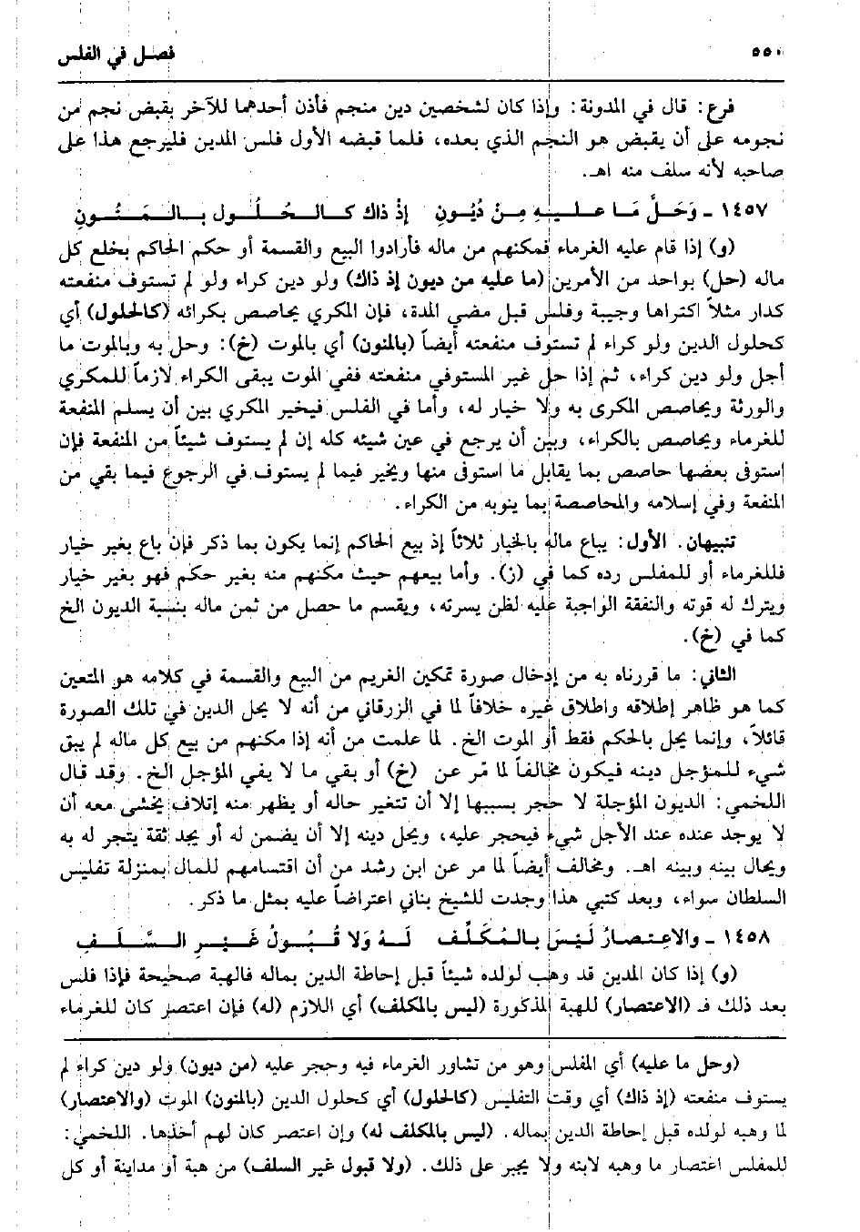فرع: قَالَ فِي الْمُدَوَّنَة: وَإِذا كَانَ لشخصين دين منجم فَأذن أَحدهمَا للْآخر بِقَبض نجم من نجومه على أَن يقبض هُوَ النَّجْم الَّذِي بعده، فَلَمَّا قَبضه الأول فلس الْمَدِين فَليرْجع هَذَا على صَاحبه لِأَنَّهُ سلف مِنْهُ اه. وَحَلَّ مَا عليهِ مِنْ دُيُونِ إذْ ذَاك كالحُلُول بالمَنُونِ (و) إِذا قَامَ عَلَيْهِ الْغُرَمَاء فمكنهم من مَاله فأرادوا البيع وَالْقِسْمَة أَو حكم الْحَاكِم بخلع كل مَاله (حل) بِوَاحِد من الْأَمريْنِ (مَا عَلَيْهِ من دُيُون إِذْ ذَاك) وَلَو دين كِرَاء وَلَو لم تستوف منفعَته كدار مثلا اكتراها وجيبة وفلس قبل مُضِيّ الْمدَّة، فَإِن الْمكْرِي يحاصص بكرائه (كالحلول) أَي كحلول الدّين وَلَو كِرَاء لم تستوف منفعَته أَيْضا (بالمنون) أَي بِالْمَوْتِ (خَ) : وَحل بِهِ وبالموت مَا أجل وَلَو دين كِرَاء، ثمَّ إِذا حل غير المستوفي منفعَته فَفِي الْمَوْت يبْقى الْكِرَاء لَازِما للمكري وَالْوَرَثَة ويحاصص المكرى بِهِ وَلَا خِيَار لَهُ، وَأما فِي الْفلس فَيُخَير الْمكْرِي بَين أَن يسلم الْمَنْفَعَة للْغُرَمَاء ويحاصص بالكراء، وَبَين أَن يرجع فِي عين شَيْئه كُله إِن لم يسْتَوْف شَيْئا من الْمَنْفَعَة فَإِن استوفى بَعْضهَا حاصص بِمَا يُقَابل مَا استوفى مِنْهَا وَيُخَير فِيمَا لم يسْتَوْف فِي الرُّجُوع فِيمَا بَقِي من الْمَنْفَعَة وَفِي إِسْلَامه والمحاصصة بِمَا ينوبه من الْكِرَاء. تَنْبِيهَانِ. الأول: يُبَاع مَاله بِالْخِيَارِ ثَلَاثًا إِذْ بيع الْحَاكِم إِنَّمَا يكون بِمَا ذكر فَإِن بَاعَ بِغَيْر خِيَار فللغرماء أَو للْمُفلس رده كَمَا فِي (ز) . وَأما بيعهم حَيْثُ مكنهم مِنْهُ بِغَيْر حكم فَهُوَ بِغَيْر خِيَار وَيتْرك لَهُ قوته وَالنَّفقَة الْوَاجِبَة عَلَيْهِ لظن يسرته، وَيقسم مَا حصل من ثمن مَاله بِنِسْبَة الدُّيُون الخ كَمَا فِي (خَ) . الثَّانِي: مَا قَرَّرْنَاهُ بِهِ من إِدْخَال صُورَة تَمْكِين الْغَرِيم من البيع وَالْقِسْمَة فِي كَلَامه هُوَ الْمُتَعَيّن كَمَا هُوَ ظَاهر إِطْلَاقه واطلاق غَيره خلافًا لما فِي الزّرْقَانِيّ من أَنه لَا يحل الدّين فِي تِلْكَ الصُّورَة قَائِلا، وَإِنَّمَا يحل بالحكم فَقَط أَو الْمَوْت الخ. لما علمت من أَنه إِذا مكنهم من بيع كل مَاله لم يبْق شَيْء للمؤجل دينه فَيكون مُخَالفا لما مّر عَن (خَ) أَو بَقِي مَا لَا يَفِي الْمُؤَجل الخ. وَقد قَالَ اللَّخْمِيّ: الدُّيُون المؤجلة لَا حجر بِسَبَبِهَا إِلَّا أَن تَتَغَيَّر حَاله أَو يظْهر مِنْهُ إِتْلَاف يخْشَى مَعَه أَن لَا يُوجد عِنْده عِنْد الْأَجَل شَيْء فيحجر عَلَيْهِ، وَيحل دينه إِلَّا أَن يضمن لَهُ أَو يجد ثِقَة يتجر لَهُ بِهِ ويحال بَينه وَبَينه اه. ومخالف أَيْضا لما مر عَن ابْن رشد من أَن اقتسامهم لِلْمَالِ بِمَنْزِلَة تفليس السُّلْطَان سَوَاء، وَبعد كتبي هَذَا وجدت للشَّيْخ بناني اعتراضاً عَلَيْهِ بِمثل مَا ذكر. والاعِتصارُ لَيْسَ بالمُكَلِّف لَهُ وَلا قُبُولُ غَيْرِ السَّلَفِ (و) إِذا كَانَ الْمَدِين قد وهب لوَلَده شَيْئا قبل إحاطة الدّين بِمَالِه فالهبة صَحِيحَة فَإِذا فلس بعد ذَلِك ف (الاعتصار) للهبة الْمَذْكُورَة (لَيْسَ بالمكلف) أَي اللَّازِم (لَهُ) فَإِن اعتصر كَانَ للْغُرَمَاء